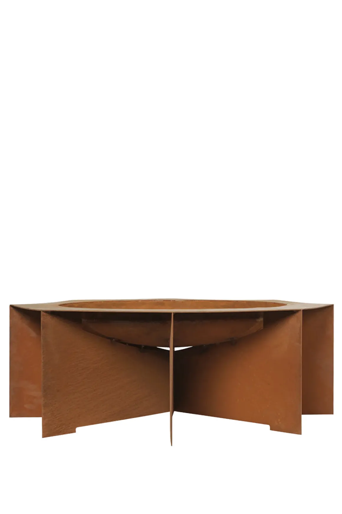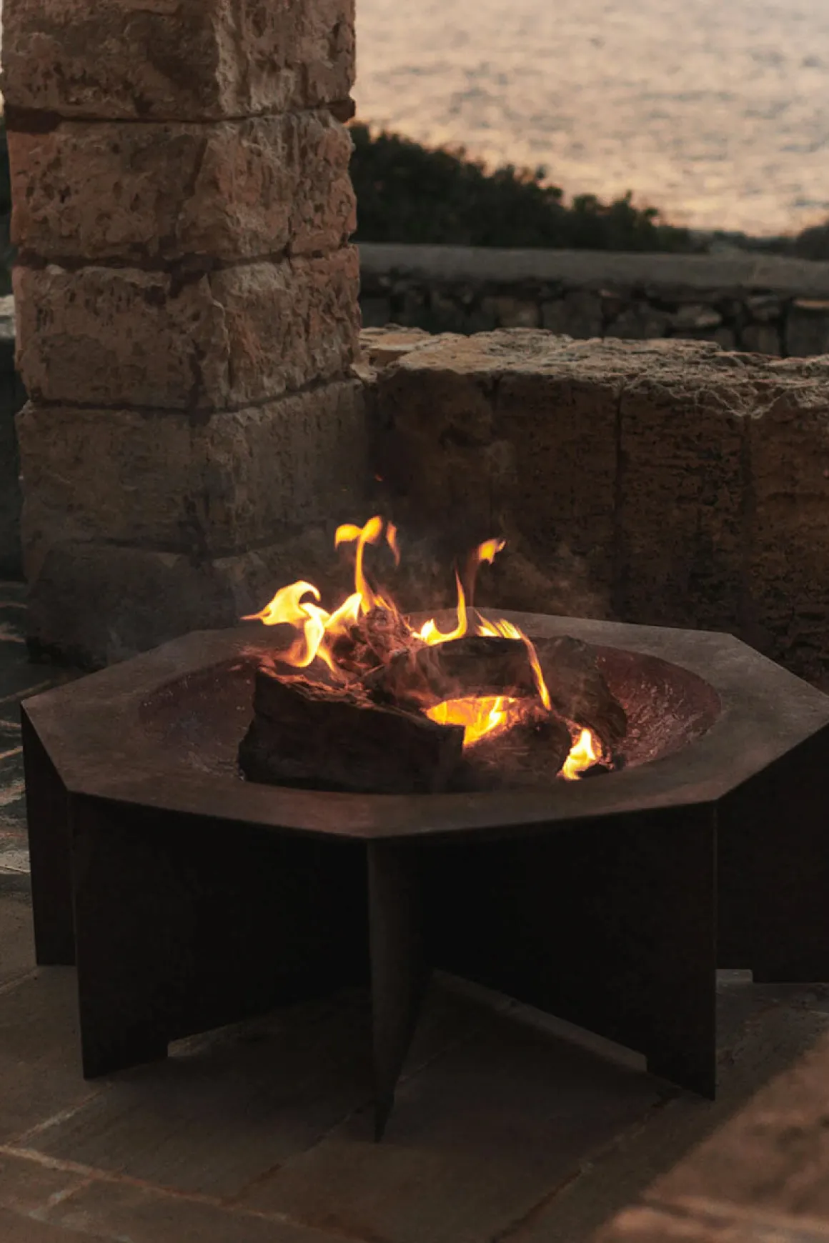 Ferm Living x Utzon – Can Lis-samarbeidet er inspirert av arkitekt Jørn Utzons familiehjem på Mallorca, der de naturlige omgivelsene smelter sammen med designelementer som gjenspeiler hans særegne filosofi. Otte bålpanne viderefører Utzons arkitektoniske prinsipper om enkelhet, funksjonalitet og nærhet til naturen i et gjennomført utemøbel. Den åttekantede formen har gitt bålpannen navnet «Otte», etter det danske ordet for «åtte». Bålpannen er laget av cortenstål, et robust materiale som tåler vær og vind, og som med tiden utvikler en vakker, rustfarget patina som forsterker produktets skulpturelle og organiske uttrykk.