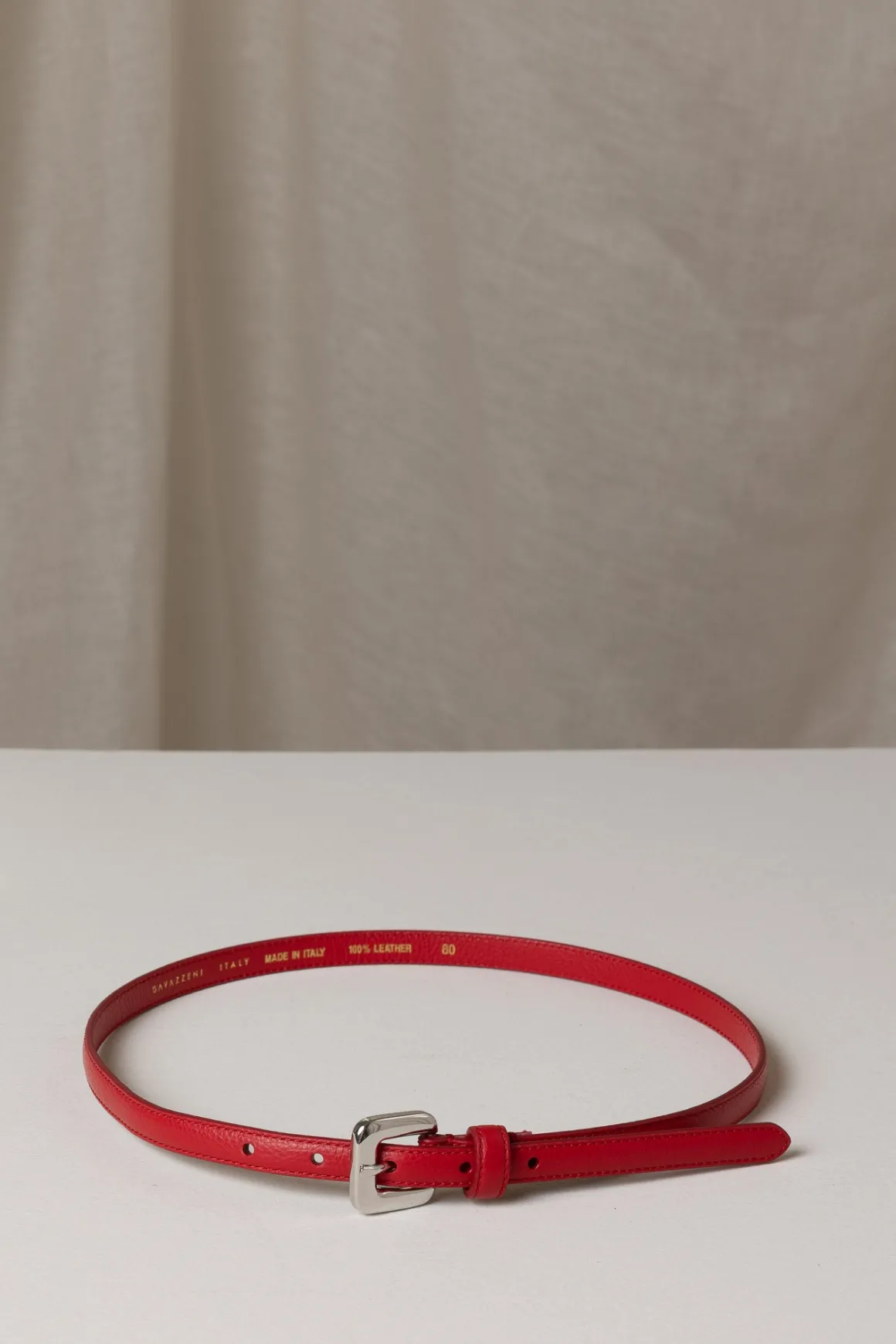 Smalt skinnbelte med sølvfarget spenne fra italienske Sergio Gavazzeni i en nydelig rubinrød farge. Sergio Gavazzeni er kjent for sin høye kvalitet, og håndverket deres skiller seg ut ved å gi klassiske design en ny vri – noe som tydelig kommer frem i dette beltet. Gloriosa er allsidig og kan brukes både til jeans eller for å fremheve midjen over en kjole eller jakke. Dette er en investering som varer år etter år!