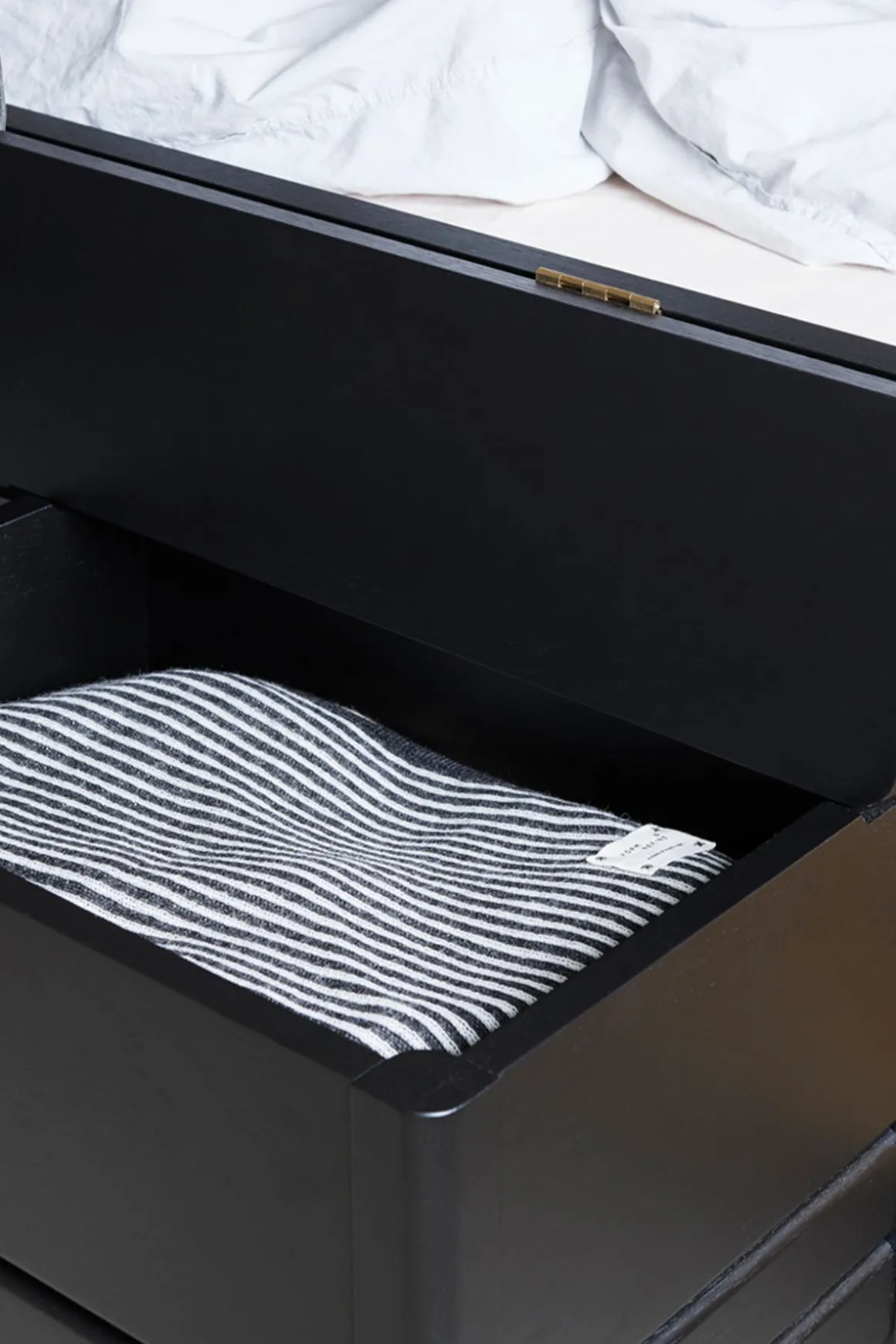 A Line benken fra Form u0026amp; Refine er både allsidig og praktisk. Designet av duoen Herman Studio, som kjennetegnes av balanserte kombinasjoner mellom funksjonelt og overraskende design. Benken har en innovativ konstruksjon som gir deg haugevis av oppbevaringsmuligheter. Setet kan løftes opp ved hjelp av et skinnhåndtak, og avslører to oppbevaringsrom inni benken. Perfekt til sko og klær i gangen, sengetøy og håndklær på soverommet, eller puter og pledd i stuen. Det tidløse designet i sort eik vil skli rett inn i alle interiørstiler.