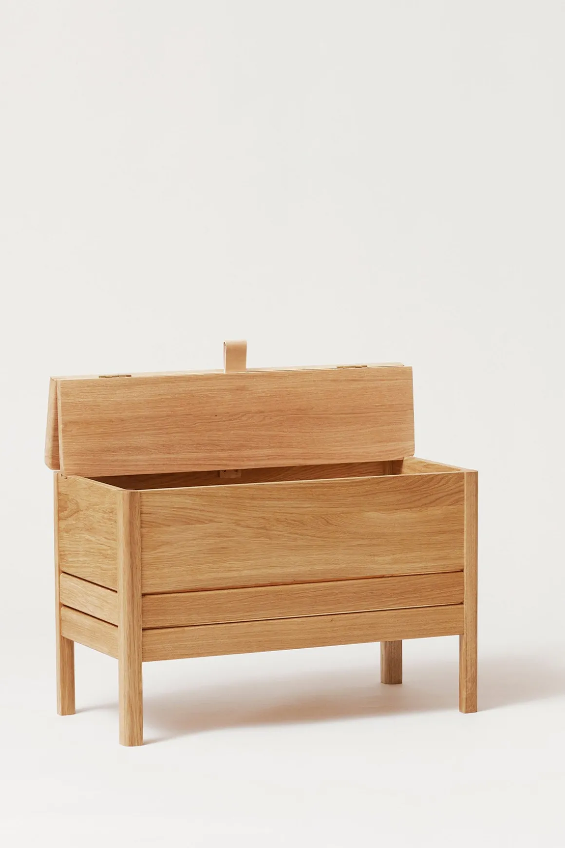 Har du sittet og siklet på den fantastisk flotte A Line Storage benken fra Form u0026amp; Refine, men har litt for liten plass? Nå har vi fått den inn i en litt mindre versjon som er minst like fin og fortsatt allsidig og praktisk. Benken er designet av duoen Herman Studio, som kjennetegnes av balanserte kombinasjoner mellom funksjonelt og overraskende design. A Line Storage Bench har en innovativ konstruksjon som gir deg haugevis av oppbevaringsmuligheter. Setet kan løftes opp ved hjelp av et skinnhåndtak, og avslører et romslig oppbevaringsrom inni benken. Perfekt til sko og klær i gangen, sengetøy og håndklær på soverommet, eller puter og pledd i stuen. Det tidløse designet av oljet eik vil skli rett inn i alle interiørstiler.