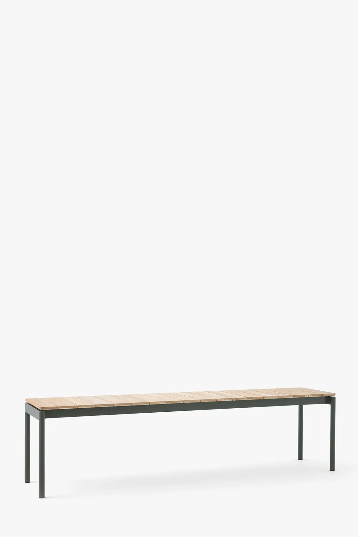 Ville utebenk fra u0026amp;Tradition, designet av den norske designduoen Andersen u0026amp; Voll. Benken er laget av teak og pulverlakkert stål som gjør det perfekt til utebruk. Metallet kuttes, formes, sveises og deretter pulverlakkeres, mens treverket freses i form og deretter slipes og forblir ubehandlet, men glatt. Benken kan like gjerne kombineres med andre typer utemøbler, eller man kan komplettere med stoler, bord og sitteputer fra samme serie. Ville kommer i en sort eller grønn utgave.
