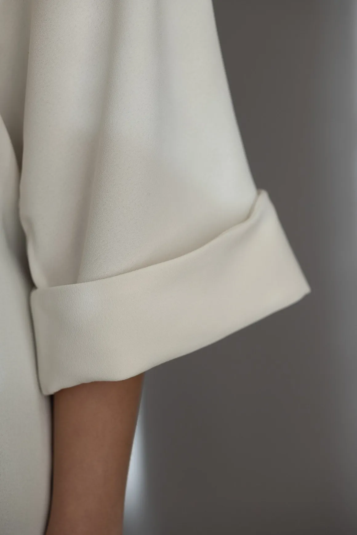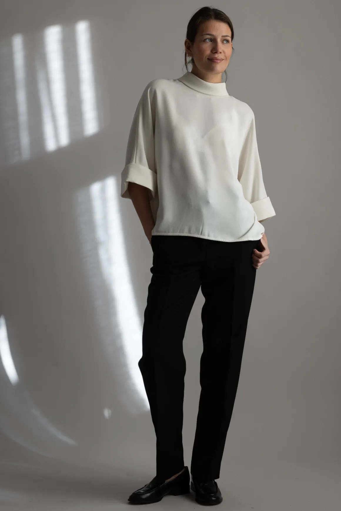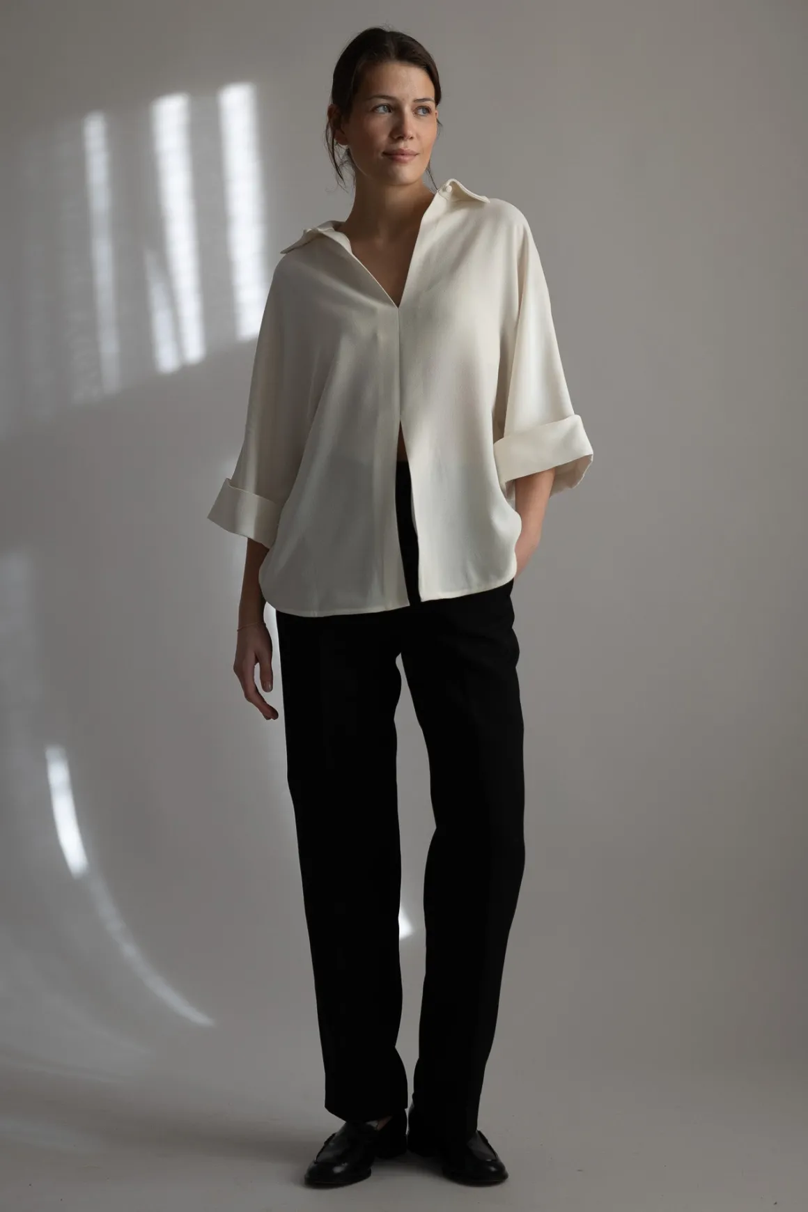 Signaturblusen Bailee Ivory fra MKDT er et tidløst plagg som kombinerer stil og komfort. Blusen er produsert i en behagelig crepe georgette-kvalitet som gir den en lett og luftig følelse. Det unike med Bailee er at den kan brukes på begge sider, slik at du kan velge knappelukking foran eller bak, avhengig av hva som passer din stil for dagen. Med trekvart ermelengde og elegante brett, er denne blusen både sofistikert og allsidig. Den passer perfekt til både sorte dressbukser eller jeans, alt etter hvilken look du ønsker å oppnå. En sikker vinner, enten det er til hverdagsbruk eller til festlige anledninger.