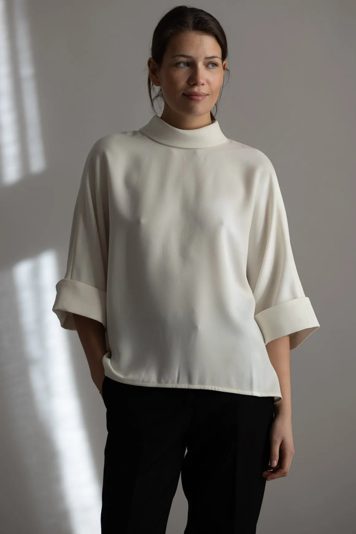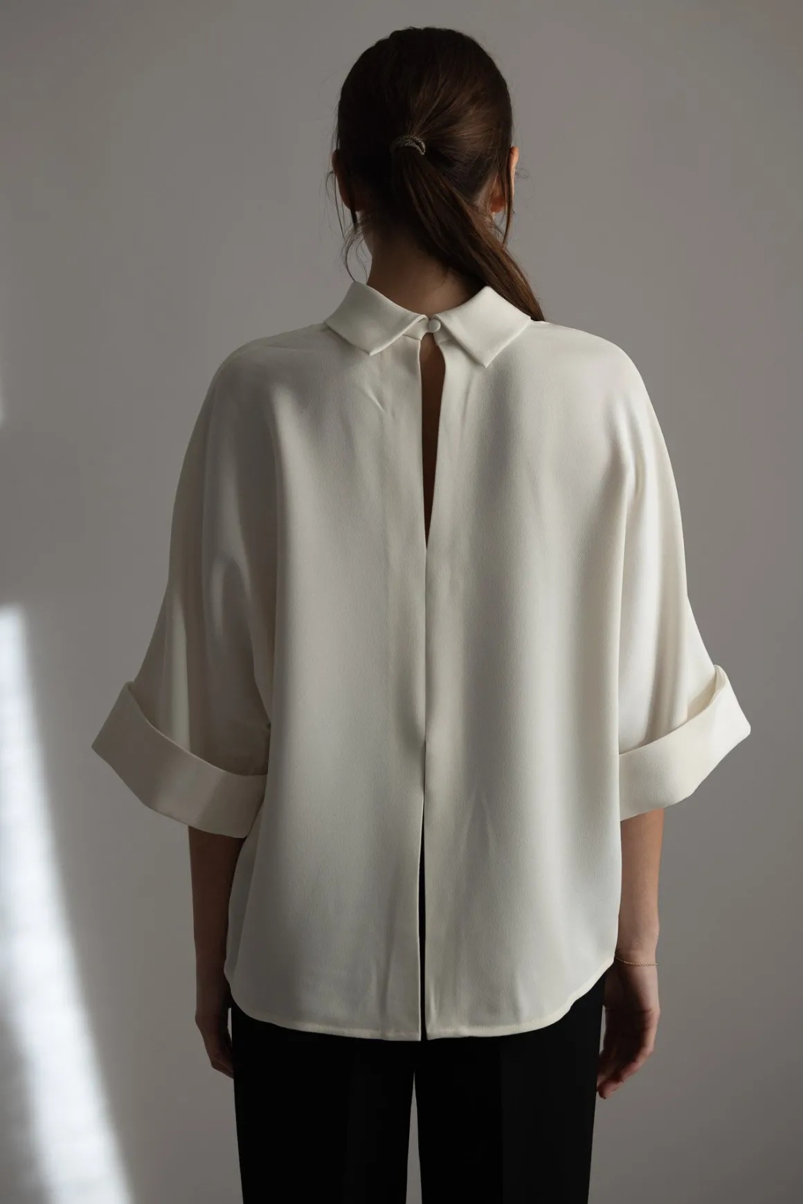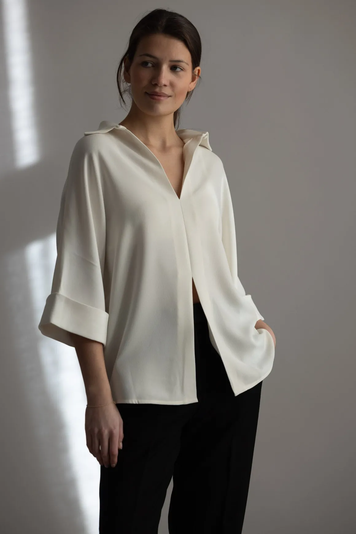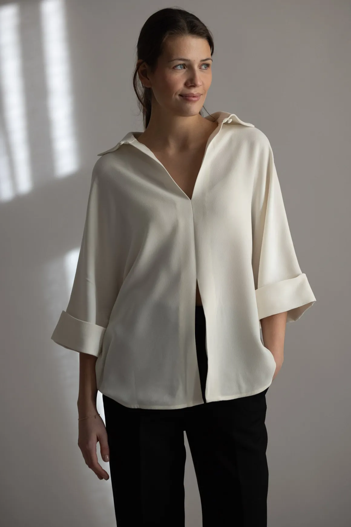 Signaturblusen Bailee Ivory fra MKDT er et tidløst plagg som kombinerer stil og komfort. Blusen er produsert i en behagelig crepe georgette-kvalitet som gir den en lett og luftig følelse. Det unike med Bailee er at den kan brukes på begge sider, slik at du kan velge knappelukking foran eller bak, avhengig av hva som passer din stil for dagen. Med trekvart ermelengde og elegante brett, er denne blusen både sofistikert og allsidig. Den passer perfekt til både sorte dressbukser eller jeans, alt etter hvilken look du ønsker å oppnå. En sikker vinner, enten det er til hverdagsbruk eller til festlige anledninger.