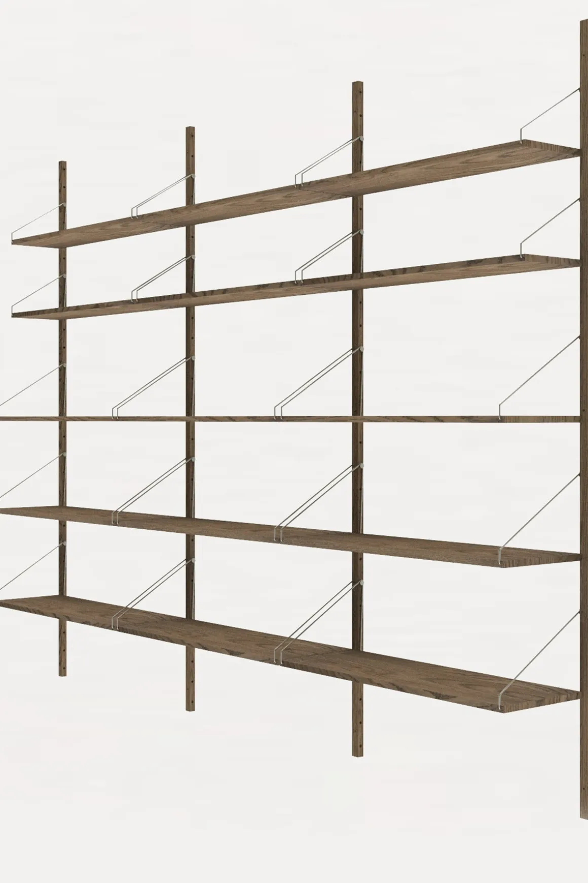 Velkjente Library Shelf komplett hyllesystem fra Frama i vakker, mørkoljet, heltre eik. Karakterisert av et modulært system og festet med solide stålskruer-og braketter på solide skinner i eik, kan hyllene enkelt plasseres og styles om på en rekke måter. Dette allsidige hyllesystemet egner seg til ethvert rom med sitt minimalistiske og stramme design, og kombinasjonen av rustfritt stål og lun, mørkoljet eik passer perfekt inn i de skandinaviske hjem. Library Shelf er enkel å montere, og hver enkelt hylle kan holde ca. 15 kg (avhengig av veggmateriale og montering). Systemet er svært fleksibelt, og hver hylle kan flyttes rundt og tilpasses med tilleggsprodukter fra samme serie.