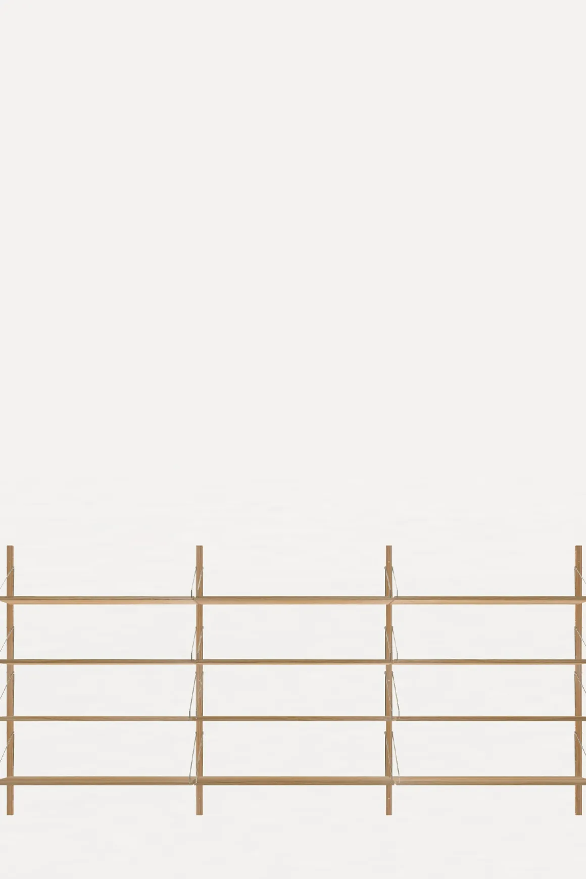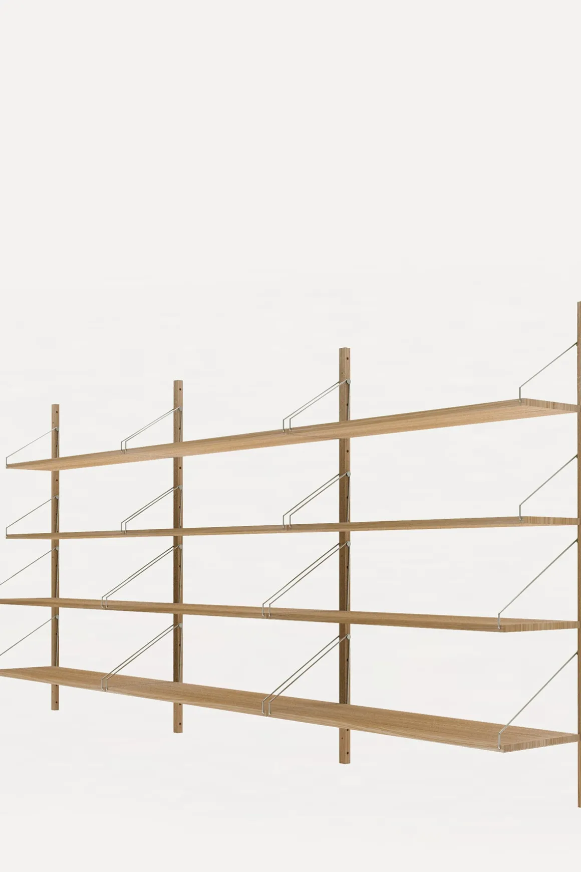 Velkjente Library Shelf komplett hyllesystem fra Frama i naturlig, oljet, heltre eik. Karakterisert av et modulært system og festet med solide stålskruer-og braketter på solide skinner i eik, kan hyllene enkelt plasseres og styles om på en rekke måter. Dette allsidige hyllesystemet egner seg til ethvert rom med sitt minimalistiske og stramme design, og kombinasjonen av rustfritt stål og lun, oljet eik passer perfekt inn i de skandinaviske hjem. Library Shelf er enkel å montere, og hver enkelt hylle kan holde ca. 15 kg (avhengig av veggmateriale og montering). Systemet er svært fleksibelt, og hver hylle kan flyttes rundt og tilpasses med tilleggsprodukter fra samme serie.