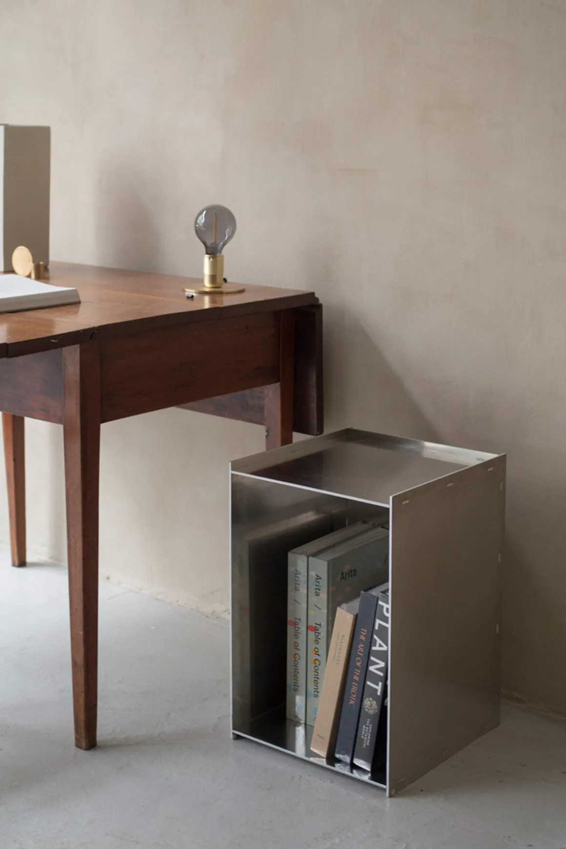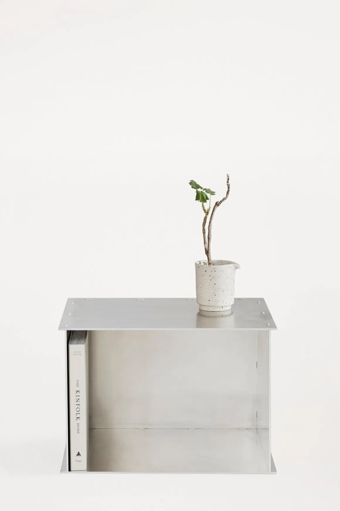 Rivet oppbevaringsboks/sidebord i ubehandlet aluminium fra Frama. Boksen er en del av Rivet-serien, basert på tradisjonelle håndverksteknikker. Produktene er laget av laserkuttede råaluminiumsplater som deretter blir sammenføyd for hånd ved hjelp av en hammer. Boksen er enkel og allsidig og kan brukes som sidebord, nattbord eller til oppbevaring og ustilling av dine favorittbøker for eksempel. Boksen kan brukes både stående og liggende og har et rått og industrielt uttrykk som får en vakker patina etter bruk.
