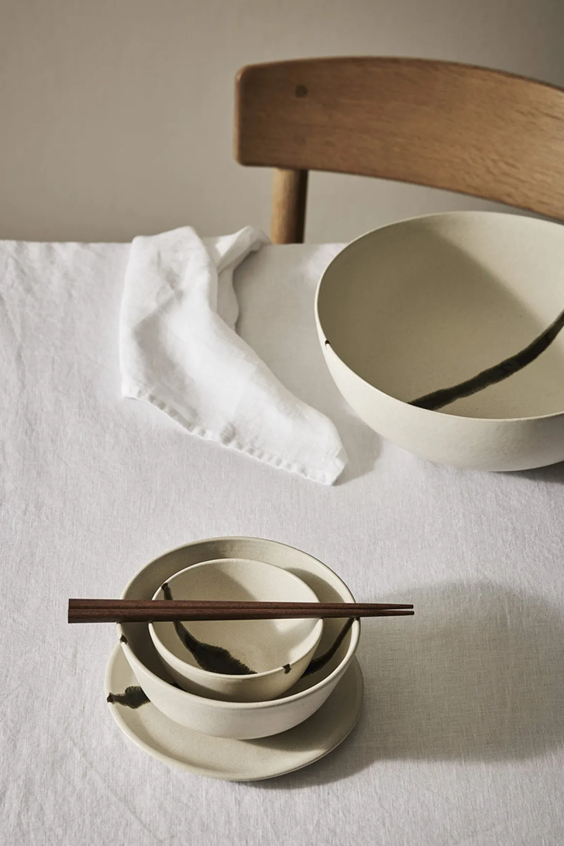 Salatbollen fra Tell Me More er en del av Toledo-serien, laget i slitesterkt steingods med en myk, hvit glasur. En håndmalt mørk linje løper gjennom bollen og tilfører et kunstnerisk preg som gjør hver bolle unik. Det tidløse designet gjør den like fin til servering av salater og frukt som et dekorativt innslag på bordet.