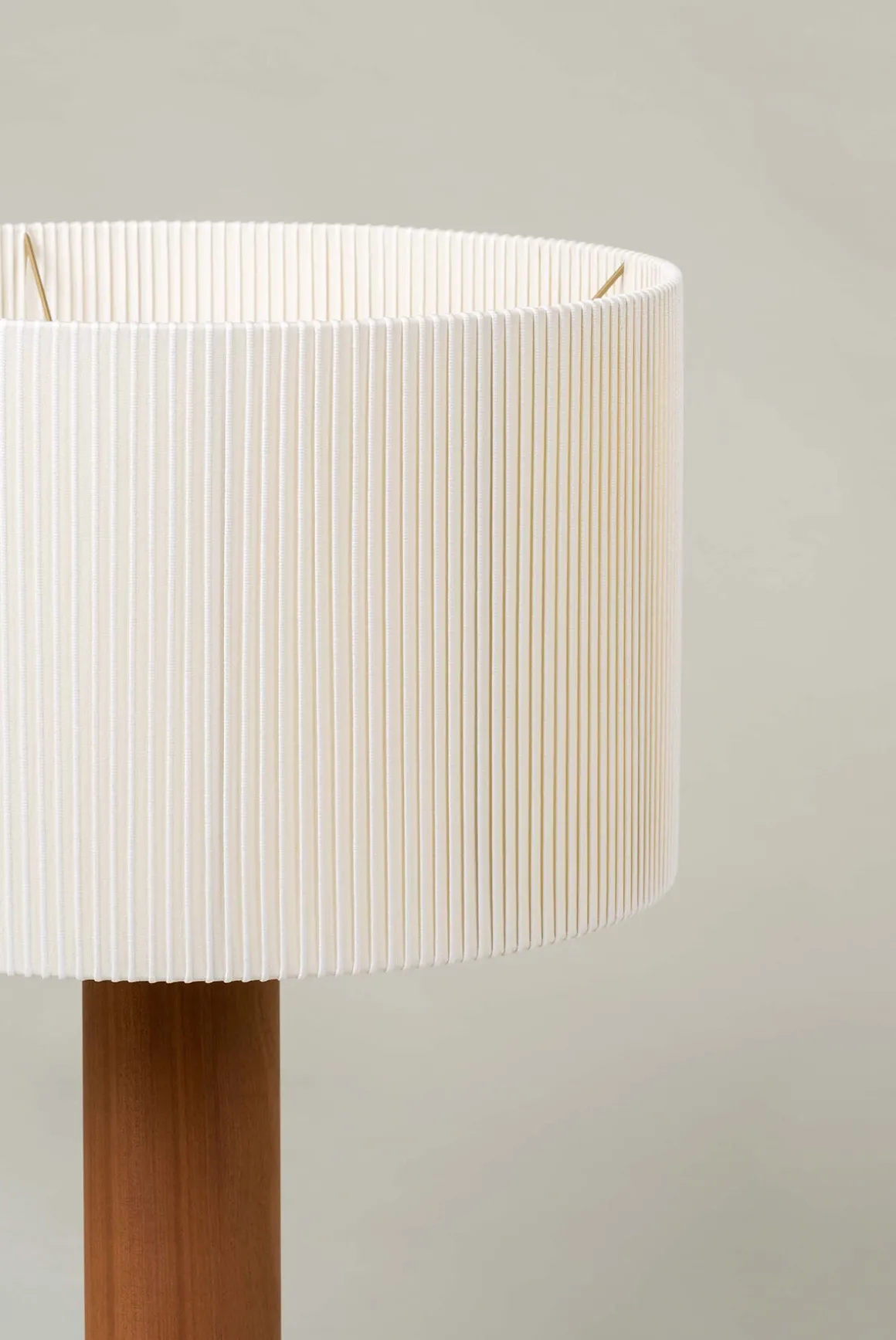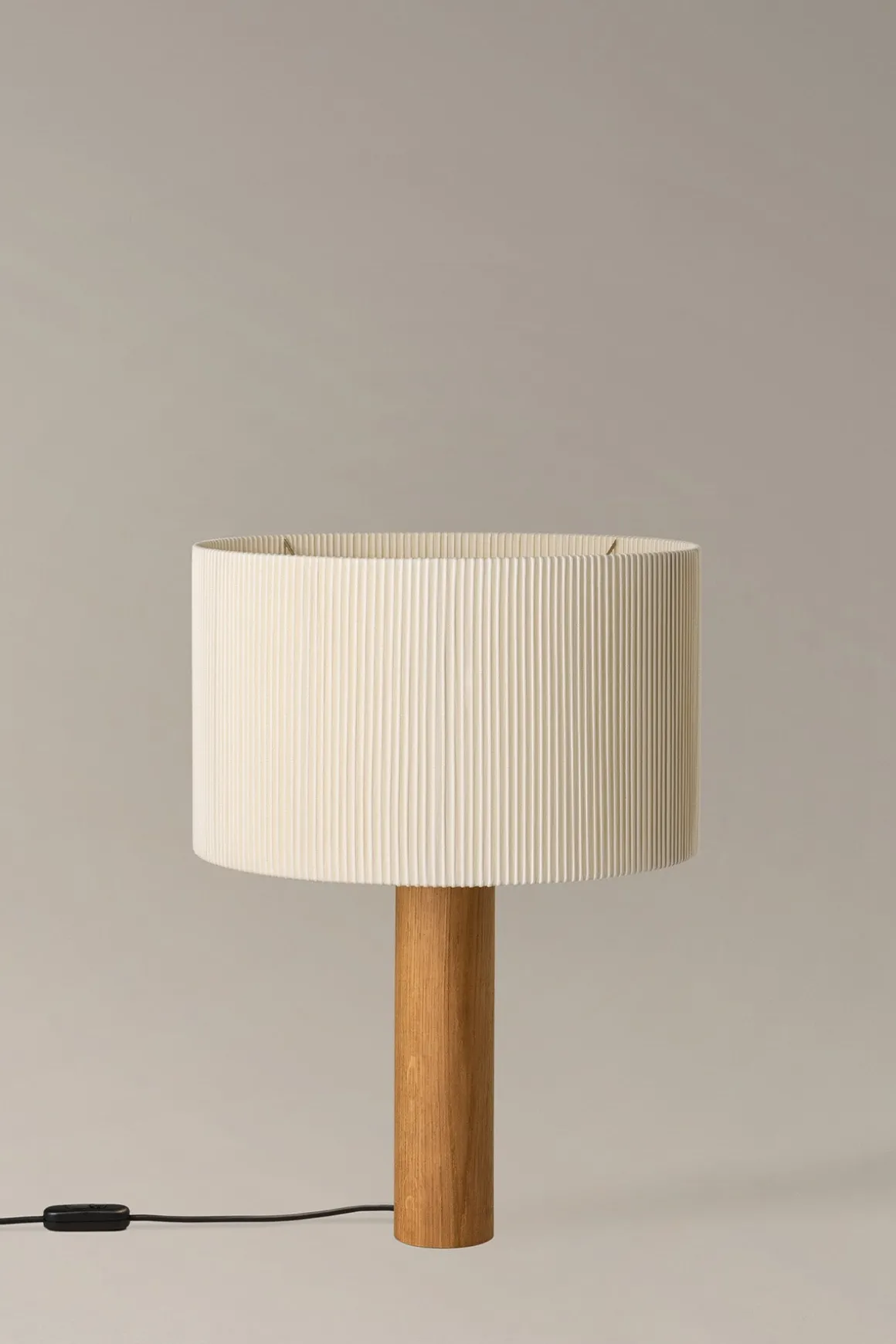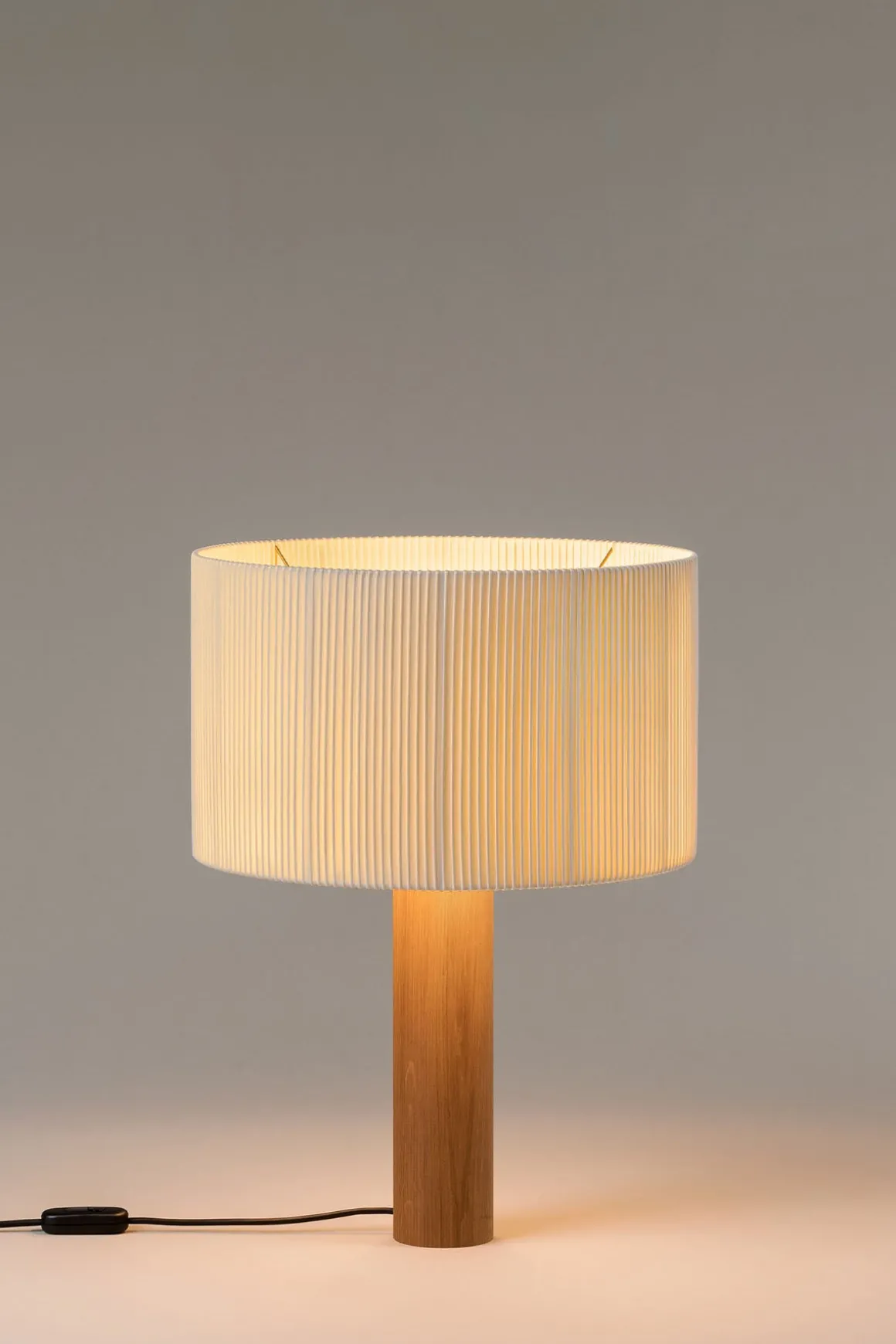 Bordlampe designet av arkitekten Antoni de Moragas Gallissà for Santa u0026amp; Cole. Lampen ble først designet i 1957 og ble flittig brukt på hans eget kontor. Lampefoten er en solid tresylinder laget av sapellitre som er et løvtre fra mahognifamilien i Vest Afrika. Sokkelen holder tre ledpærer og lampeskjermen rundt er stor og sirkulær, laget av bomullsbånd i en dus naturfarge som gir et mykt og behagelig lys. Lampen har en 2,25 m lang, sort ledning med dimbar bryter som gjør at du kan justere lysstyrken slik du ønsker. Passer perfekt i stuen på et sidebord eller konsollbord.