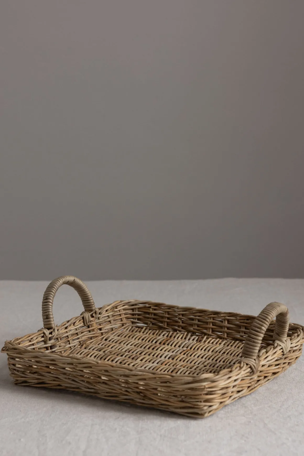 Flette brett i rotting fra Bruka, ideelt til servering eller som en base for større dekorative oppstillinger. Det solide flettverket og de praktiske håndtakene gjør det enkelt å flytte, samtidig som det tilfører varme til interiøret. Perfekt til stuen eller spisebordet der du vil samle flere elementer. Kommer i tre forskjellige størrelser, dette er det største.