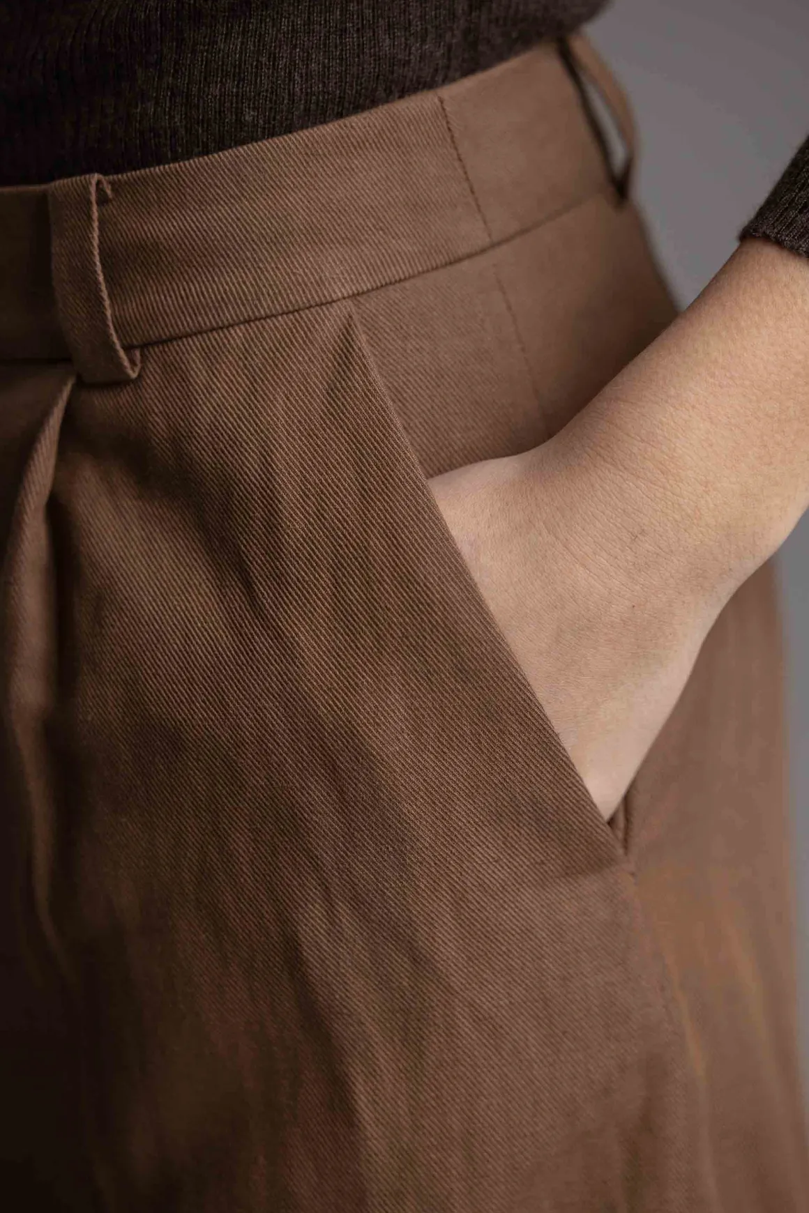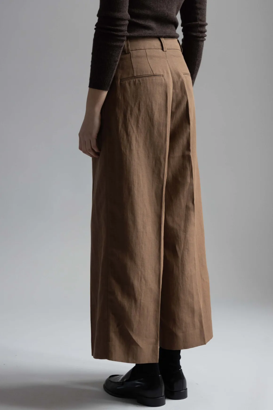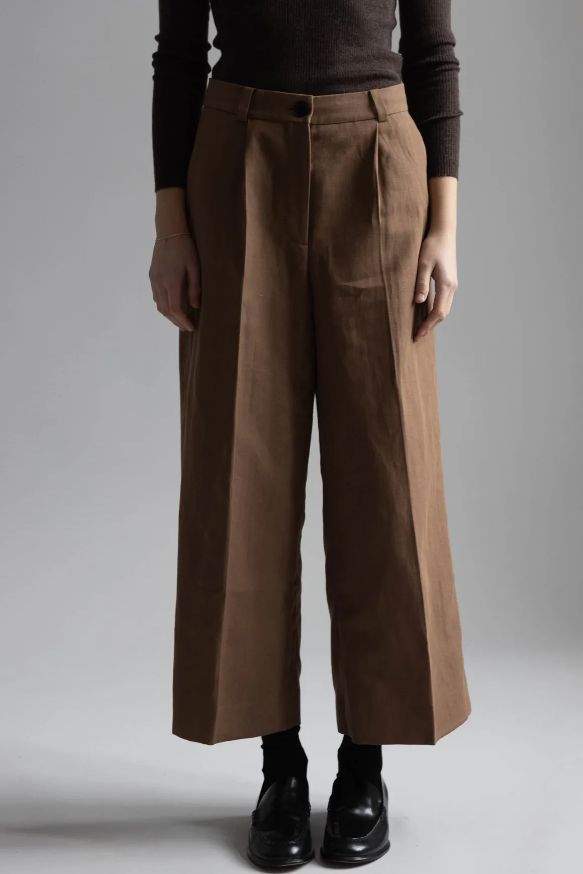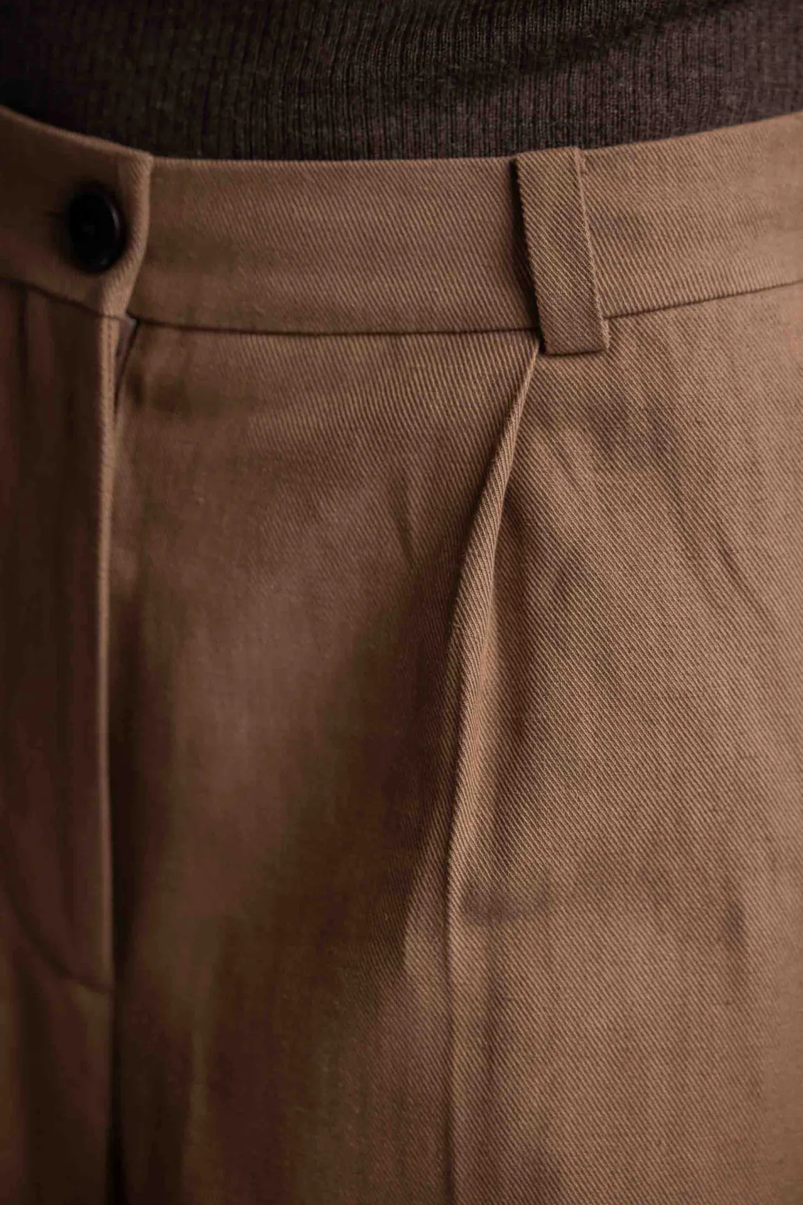 Emmeri Trousers fra Skall er et par stilrene, herreinspirerte bukser med en avslappet og moderne passform. Disse cropped buksene kombinerer komfort og eleganse, med en mid-low waist og delikate detaljer som pressede linjer foran og bak. Buksen har en synlig knapp i linningen, sidelommer og to enkeltinnfelte lommer på baksiden, noe som gir et sofistikert uttrykk med praktiske elementer.
