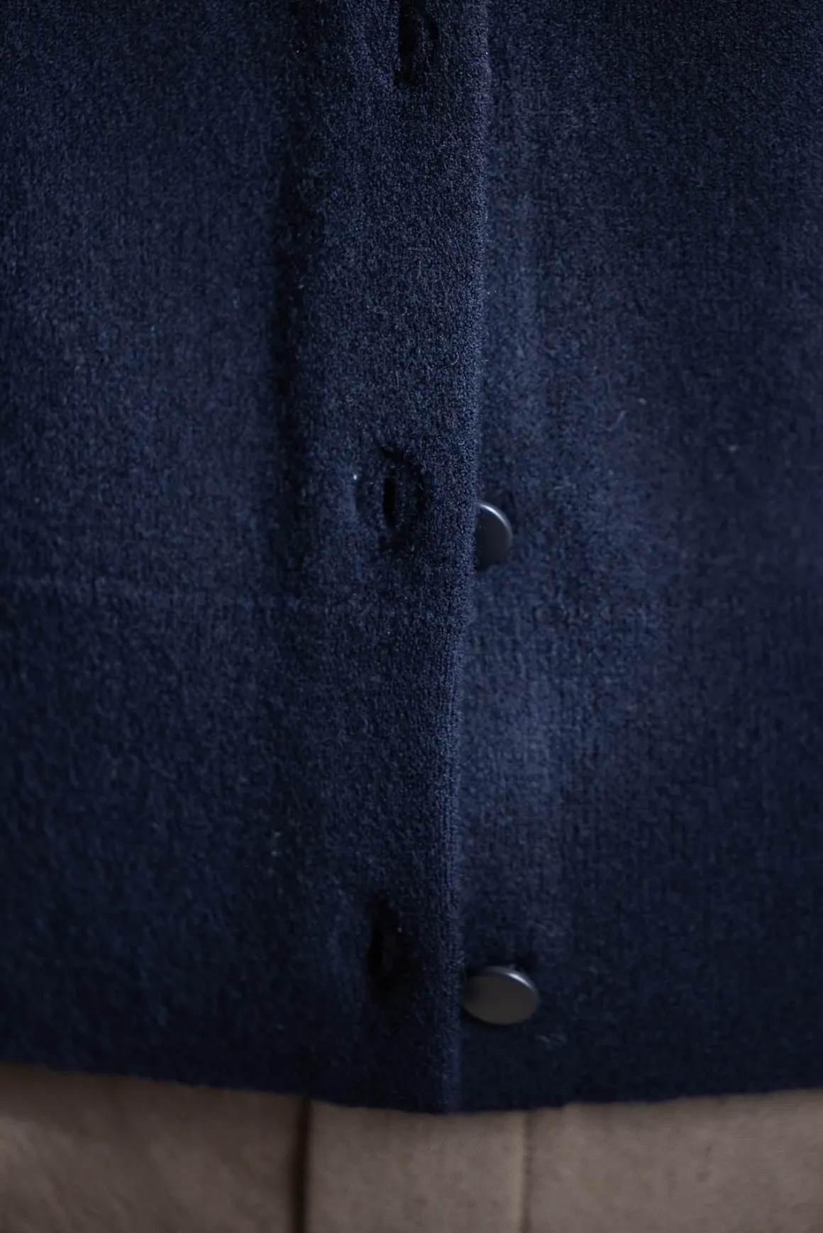 Cardigan fra Vince i en kompakt og myk ullblanding med kashmir. Den har en klassisk, rett passform med rund hals og dekorative shank-knapper foran. En liten kontrastdetalj i nakken – en halvmåneformet innfelling i hvitt – gir et diskret fargeinnslag og en uventet vri. Ribbestrikkede kanter rammer inn uttrykket, og materialet gir både komfort og struktur.