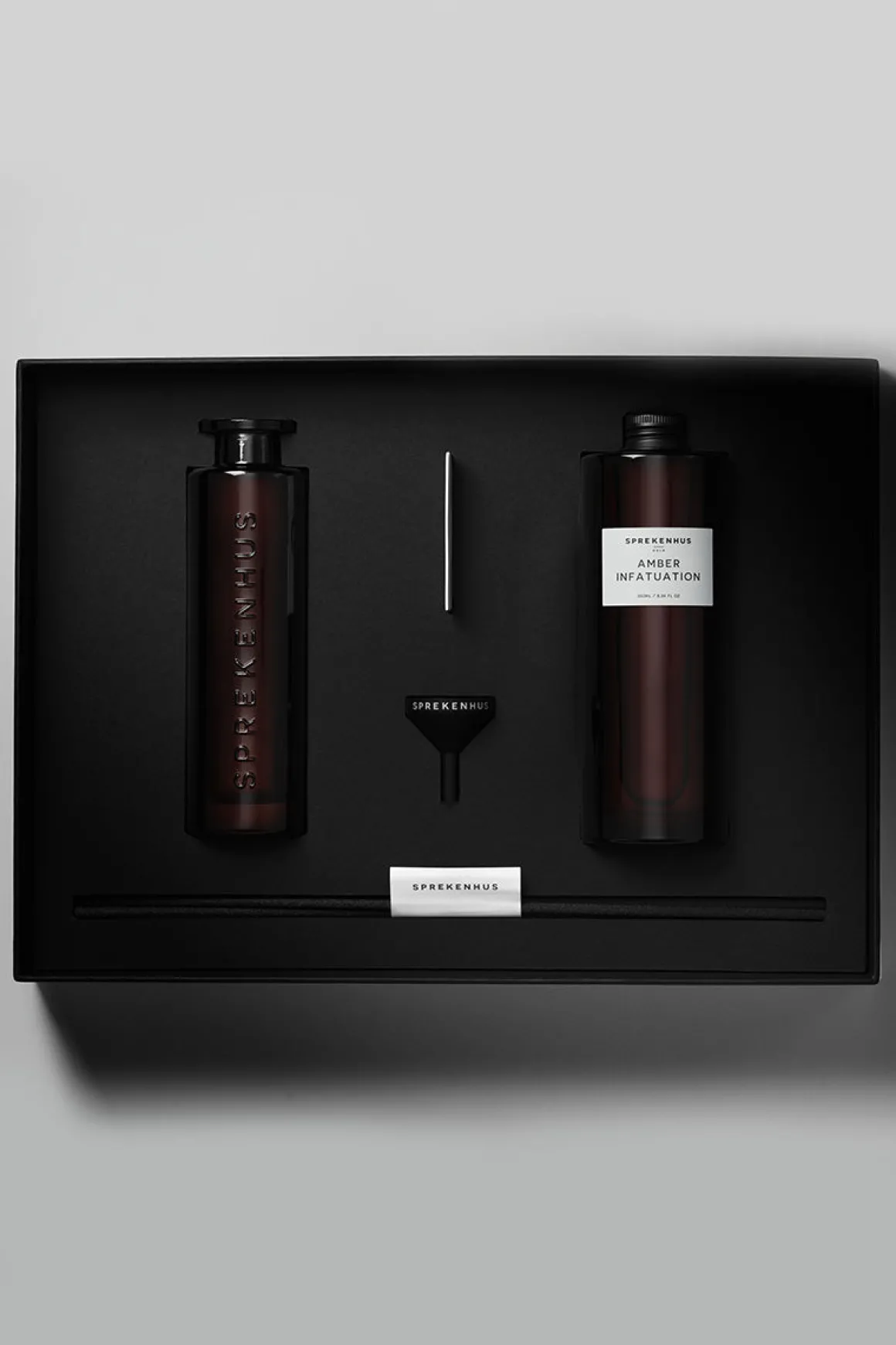 Duftpinner fra norske Sprekenhus. Settet inkluderer en refillbar glassflaske, duftpinner og en påfyllingsflaske med duftolje. Amber Infatuation er en duft som fanger essensen av Sprekenhus. Den åpner med krydrede og friske toppnoter av svart pepper, siciliansk bergamot og vill koriander, før den utvikler seg til et hjerte av hvit lavendel, tobakkblader og hedione. Basen byr på en varm og varig avslutning med gyllen patchouli, tonga-vaniljebønner og musk, som gir duften en dypt forførende karakter.