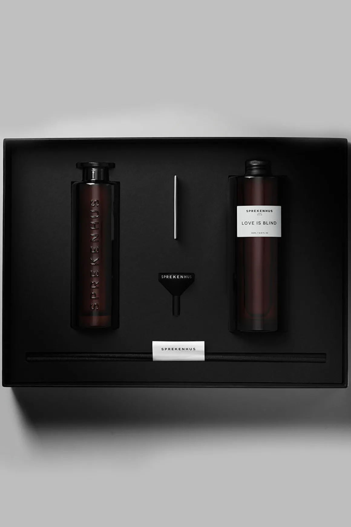 Duftpinner fra norske Sprekenhus. Settet inkluderer en refillbar glassflaske, duftpinner og en påfyllingsflaske med duftolje. Love Is Blind er en duft som skaper en stemning av inspirasjon og kjærlighet. Med friske toppnoter av bergamot, grapefrukt og appelsin, åpner duften med en lys og energisk karakter. I hjertet finner du krydrede og blomstrende noter av rosa pepper, patchouli, geranium og neroli, som gir en varm og sofistikert dimensjon. Til slutt kommer den dype og jordnære basen med vetiver, sedertre, mose og musk, som etterlater et varig og balansert inntrykk.