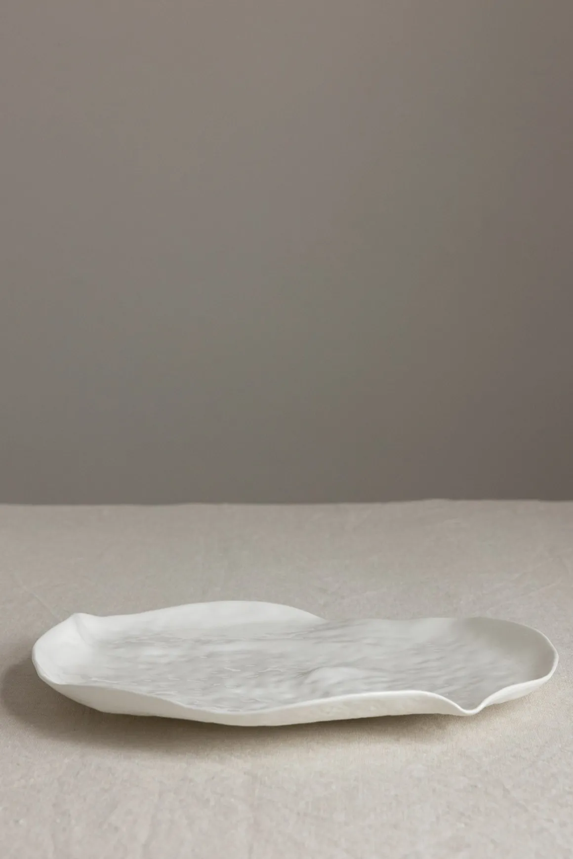 Serveringsfatet i porselen fra Serax, designet av Roos van de Velde, fanger essensen av naturens uregelmessige rytmer. Den organiske formen er inspirert av havets flo og fjære, og hver kurve på fatet uttrykker en følelse av perfekt ufullkommenhet. Gjennom samarbeidet med Serax har Roos van de Velde skapt et kunstnerisk stykke som tilfører borddekkingen både karakter og en subtil eleganse. Det hvite glaserte porselenet gjør fatet til et allsidig element, ideelt for servering eller som et dekorativt innslag i hjemmet. Kan også brukes som middagstallerken.