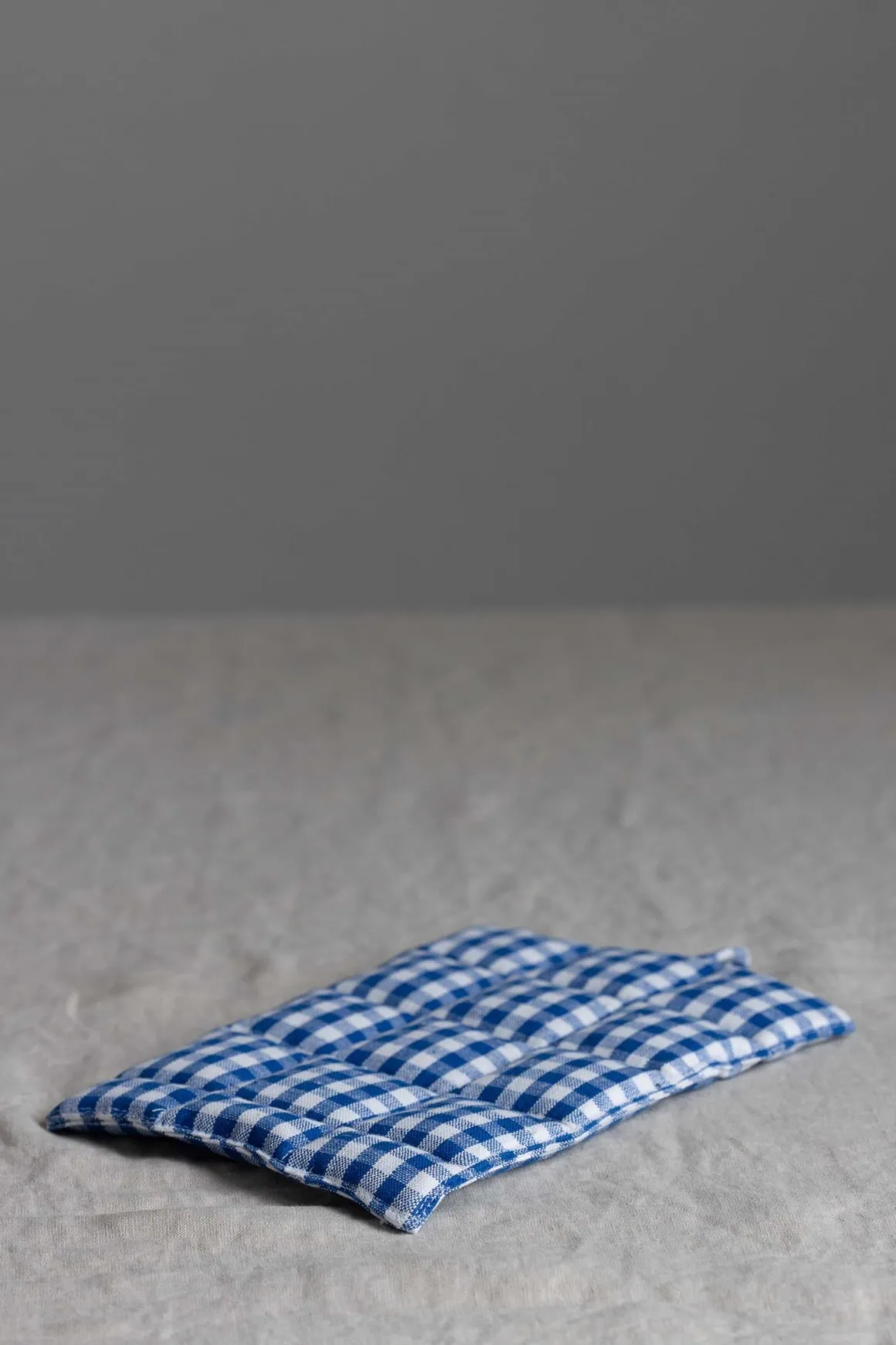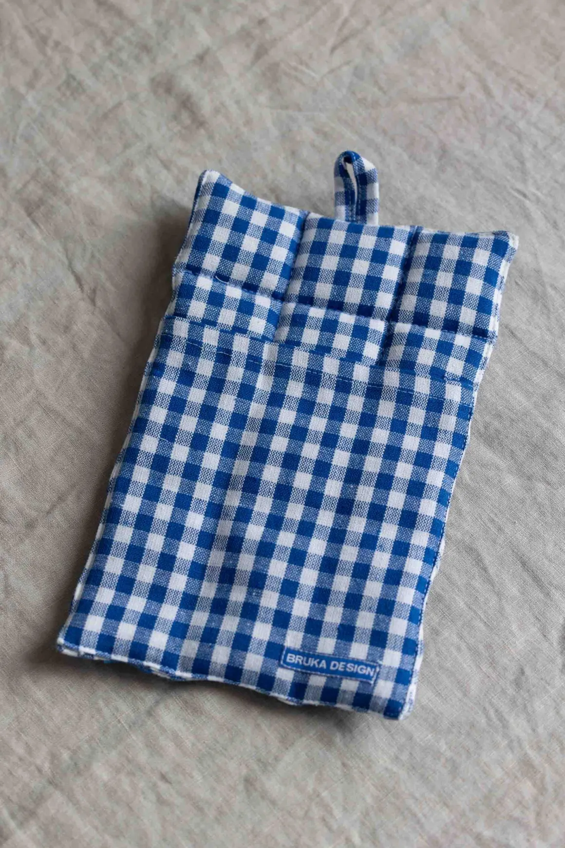 Praktisk gryteklut med hvite og blå ruter fra svenske Bruka Design. Praktisk lomme på baksiden slik at du får et godt grep på grytene, og hank på toppen så den kan henges opp når den ikke er i bruk.