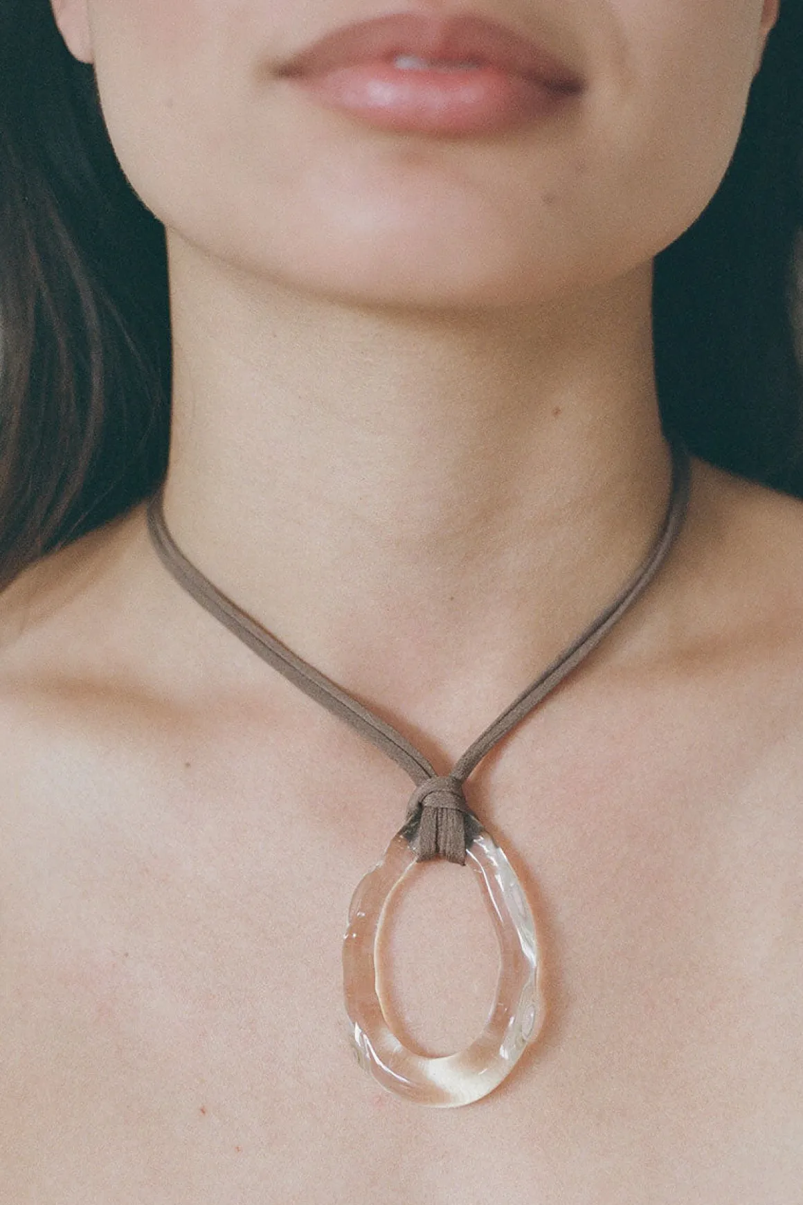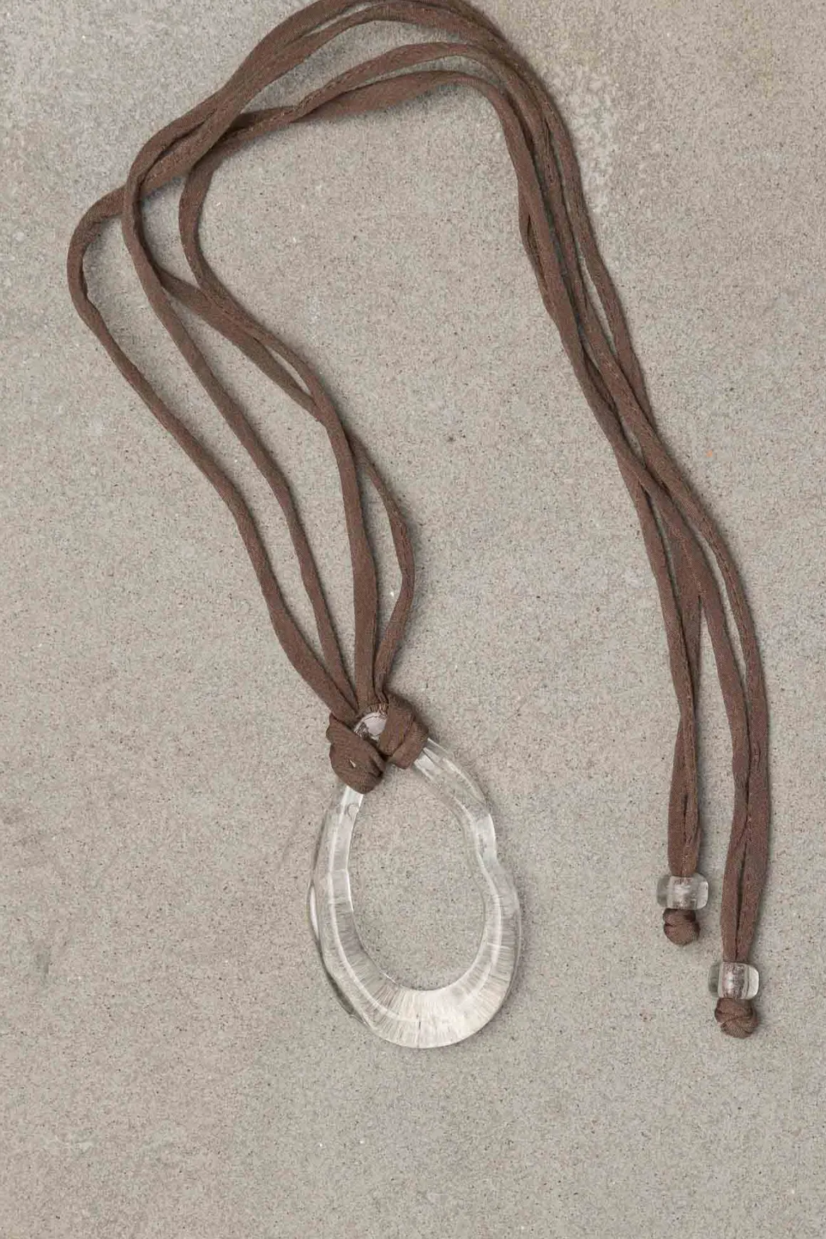 Galatea Terra er et halskjede med et anheng i klart, munnblåst glass, festet til en dobbel silkereim i en varm brun nyanse. Reimen, laget av lokalt innhentet og farget silke, kan knytes for justerbar lengde og bæres som en choker eller i lengre stil. Håndlaget med små variasjoner, har hvert smykke sitt eget unike og personlige preg. Glasset bør behandles med forsiktighet for å bevare sin naturlige skjønnhet.