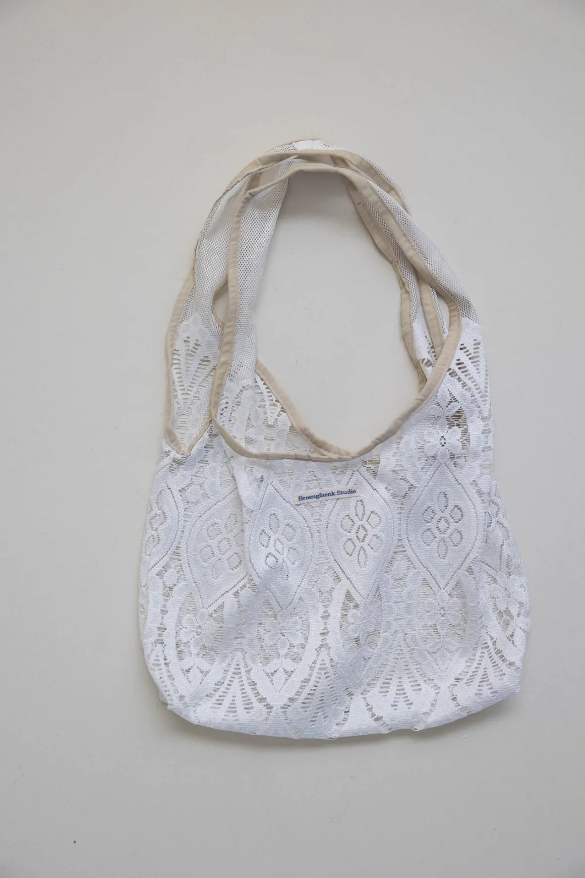 Unikt handlenett fra danske Broeng Fænk Studio laget av gjenbrukte vintage tekstiler som gardiner og duker, med håndsydde detaljer og plantefarget kantebånd. Nettet er lett og dekorativt, perfekt til små ærend eller som ekstra veske, men tåler ikke tung last. Blonder har fått ny aktualitet – og dette nettet kombinerer stilen med bærekraftig produksjon og nostalgisk sjarm. Det følger med en praktisk bomullspose som kan brukes inni nettet.