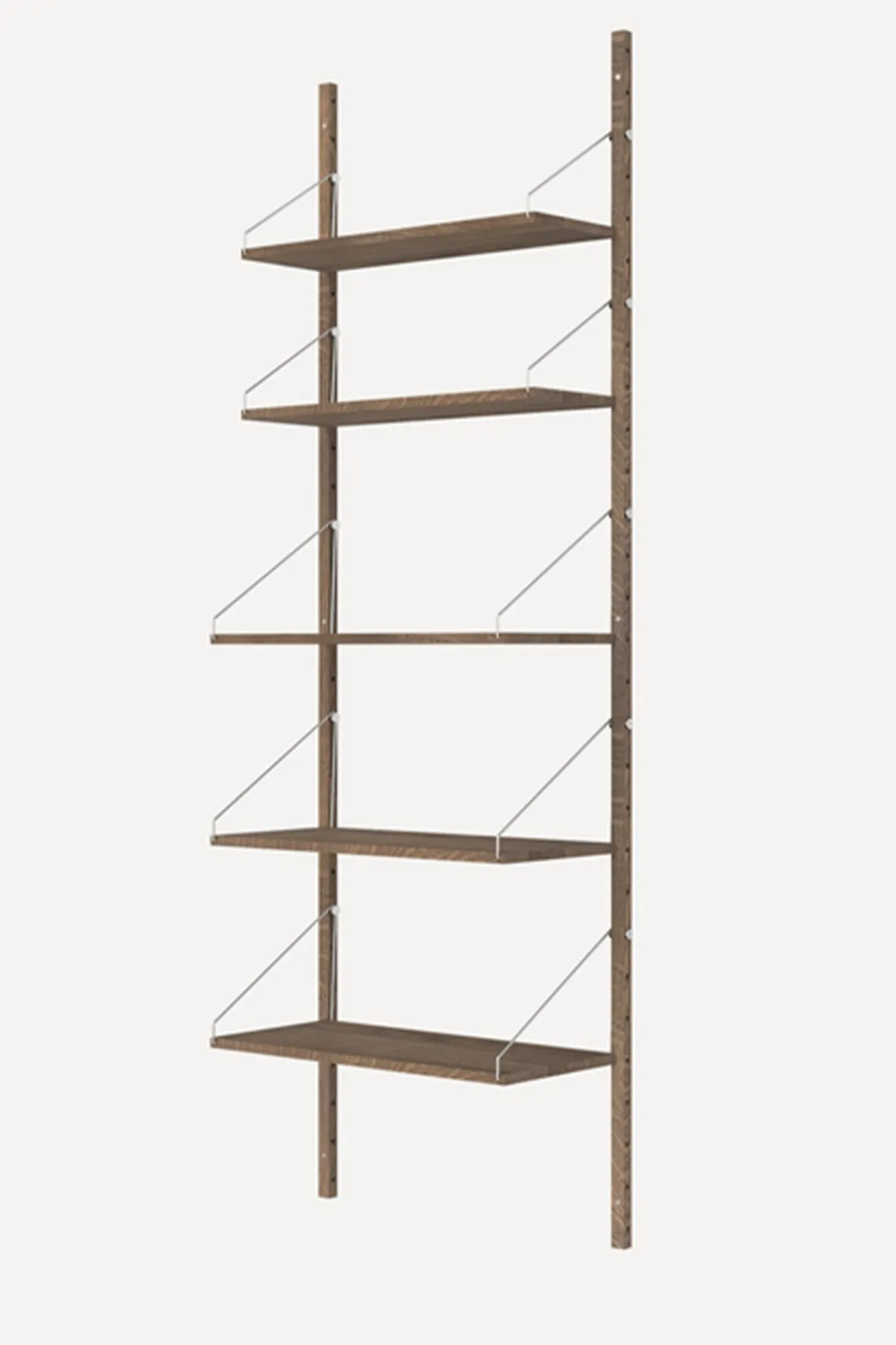 Velkjente Library Shelf komplett hyllesystem fra Frama i vakker, mørkoljet, heltre eik. Karakterisert av et modulært system og festet med solide stålskruer-og braketter på solide skinner i eik, kan hyllene enkelt plasseres og styles om på en rekke måter. Dette allsidige hyllesystemet egner seg til ethvert rom med sitt minimalistiske og stramme design, og kombinasjonen av rustfritt stål og lun, mørkoljet eik passer perfekt inn i de skandinaviske hjem. Library Shelf er enkel å montere, og hver enkelt hylle kan holde ca. 15 kg (avhengig av veggmateriale og montering). Systemet er svært fleksibelt, og hver hylle kan flyttes rundt og tilpasses med tilleggsprodukter fra samme serie.