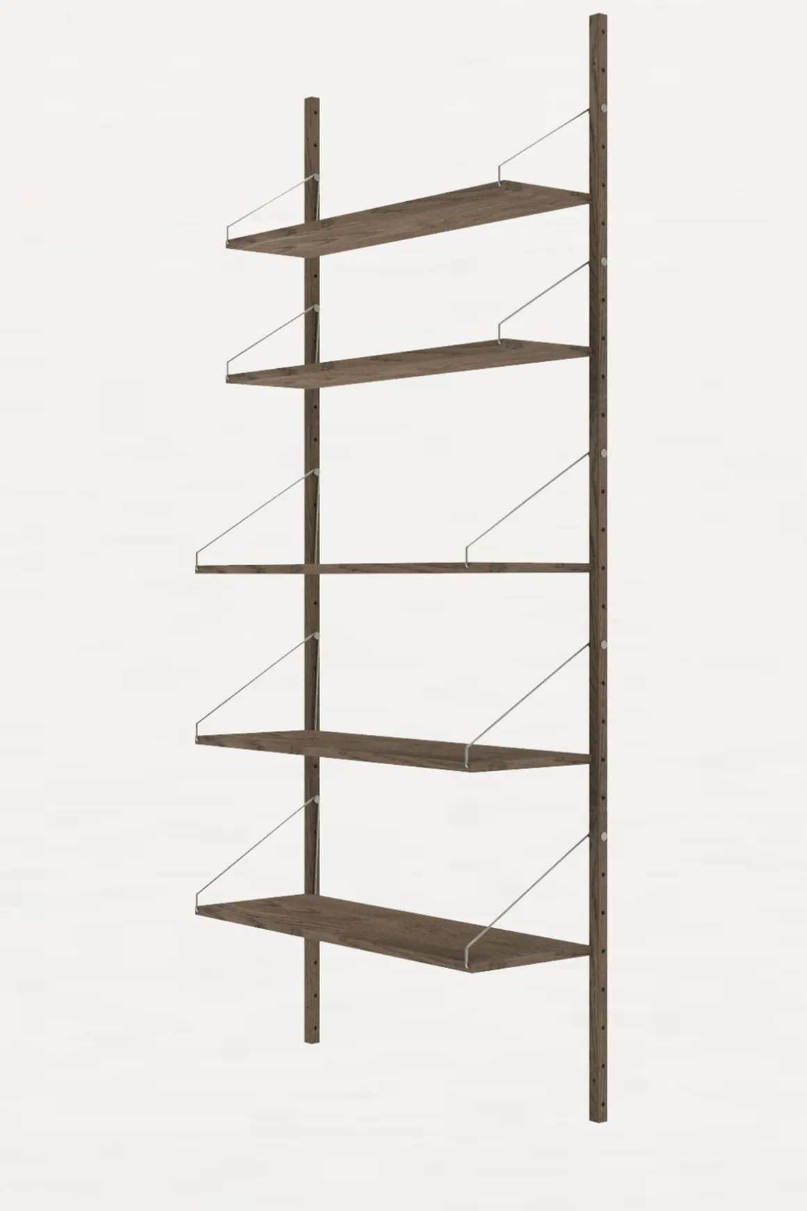 Velkjente Library Shelf komplett hyllesystem fra Frama i vakker, mørkoljet, heltre eik. Karakterisert av et modulært system og festet med solide stålskruer-og braketter på solide skinner i eik, kan hyllene enkelt plasseres og styles om på en rekke måter. Dette allsidige hyllesystemet egner seg til ethvert rom med sitt minimalistiske og stramme design, og kombinasjonen av rustfritt stål og lun, mørkoljet eik passer perfekt inn i de skandinaviske hjem. Library Shelf er enkel å montere, og hver enkelt hylle kan holde ca. 15 kg (avhengig av veggmateriale og montering). Systemet er svært fleksibelt, og hver hylle kan flyttes rundt og tilpasses med tilleggsprodukter fra samme serie.