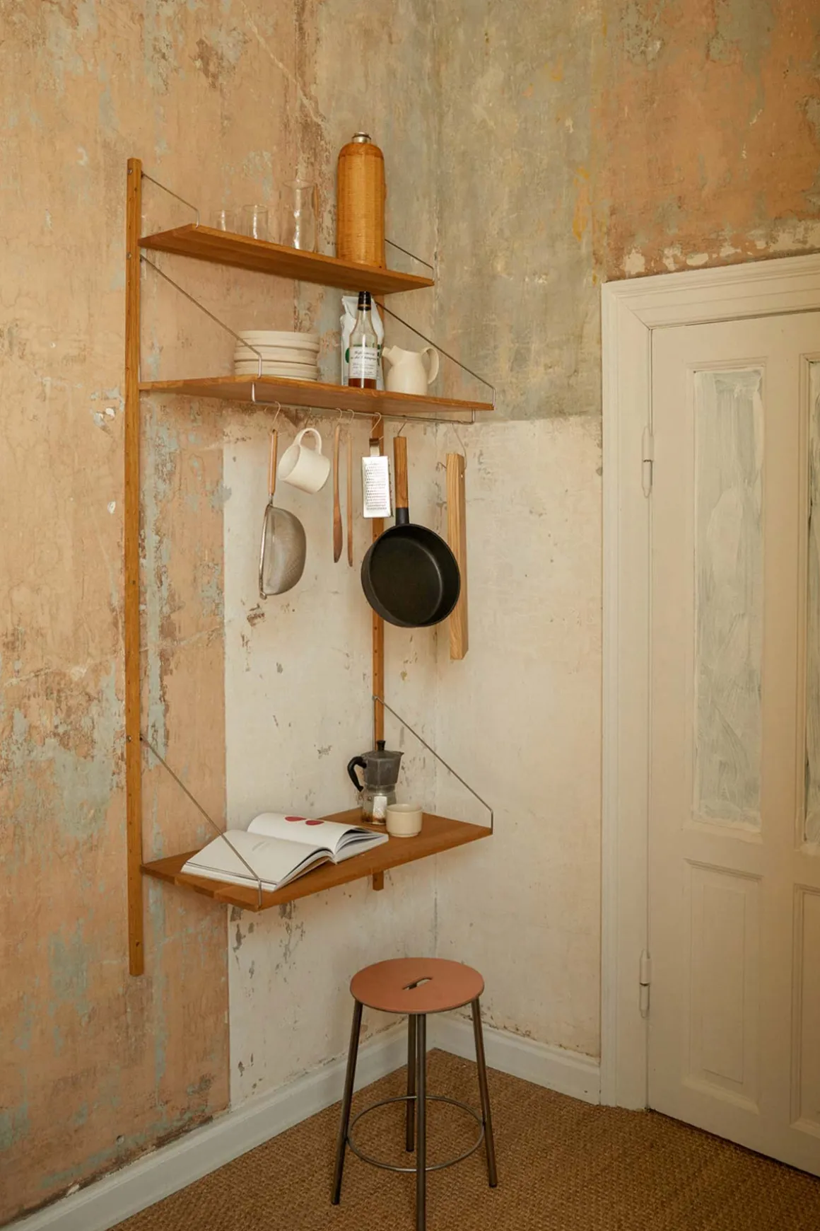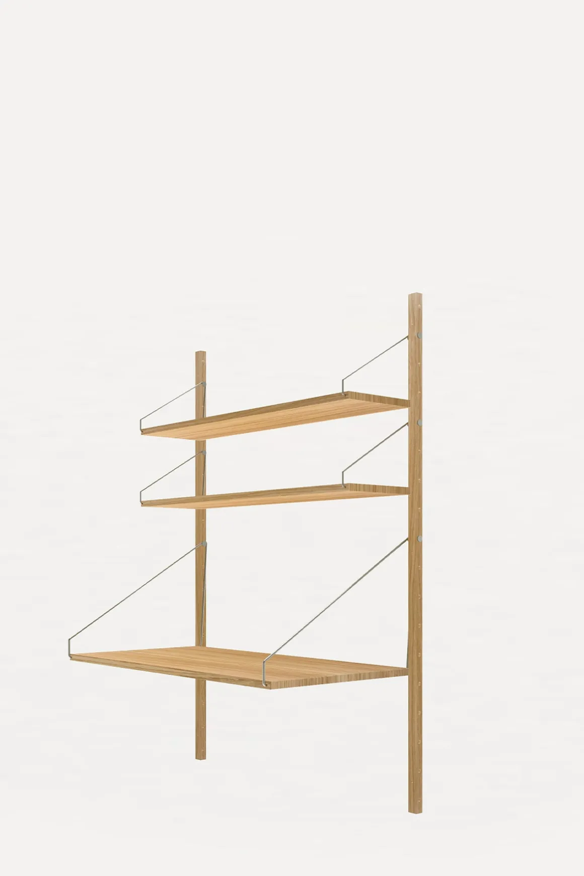 Velkjente Library Shelf komplett hyllesystem med en bredere hylle/kontorpult fra Frama i naturlig, oljet, heltre eik. Karakterisert av et modulært system og festet med solide stålskruer-og braketter på solide skinner i eik, kan hyllene enkelt plasseres og styles om på en rekke måter. Dette allsidige hyllesystemet egner seg til ethvert rom med sitt minimalistiske og stramme design, og kombinasjonen av rustfritt stål og lun, oljet eik passer perfekt inn i de skandinaviske hjem. Library Shelf er enkel å montere, og hver enkelt hylle kan holde ca. 15 kg (avhengig av veggmateriale og montering). Systemet er svært fleksibelt, og hver hylle kan flyttes rundt og tilpasses med tilleggsprodukter fra samme serie.