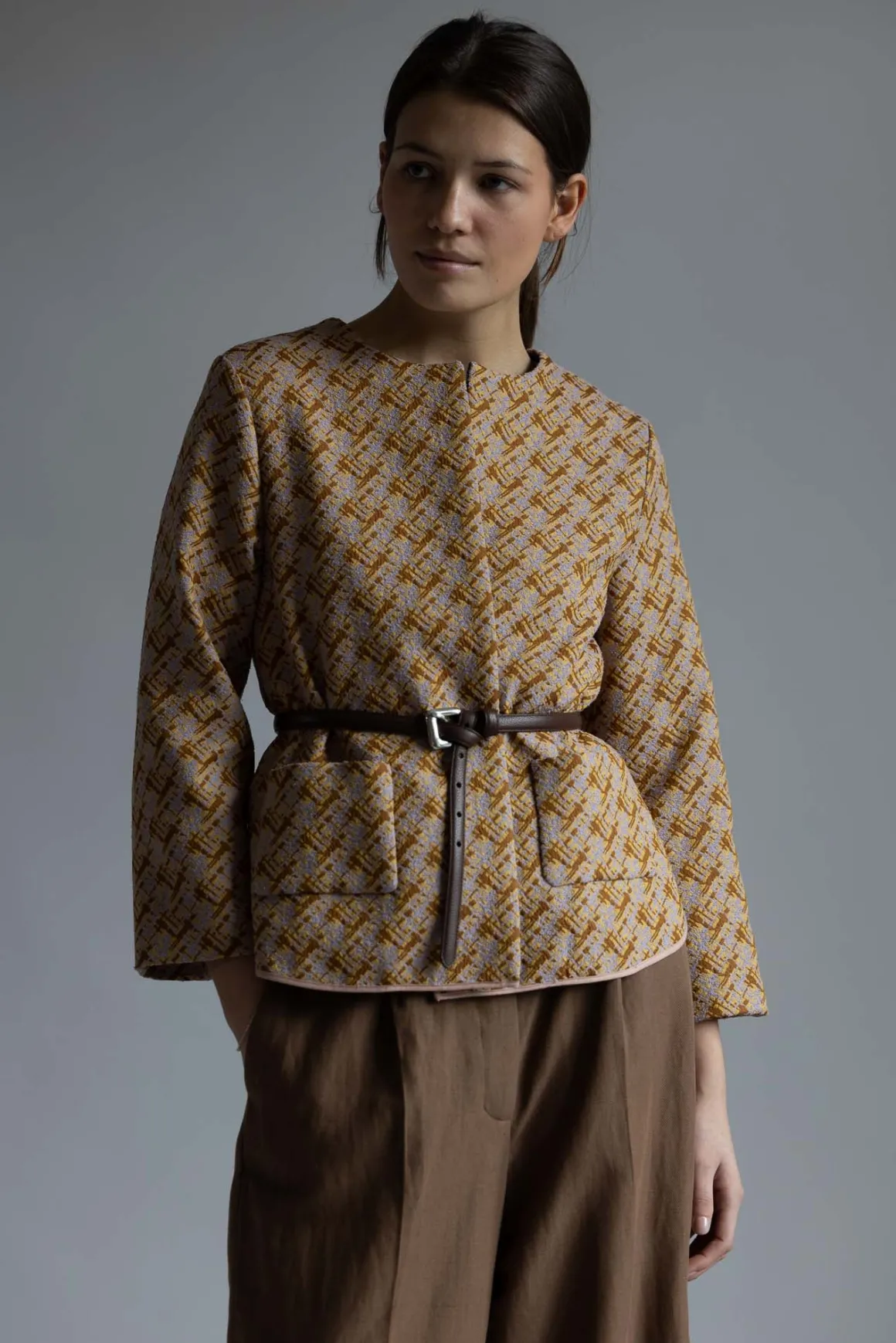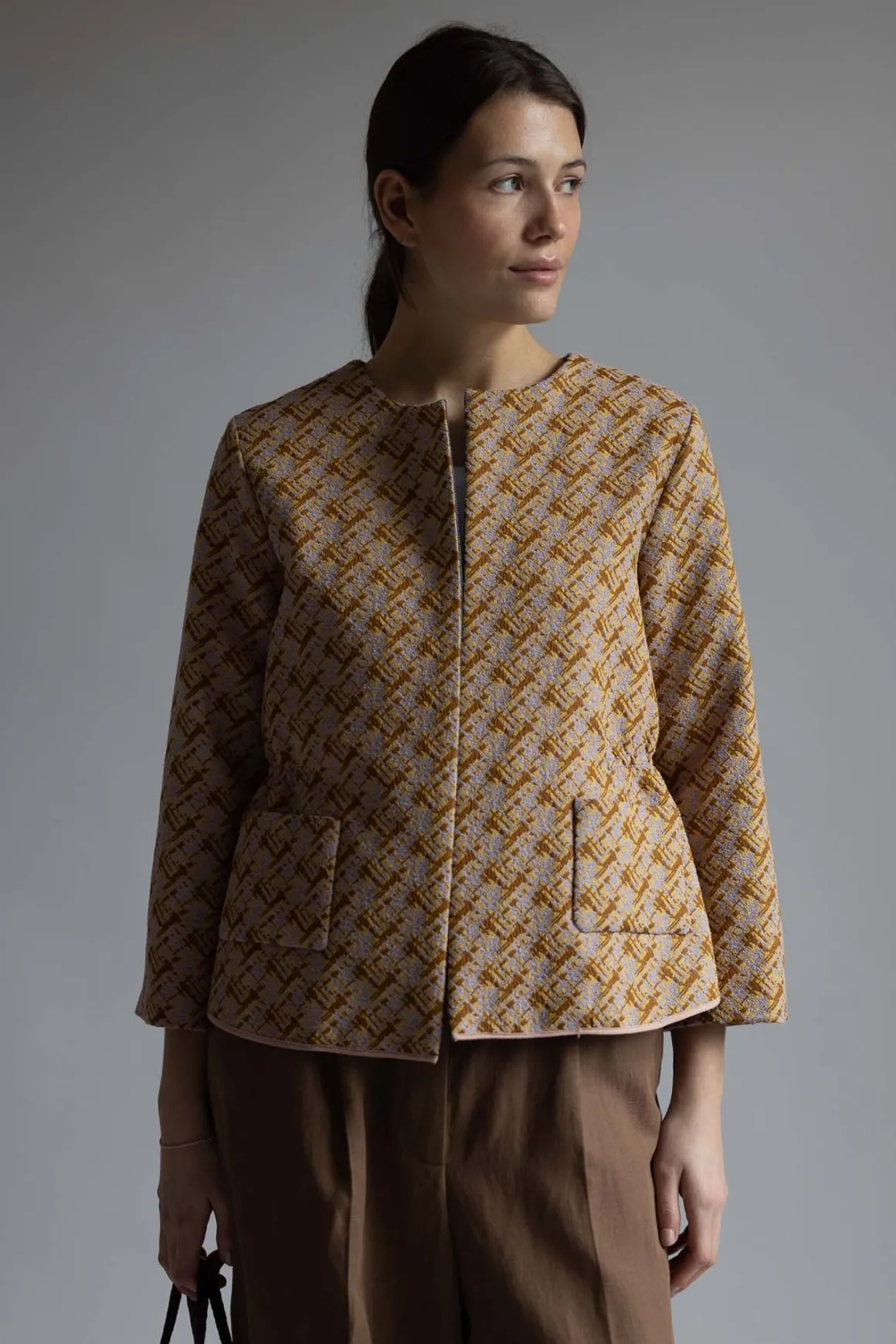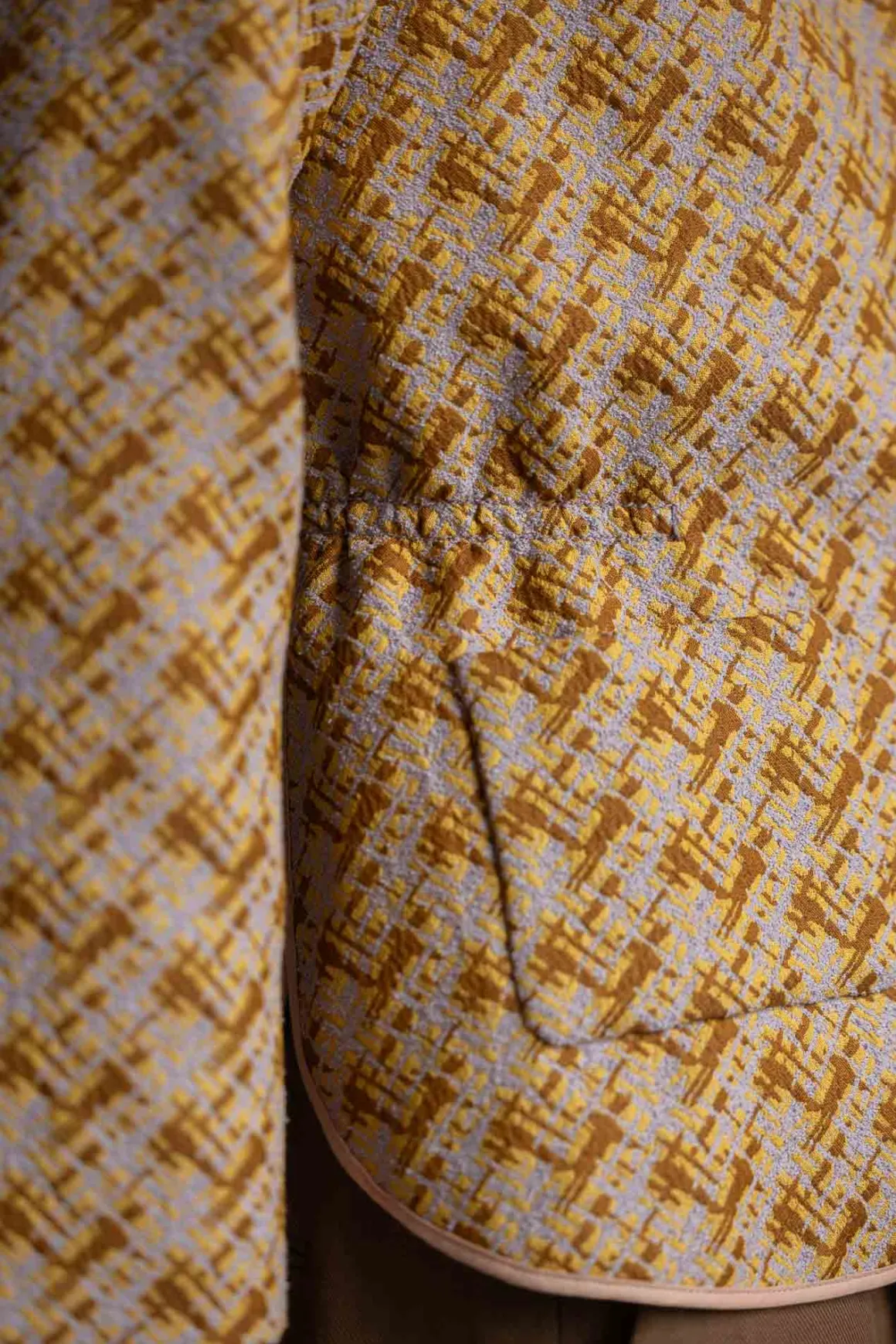 Jakke fra Odeeh med et unikt grafisk mønster i varme gule og brune toner. Den flatterende A-linjeformen med innsving skaper en fin silhuett, mens den runde halsen og de rette ermene gir et rent og moderne uttrykk. En allsidig jakke som løfter ethvert antrekk – bruk den over en kjole, eller style den med bukser eller skjørt for en kul og gjennomført look.