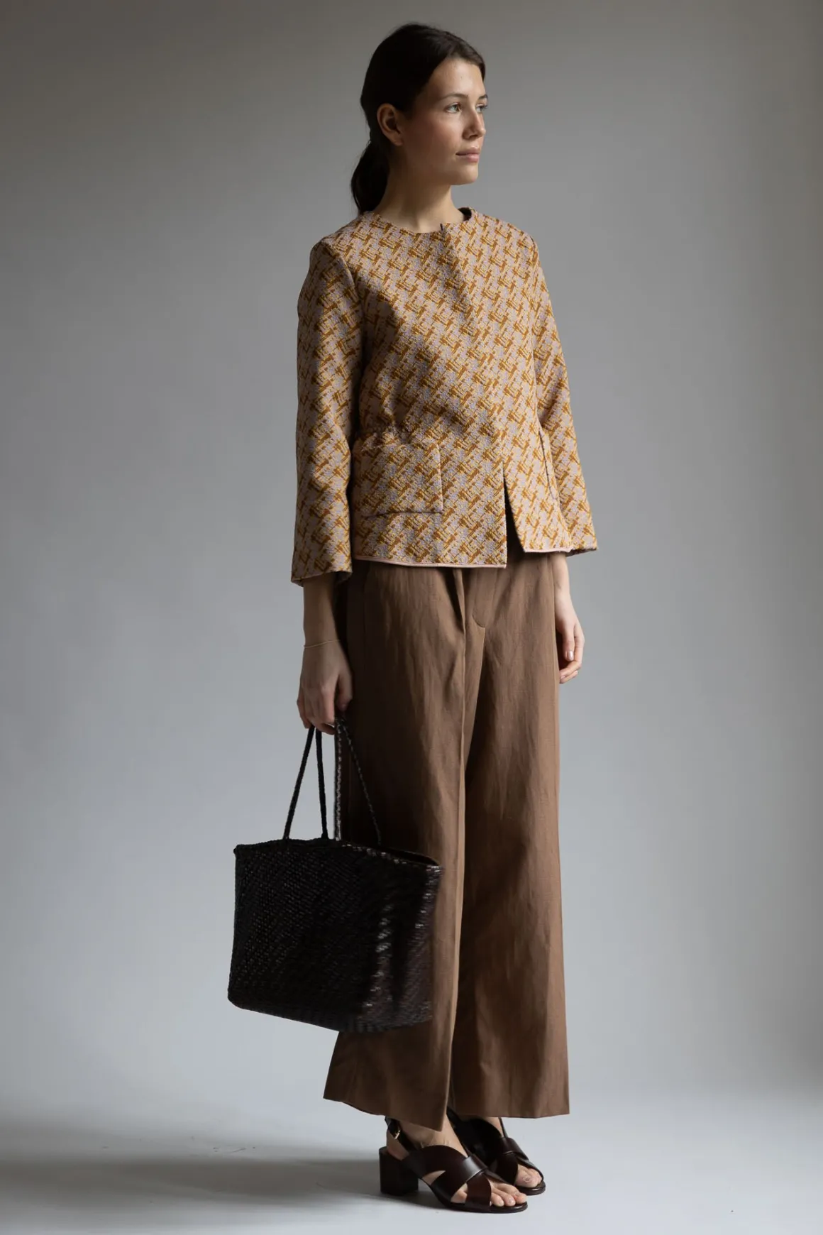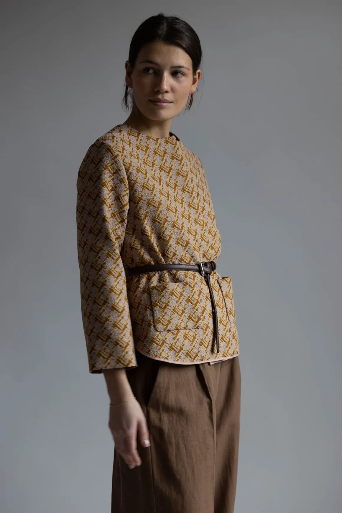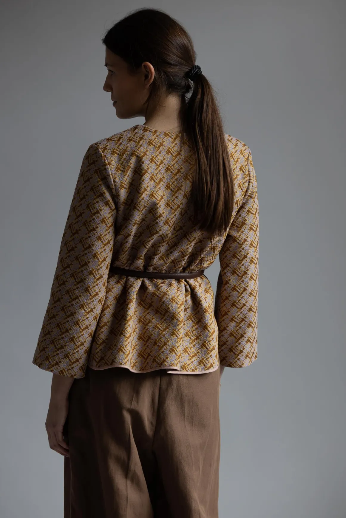 Jakke fra Odeeh med et unikt grafisk mønster i varme gule og brune toner. Den flatterende A-linjeformen med innsving skaper en fin silhuett, mens den runde halsen og de rette ermene gir et rent og moderne uttrykk. En allsidig jakke som løfter ethvert antrekk – bruk den over en kjole, eller style den med bukser eller skjørt for en kul og gjennomført look.