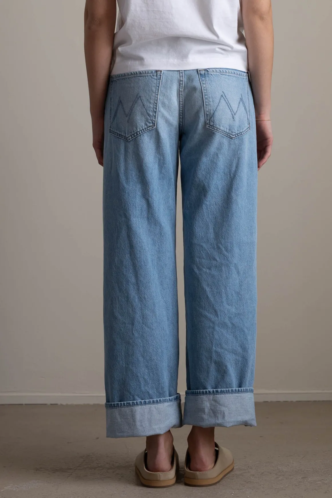 The Dodger Button Hover Cuff fra Mother er en avslappet jeans med lavt liv, løs passform og rette ben. Modellen er laget i stiv SUPERIOR-denim og har knappelukking, oppbrett med ren fald og en benlengde på 74 cm. Vasken Funk N’ Flair er mellomblå med tydelig fading og whiskering over knærne, som gir jeansen et uanstrengt, brukt uttrykk. Denne modellen er laget for å bæres lavt på hoftene og med en oversized silhuett – for en smalere passform anbefales det å gå ned én størrelse.