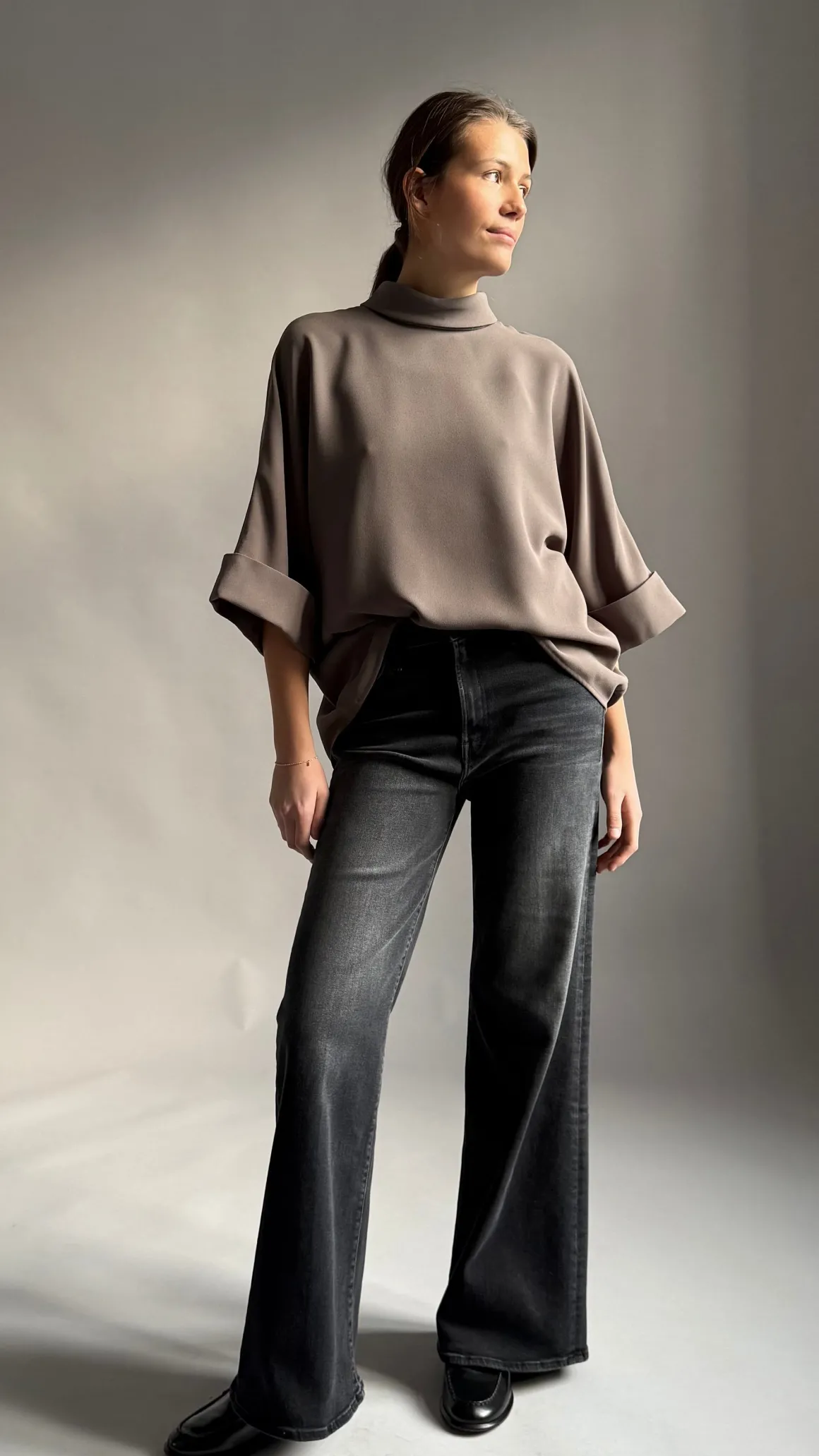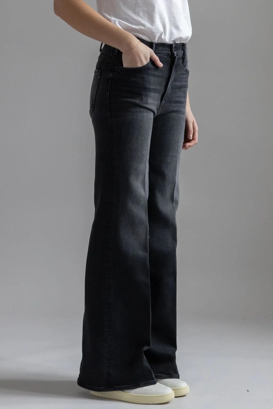The Hustler Roller Sneak fra Mother er en 70-tallsinspirert jeans med høy midje og vide ben som går ut fra hoften og nedover. Jeansen har en vasket sort farge med lett falming og tonale sømmer som gir et avslappet og tidløst uttrykk. Den er designet med klassiske detaljer som lommer foran og bak, samt glidelås- og knappelukking i front. Laget i en myk stretchbomullsblanding som sikrer en god passform og komfort hele dagen.