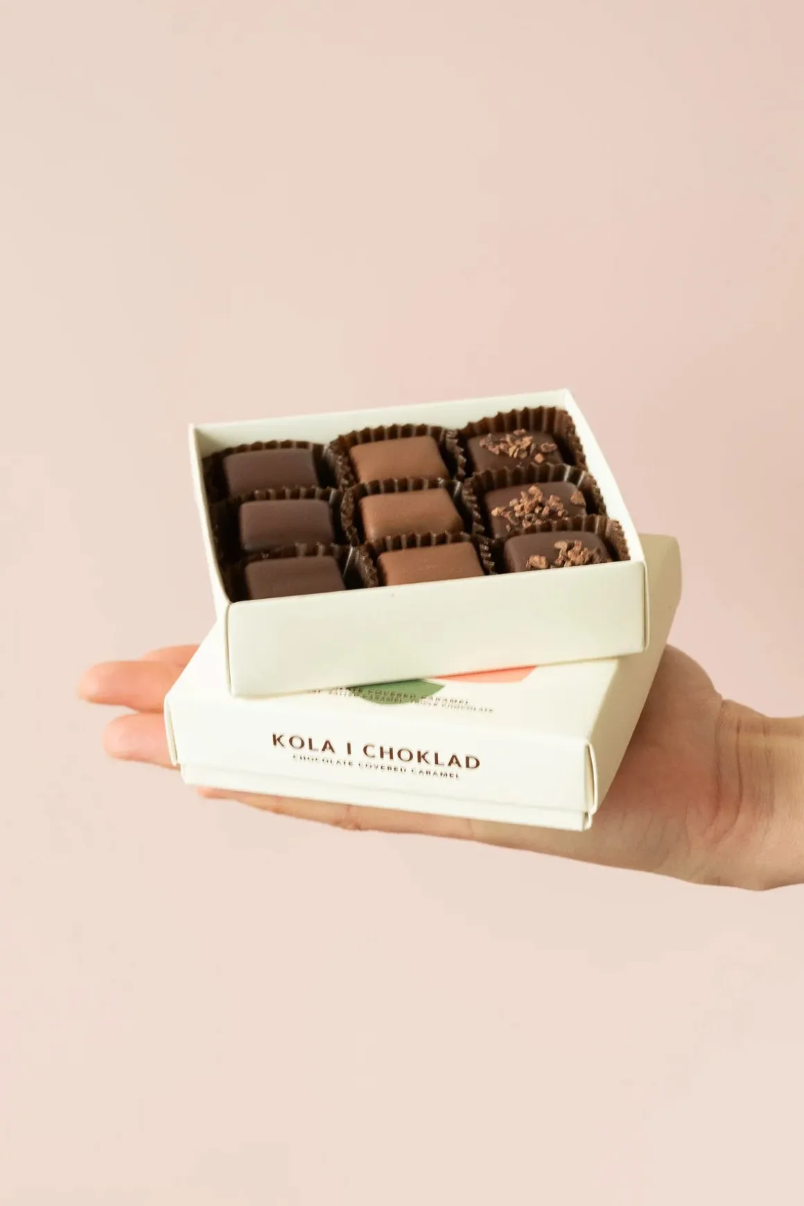 Ni biter myk karamell dyppet i sjokolade. I denne boksen finner du to av våre klassikere, TRIPLE CHOCOLATE i mørk sjokolade, SALTED CARAMEL i melkesjokolade og nykommeren RASPBERRY i mørk sjokolade.
