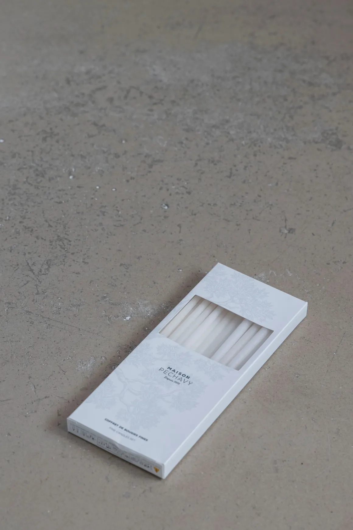 20 pk med vakre kertelys fra Maison Pechavy i hvitt. Denne bunten med håndverkslys er et resultat av deres samarbeid med en av de siste stearinlys-produsentene i Frankrike som jobber for å opprettholde gamle tradisjoner og metoder. De u-formede bomullsvekene plasseres på pinner festet til trerammer og blir deretter dyppet i voks. Resultatet er fine, koniske lys som forfines mot toppen. Fargepigmentene drysses inn i den smeltede voksen og gir dype, livlige farger. Kvalitetslysene fra Maison Pechavy brenner langsomt slik at de ikke avgir røyk. Disse lysene har en diameter på 0,8 -1 cm og kalles kertelys. Ønsker du å bruke kertelysene i en vanlig lysestake til kronelys, kan man bruke adapterne fra samme merke som gjør diameteren på åpningen mindre slik at lysene står støtt.