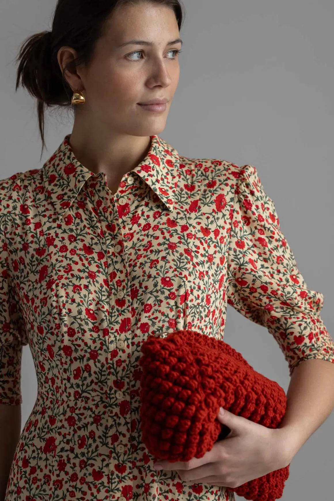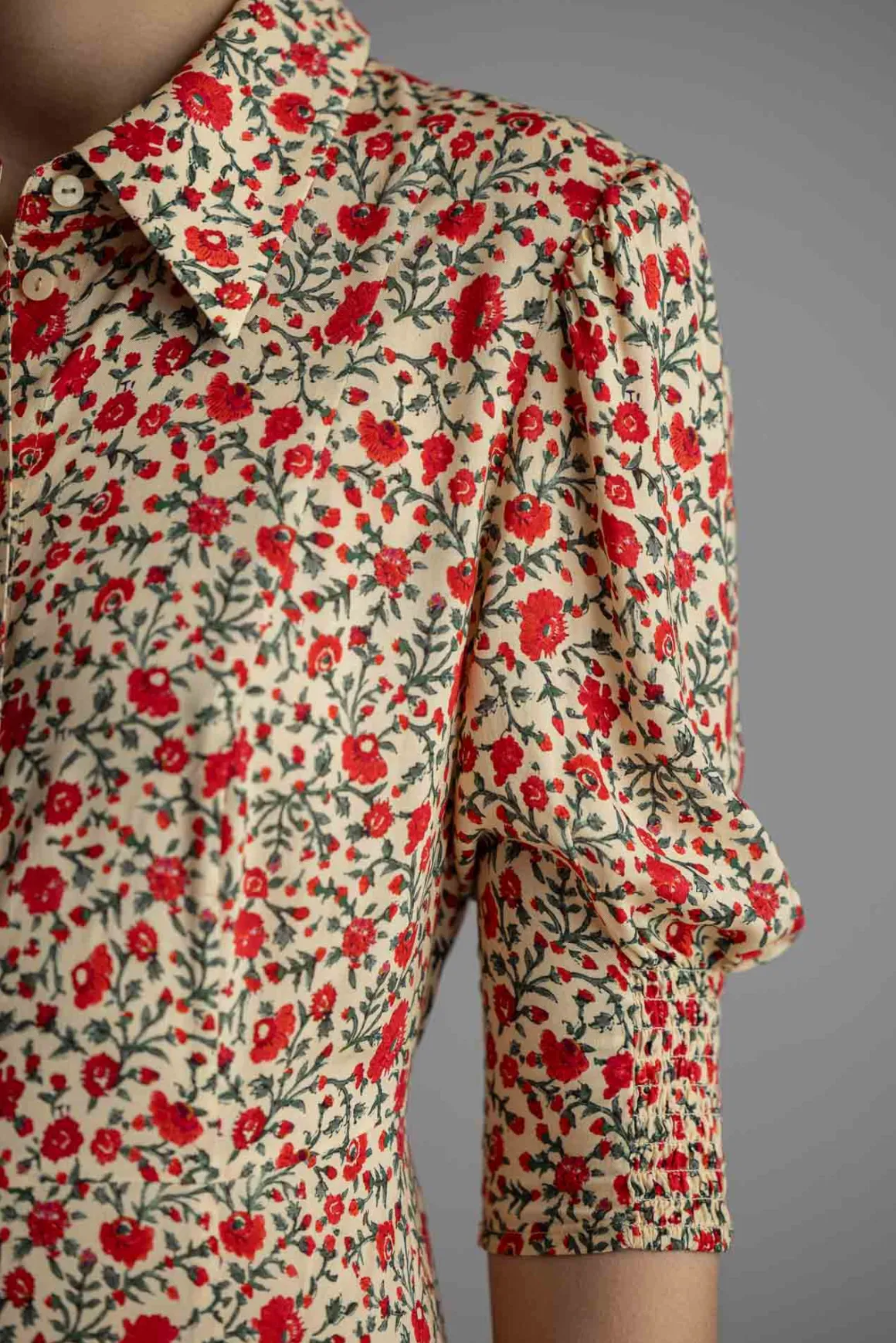 Bloom Dress Ditsy Trail Cream fra Rixo er den perfekte kombinasjonen av bohemsk sjarm og vintage-kulhet. Med sitt delikate blomstermønster og lette viskosemateriale, gir denne kjolen en luftig og feminin silhuett som passer til enhver anledning. Den har en flatterende splitt foran på skjørtet, som gir bevegelse og en nydelig detalj. Knapper fra topp til bunn tilfører en klassisk touch, mens knytingen i ryggen gir muligheten til å justere passformen etter ønske. Strikken i ermene skaper en vakker puffeffekt og bidrar til kjolens feminine uttrykk. Denne kjolen er perfekt for varme sommerdager, men kan enkelt styles opp med hæler og smykker for mer formelle anledninger.