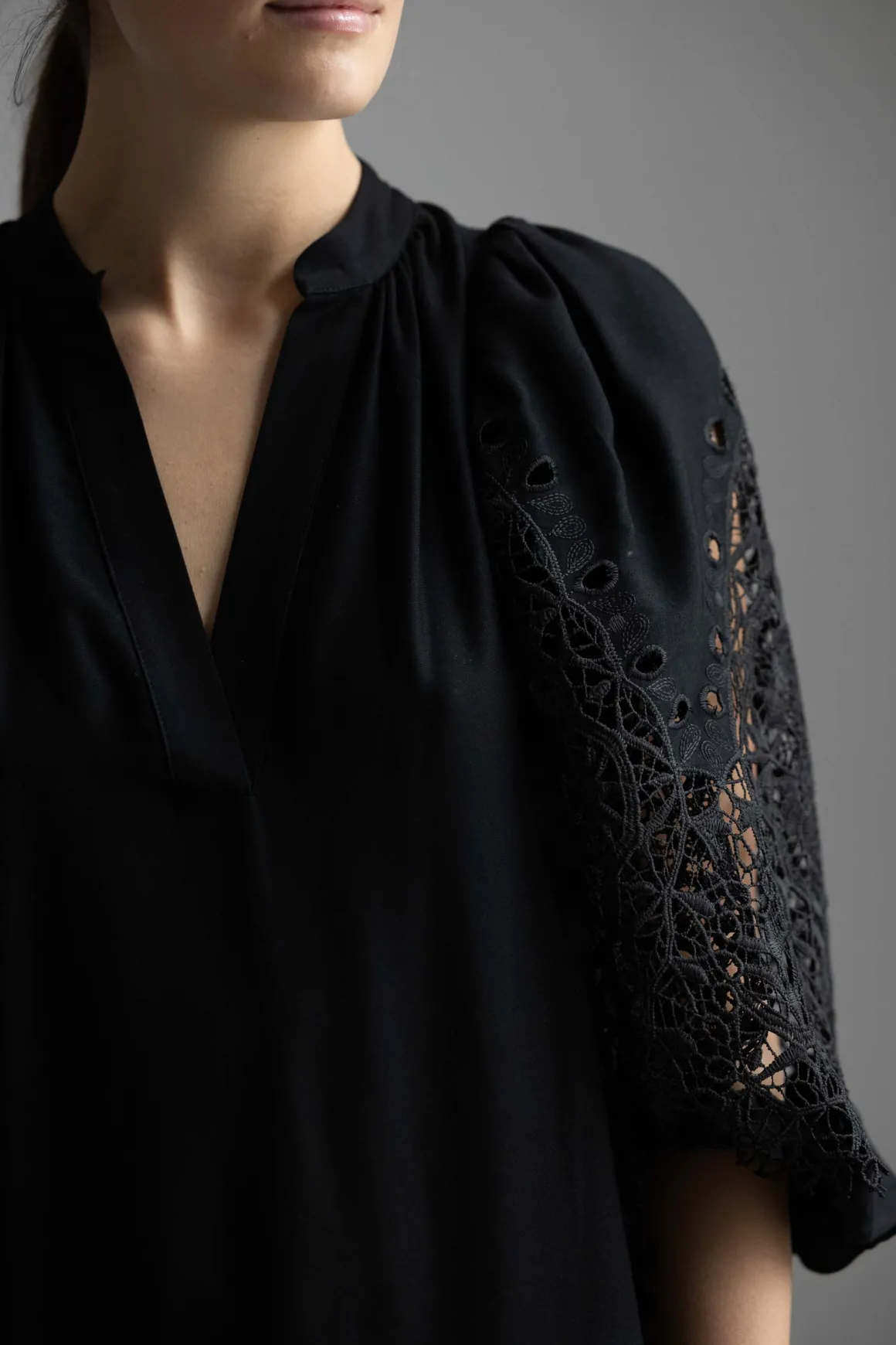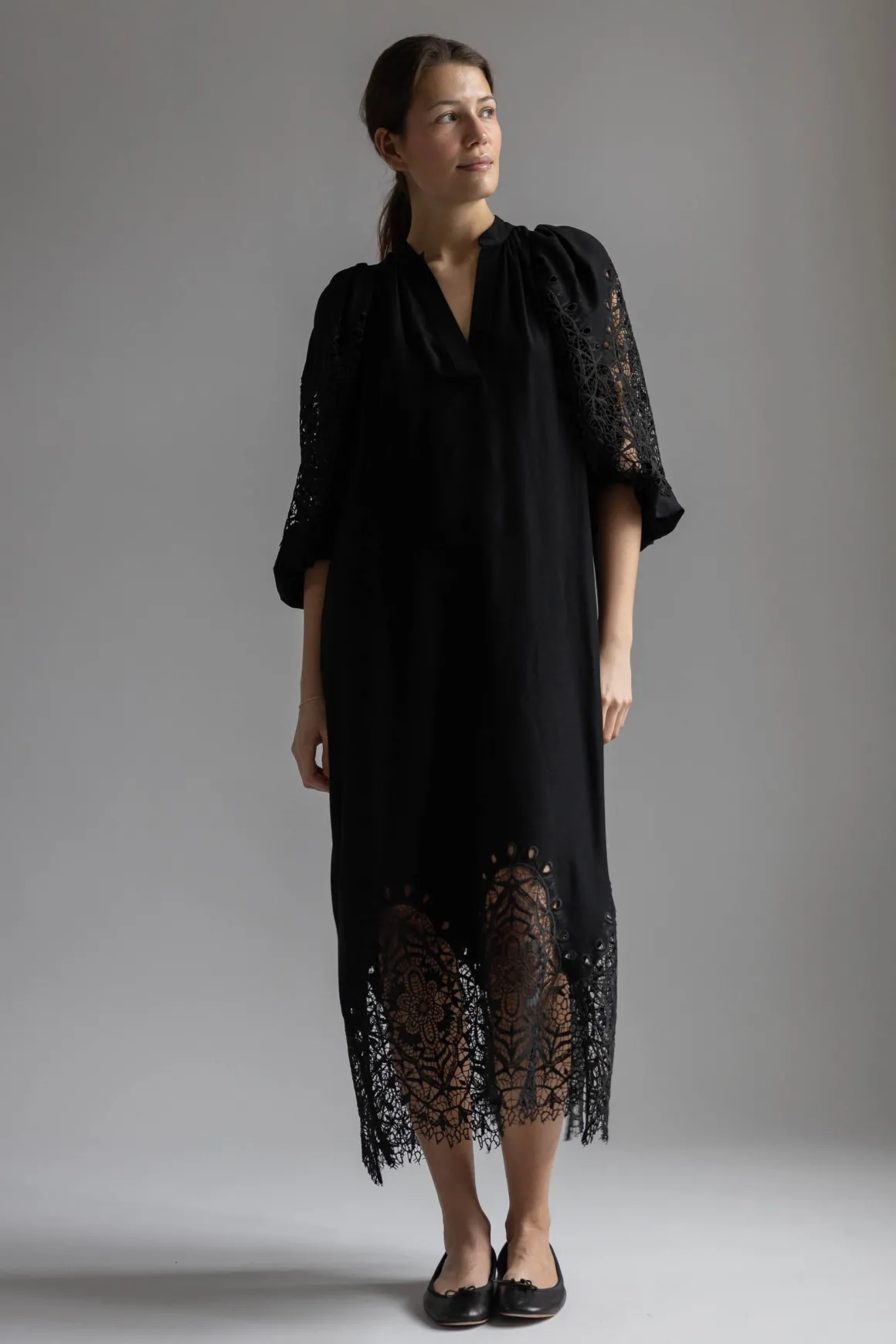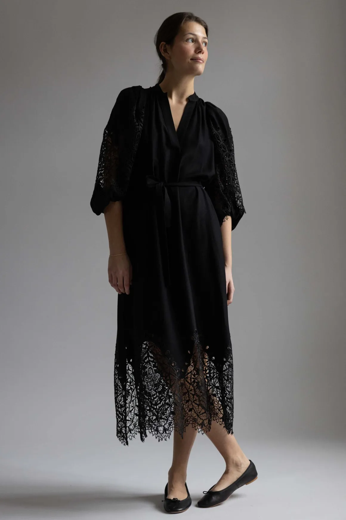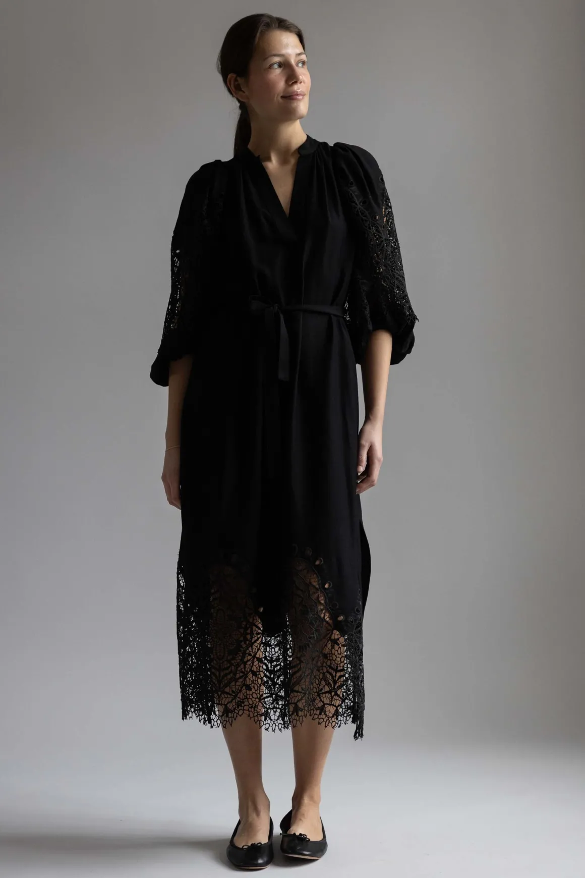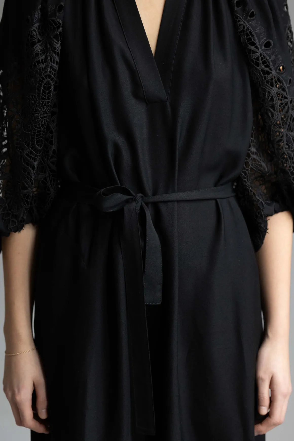 Canessa-kjolen i sort fra Vanessa Bruno har en løs, flytende passform som gir kjolen en diskre romantisk touch. De lange, puffede ermene med rynkedetaljer ved mansjettene tilfører en teksturert dimensjon til silhuetten. Innesydd blonder ved ermene og nederkanten skaper et subtilt spill. Kjolen er laget av en myk og smidig viskoseblanding, som gir kjolen et vakkert fall. Perfekt både til hverdags og mer formelle anledninger – en tidløs favoritt i garderoben. Du kan bytte ut det avtakbare ton-i-ton-beltet med et bredere belte for en mer markert midje.
