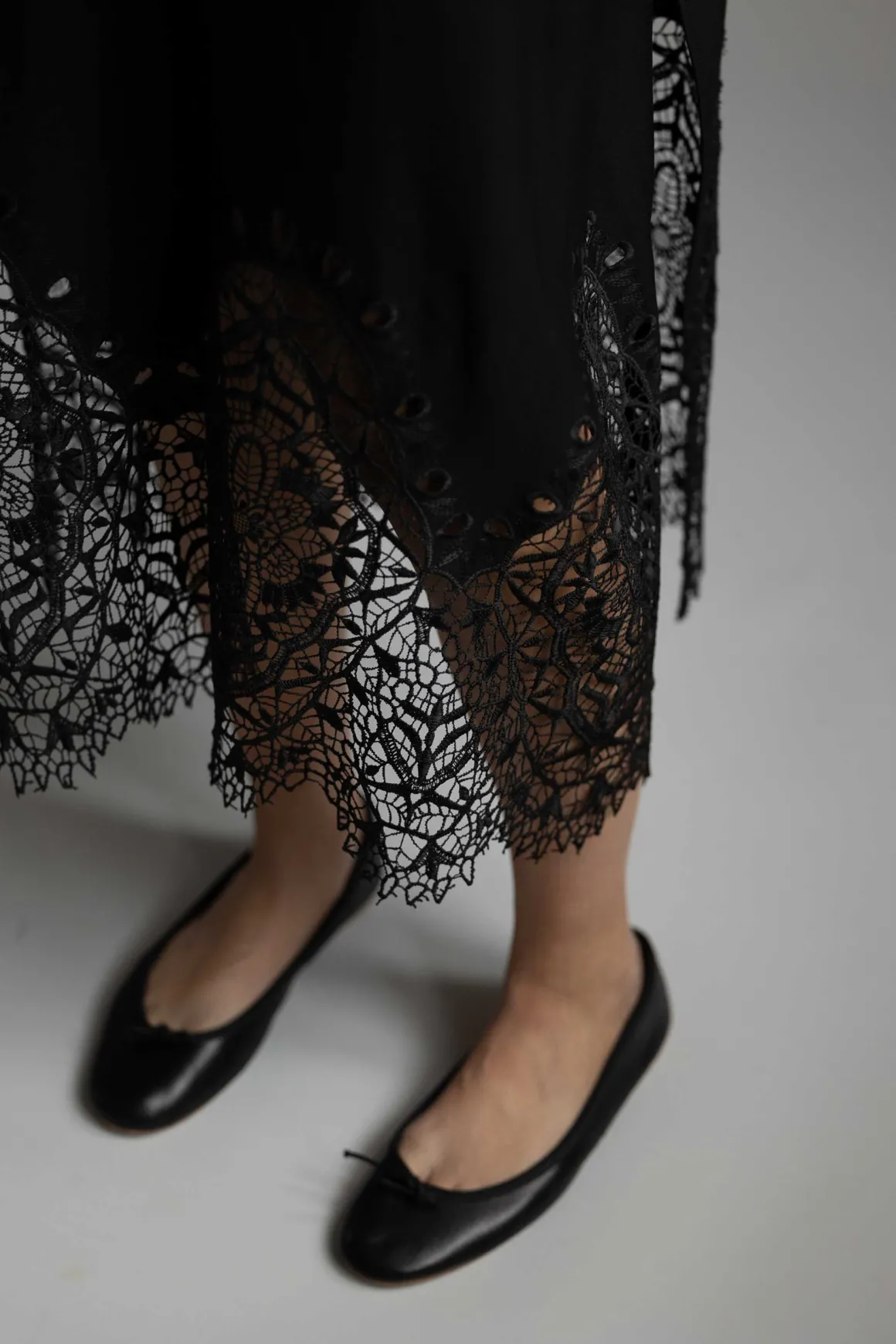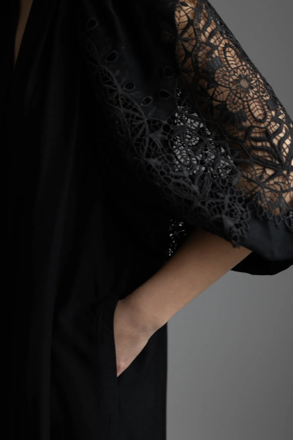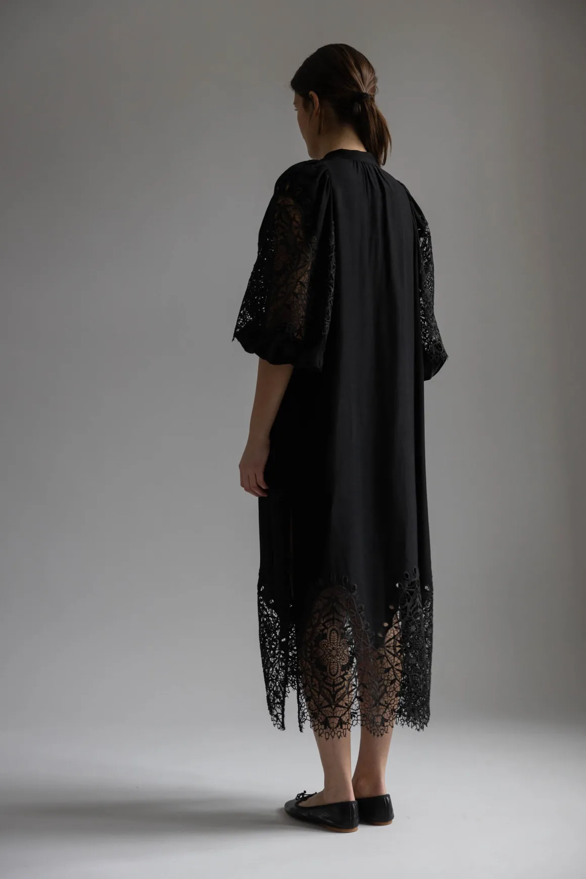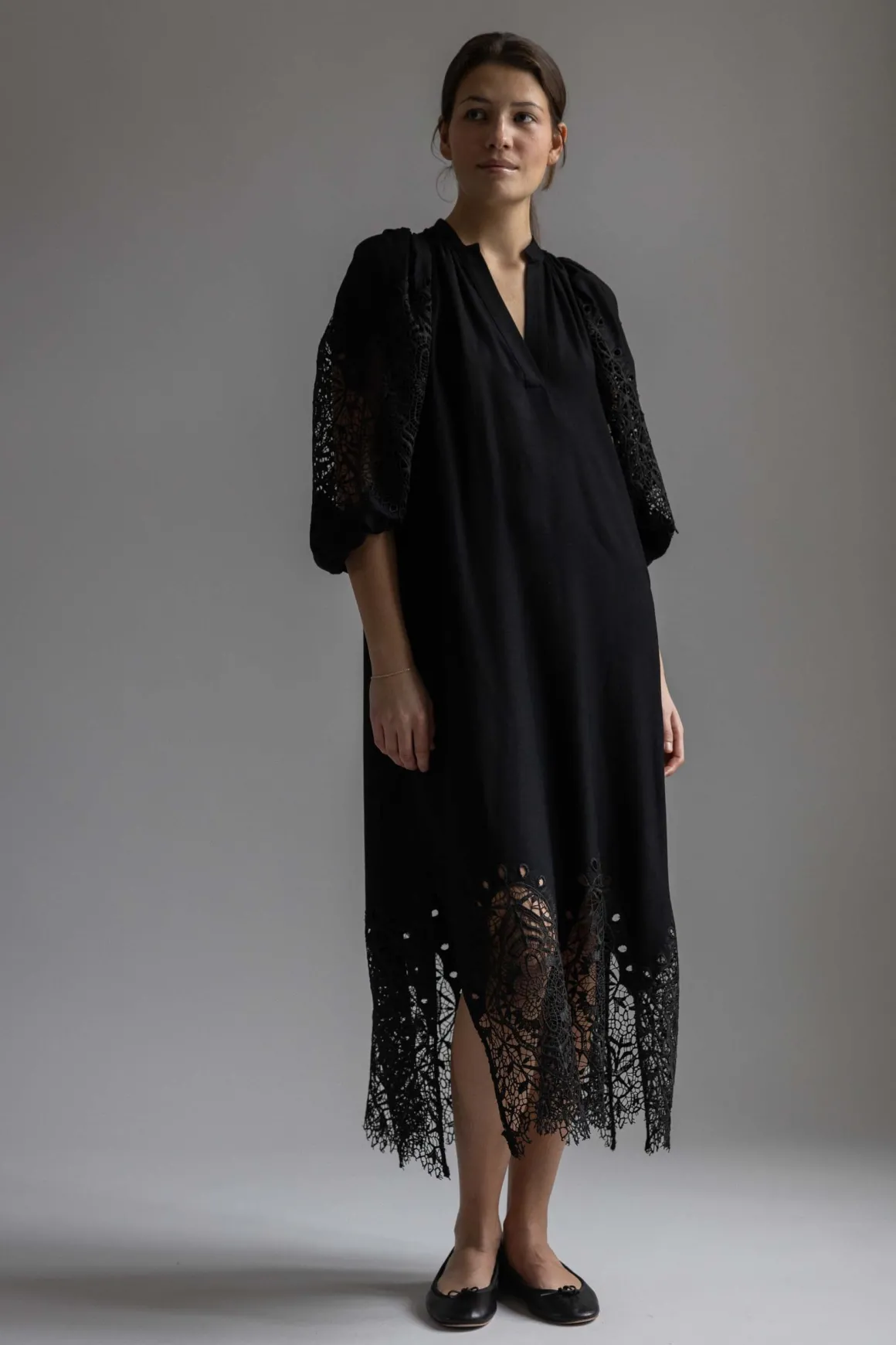 Canessa-kjolen i sort fra Vanessa Bruno har en løs, flytende passform som gir kjolen en diskre romantisk touch. De lange, puffede ermene med rynkedetaljer ved mansjettene tilfører en teksturert dimensjon til silhuetten. Innesydd blonder ved ermene og nederkanten skaper et subtilt spill. Kjolen er laget av en myk og smidig viskoseblanding, som gir kjolen et vakkert fall. Perfekt både til hverdags og mer formelle anledninger – en tidløs favoritt i garderoben. Du kan bytte ut det avtakbare ton-i-ton-beltet med et bredere belte for en mer markert midje.