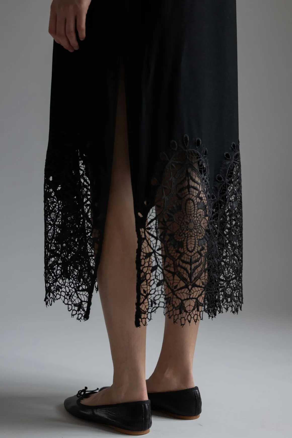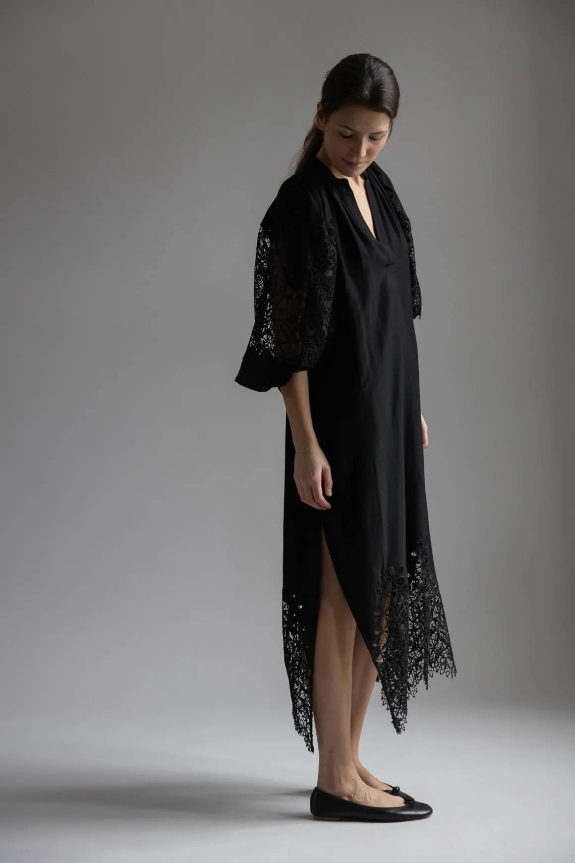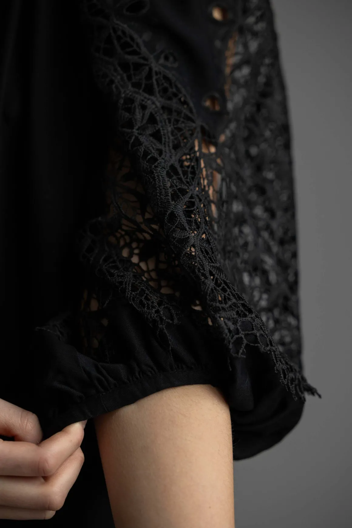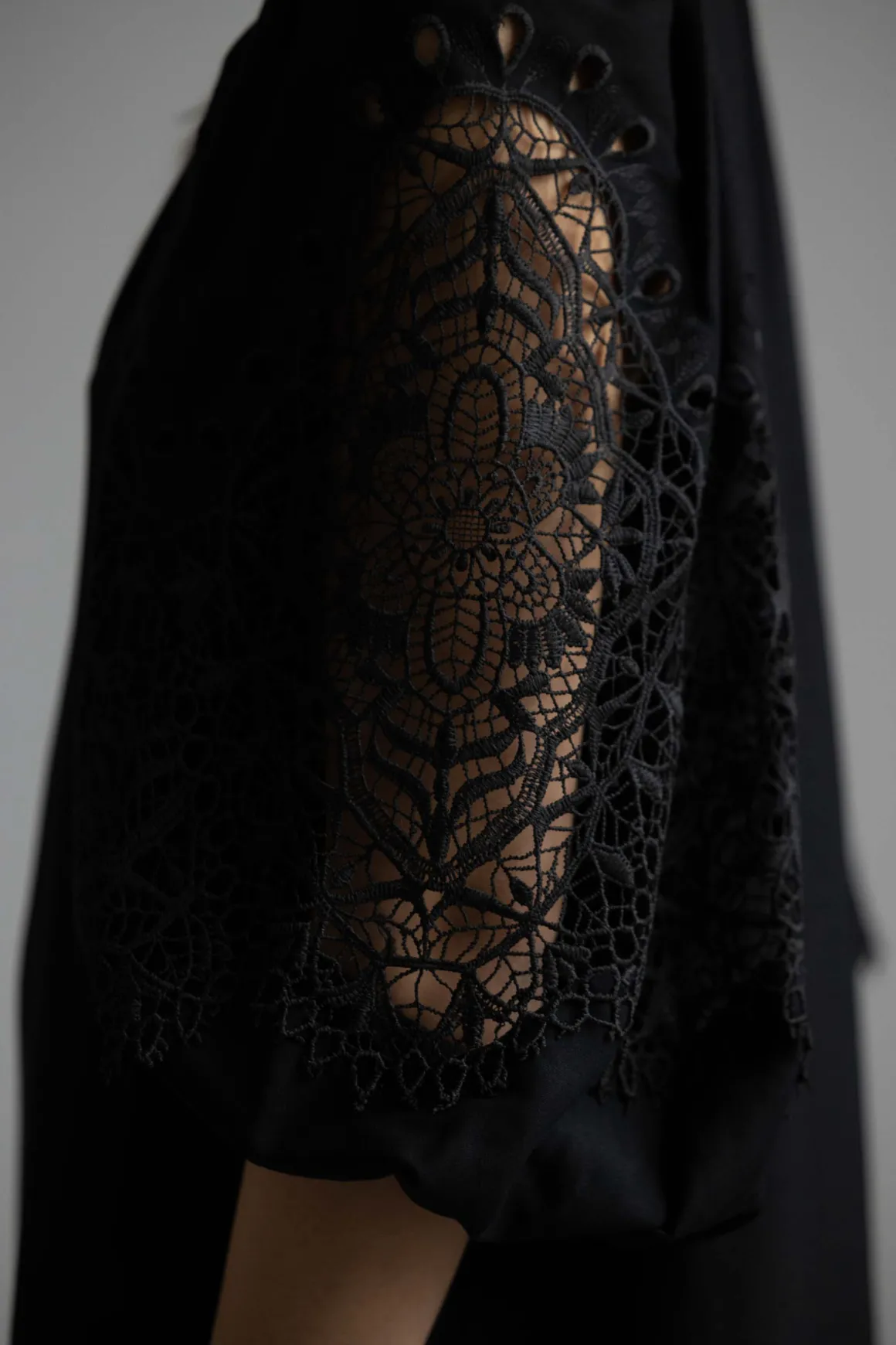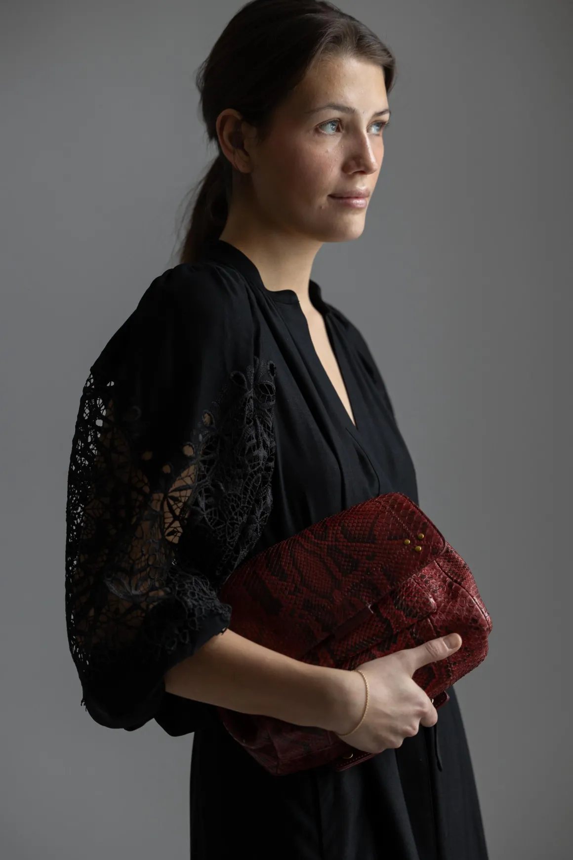 Canessa-kjolen i sort fra Vanessa Bruno har en løs, flytende passform som gir kjolen en diskre romantisk touch. De lange, puffede ermene med rynkedetaljer ved mansjettene tilfører en teksturert dimensjon til silhuetten. Innesydd blonder ved ermene og nederkanten skaper et subtilt spill. Kjolen er laget av en myk og smidig viskoseblanding, som gir kjolen et vakkert fall. Perfekt både til hverdags og mer formelle anledninger – en tidløs favoritt i garderoben. Du kan bytte ut det avtakbare ton-i-ton-beltet med et bredere belte for en mer markert midje.