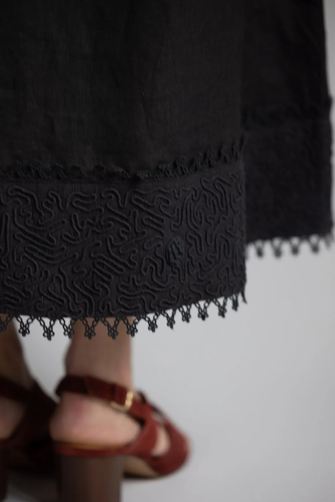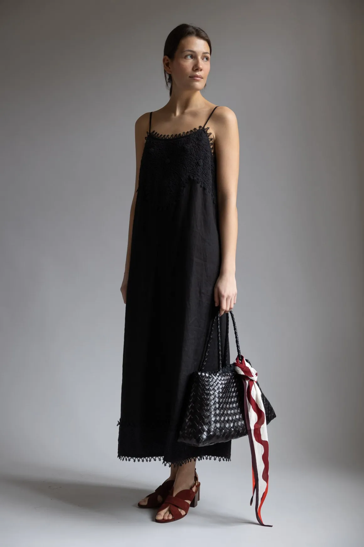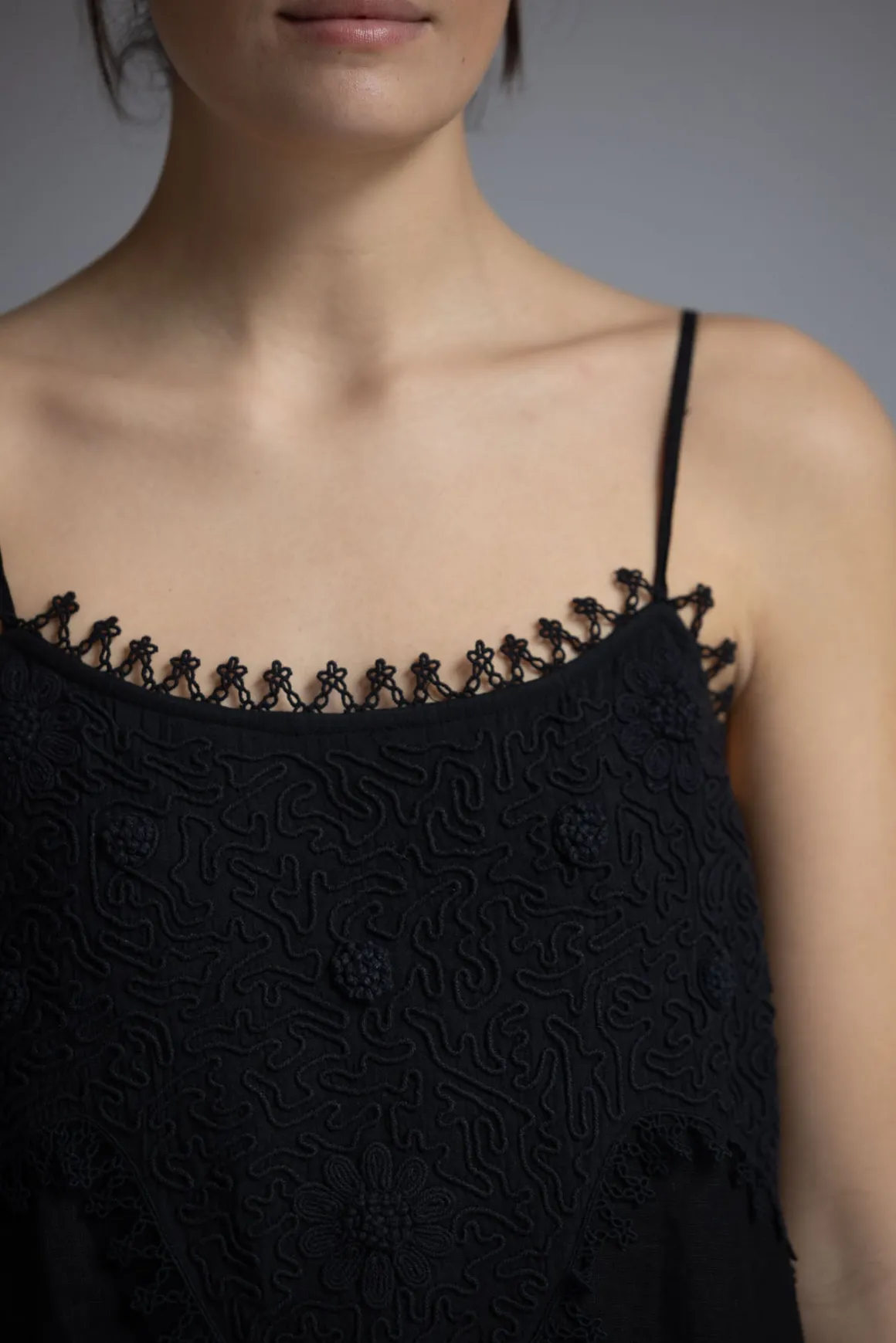 Emmy-kjolen er en linkjole med stropper, eksklusiv båndbrodering og blondedetaljer øverst og nederst. Den har en løs passform og perfekt både til middag som til stranden. Den har en underskjole i 100% bomull som går til rett over kneet.