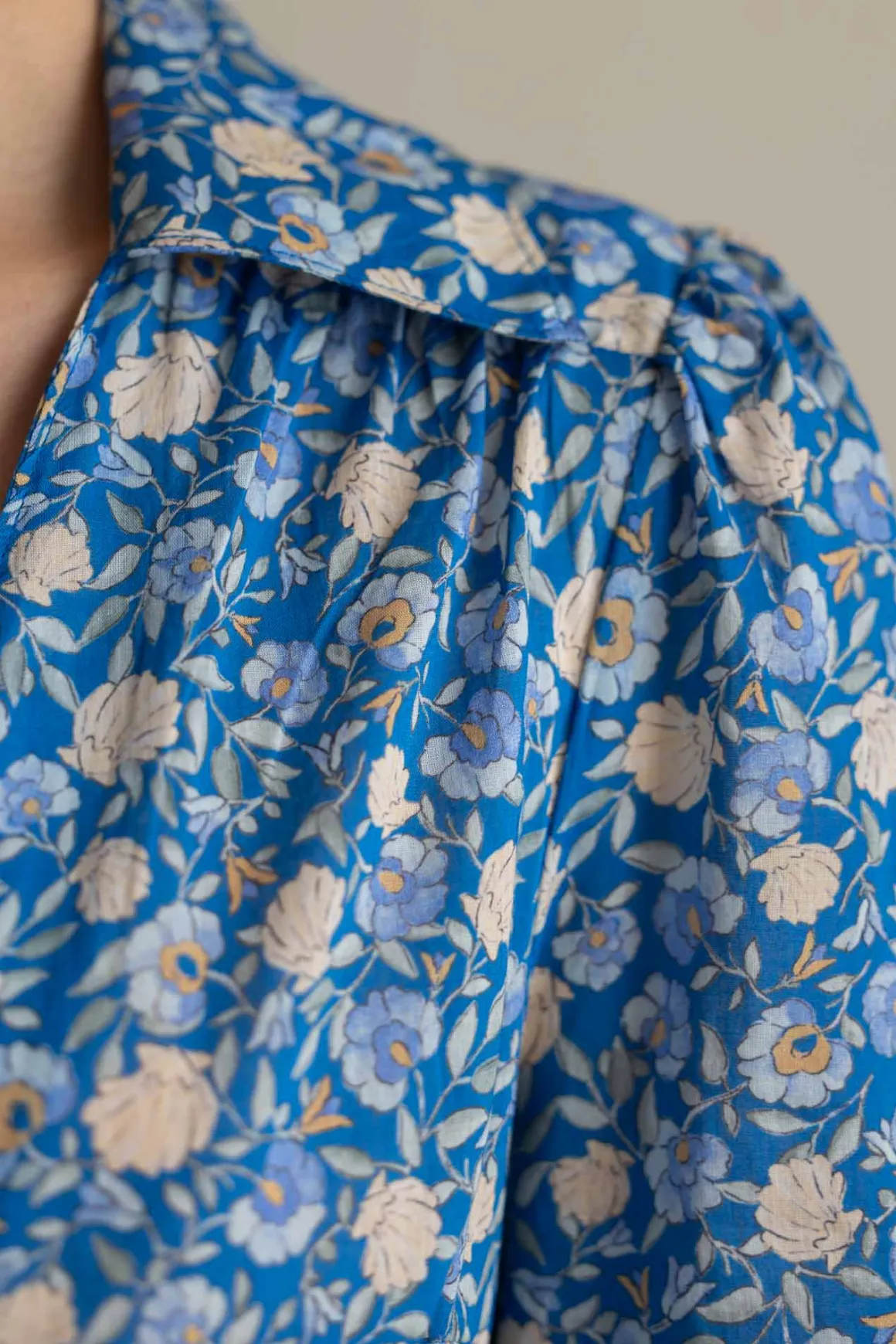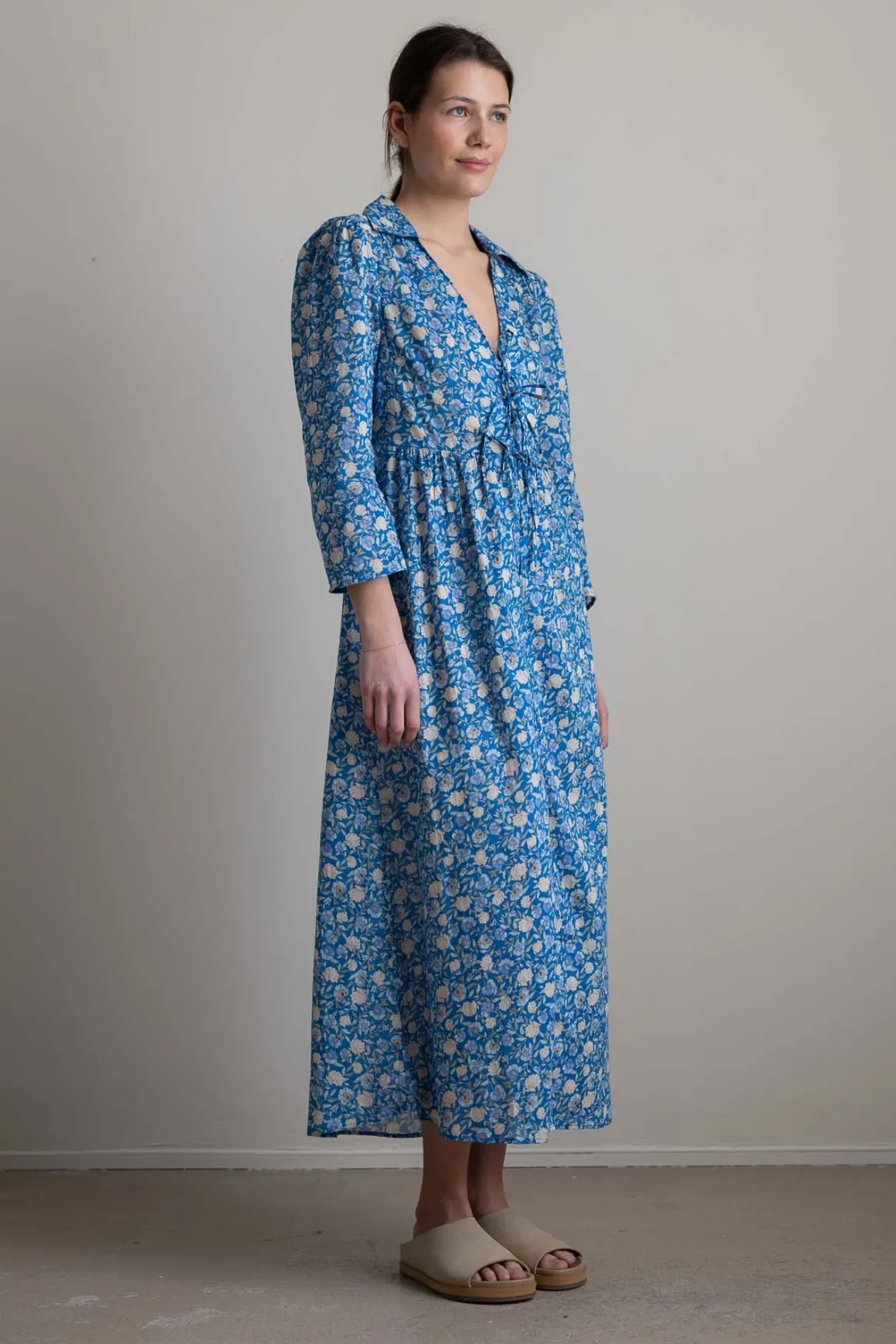 En drøm av en kjole fra Rixo. Franchi-kjolen er lett og luftig i tynn bomullsvoile, med et delikat blomsterprint som forener bohemsk sjarm og vintageinspirert silhuett. Tre knytebånd foran og ett bak gir mulighet til å justere passformen slik du ønsker, da båndene er festet i sidene. En skjult knappestolpe fra livet og ned skaper et rent uttrykk, mens den dype frontsplitten tilfører både bevegelse og letthet. Smale ermer uten mansjetter, rynket midje og klassisk krage gir en feminin og tidløs form.