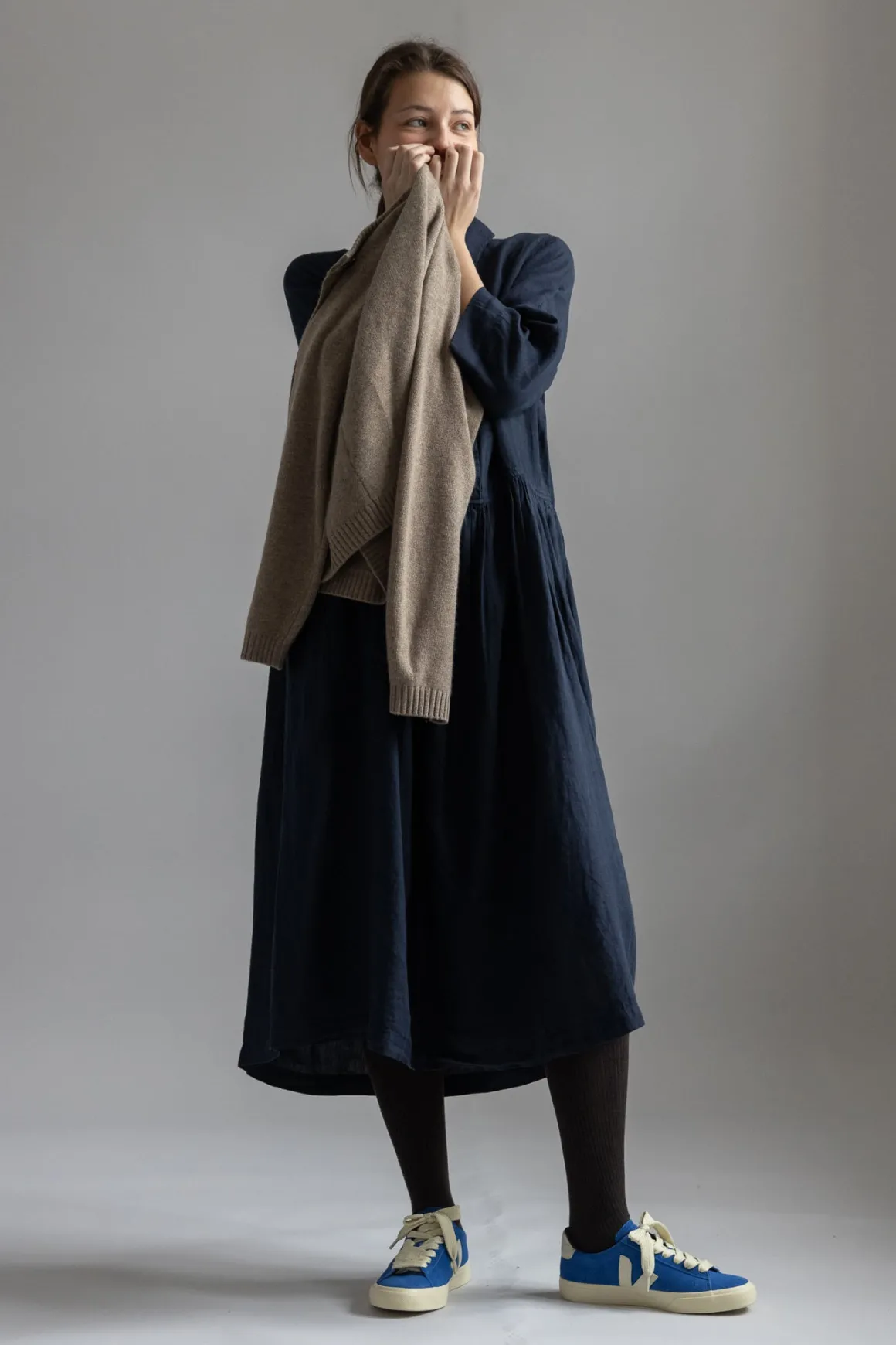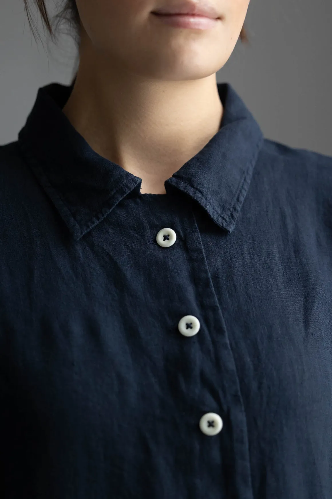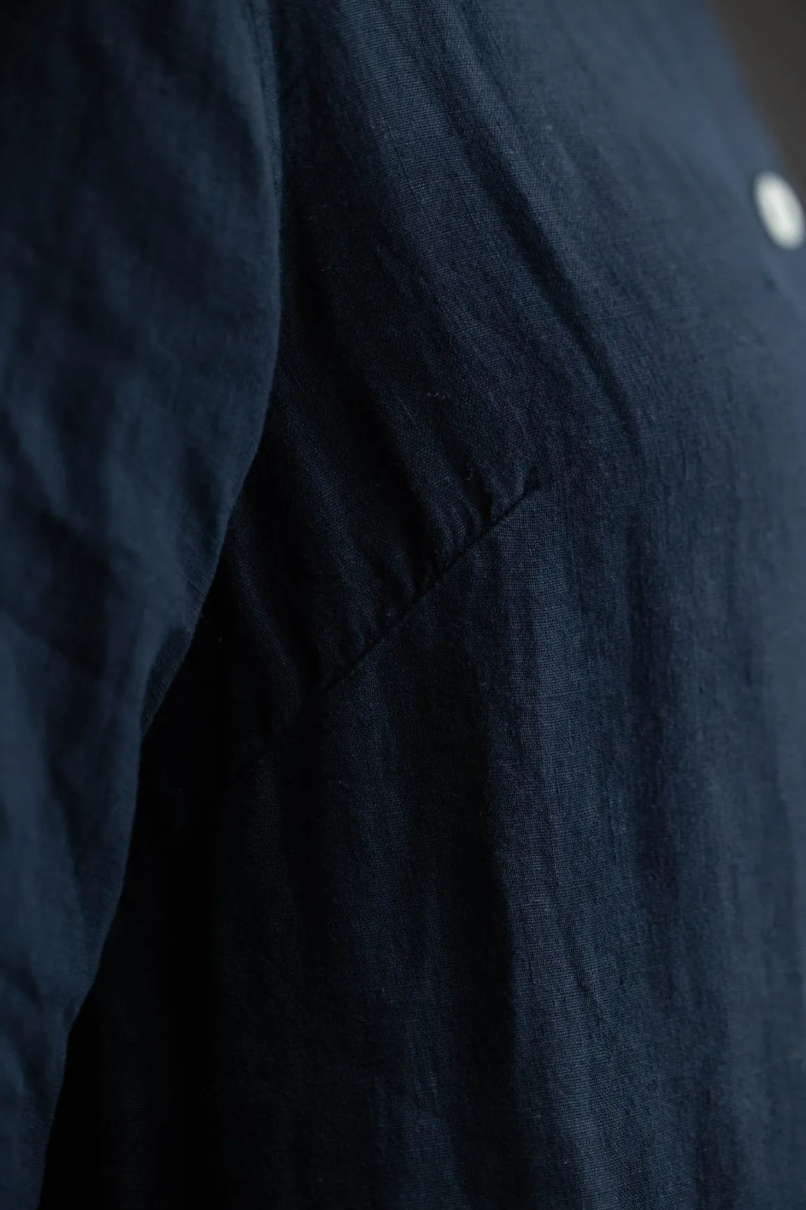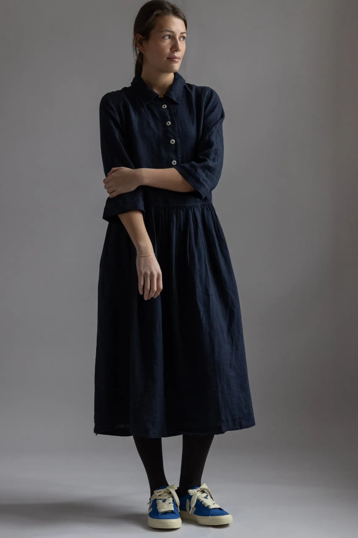 Toast Garment Dyed Linen er en avslappet skjortekjole laget av plaggfarget lin. Den har en lett innsvingning i midjen med folder som faller ned i et fyldig skjørt. Kjolen er utstyrt med sidelommer og knapper i corozo som gir en naturlig finish. Indigo-fargen gir et vakkert og tidløst uttrykk.