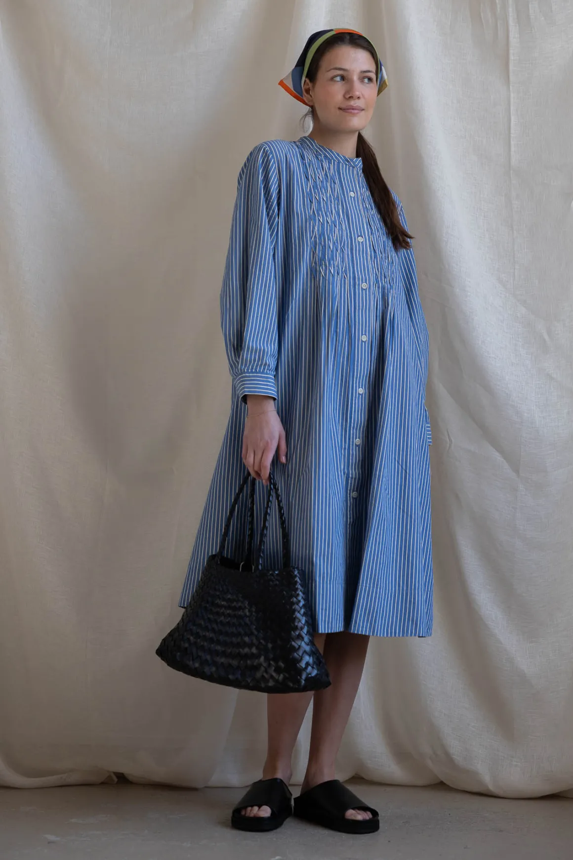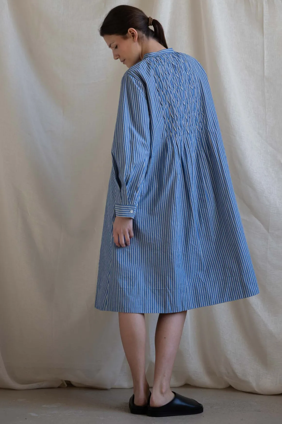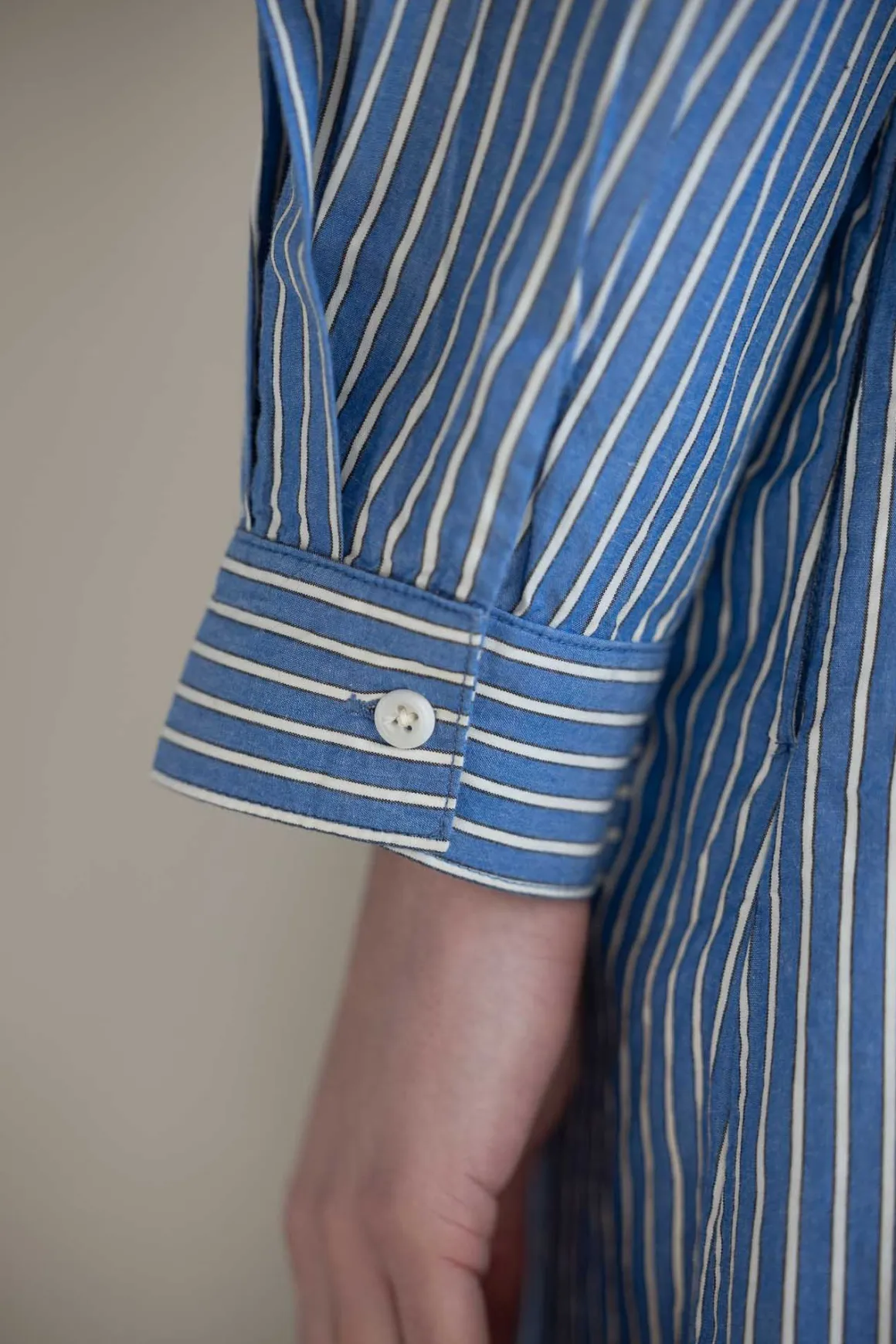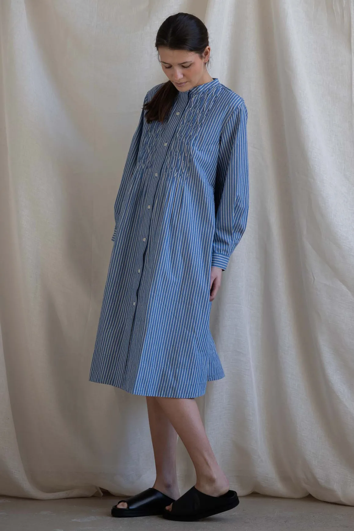 Pintuck Dash Stripe Cotton Dress er en luftig bomullskjole i stripet blå fra TOAST. Kjolen kombinerer et avslappet snitt med fine detaljer. Smale pintucks pryder for- og bakstykket, noe som gir en myk volumfølelse og en lett, svingende silhuett. Den stående kragen og knappestolpen med knapper av corozo tilfører et tidløst preg, mens diskré sidelommer gjør kjolen både praktisk og anvendelig.