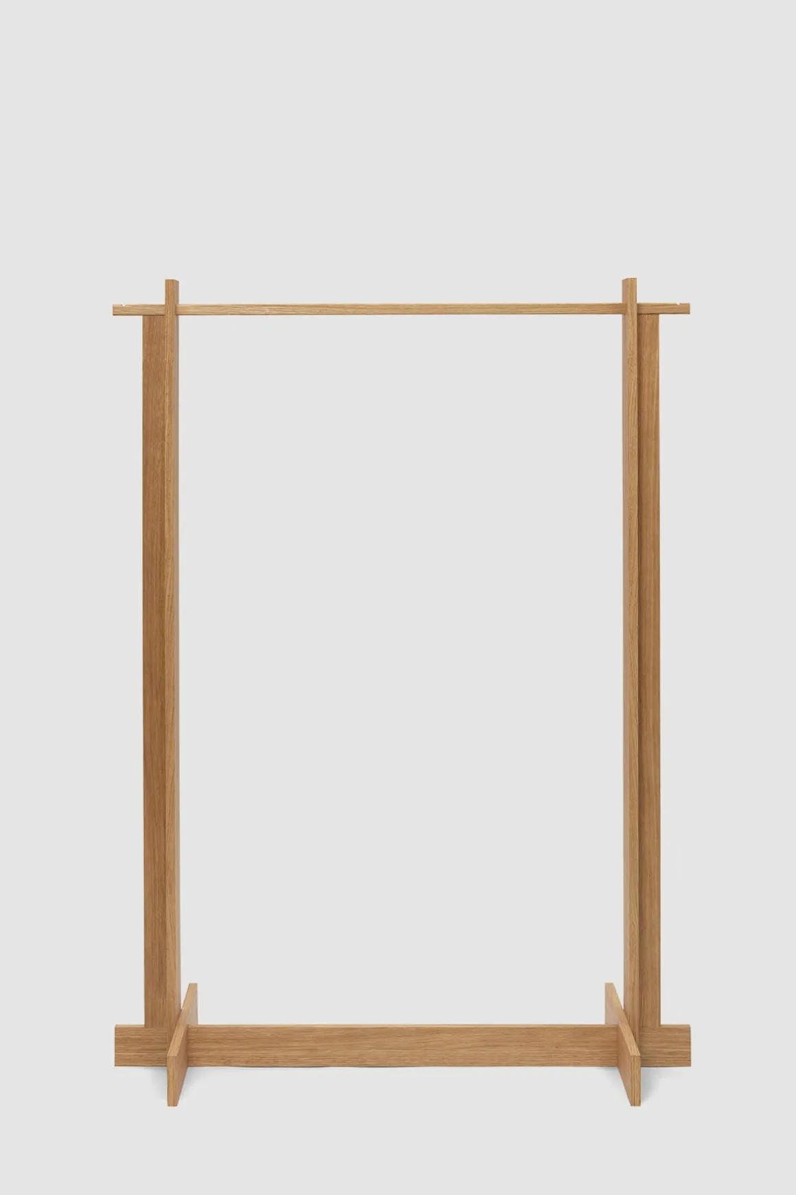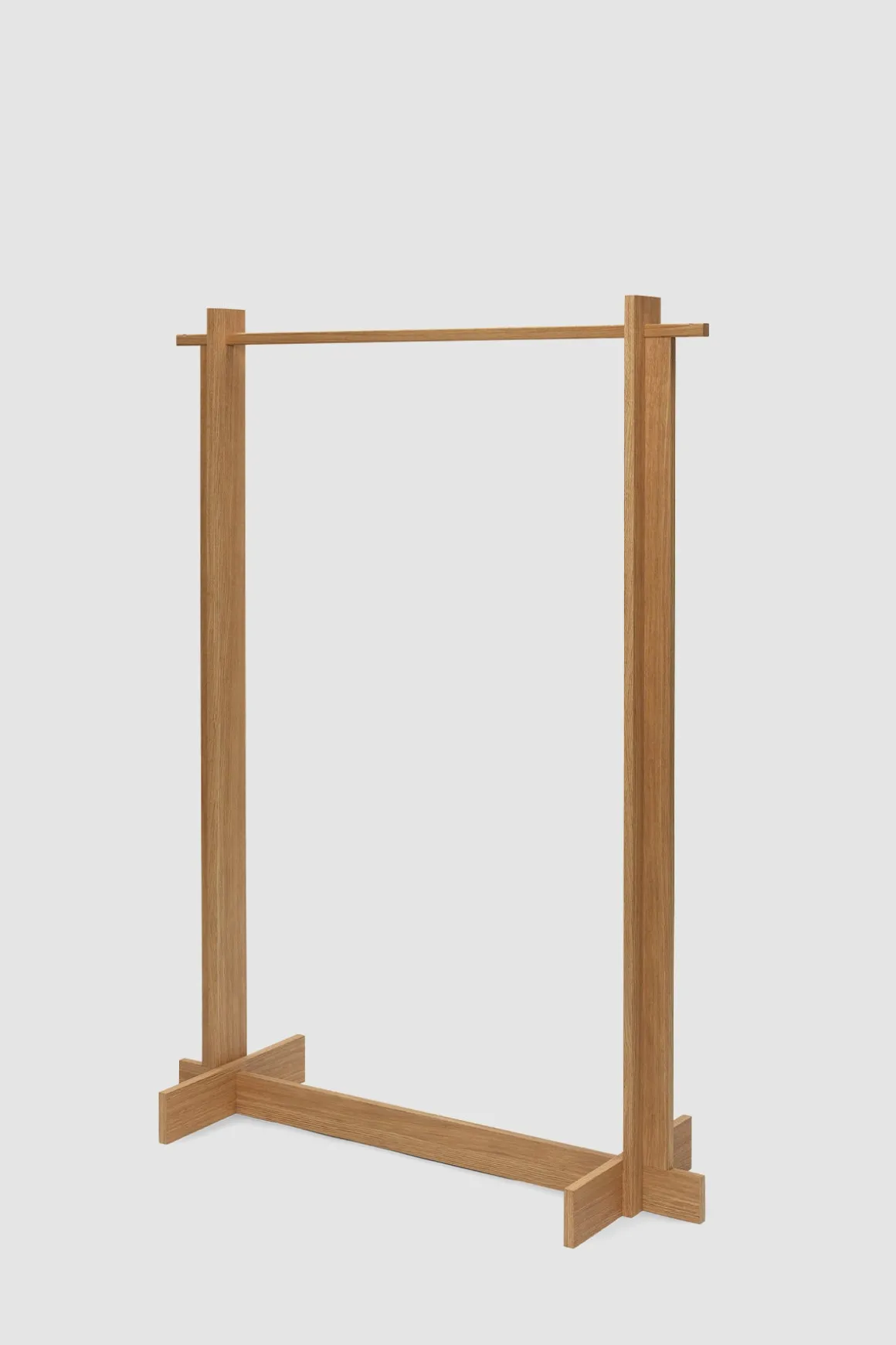 Bridge klesstativ fra Ferm Living er inspirert av arkitektoniske trekonstruksjoner og har en enkel silhuett med rene linjer. Intrikate detaljer og vakkert håndverk gjør denne til et stilig stativ som sømløst kombinerer funksjonalitet og eleganse. Klesstativet er laget av FSC™-sertifisert eikefinèr med MDF-kjerne. Bruk det i gangen, på soverommet eller barnerommet.