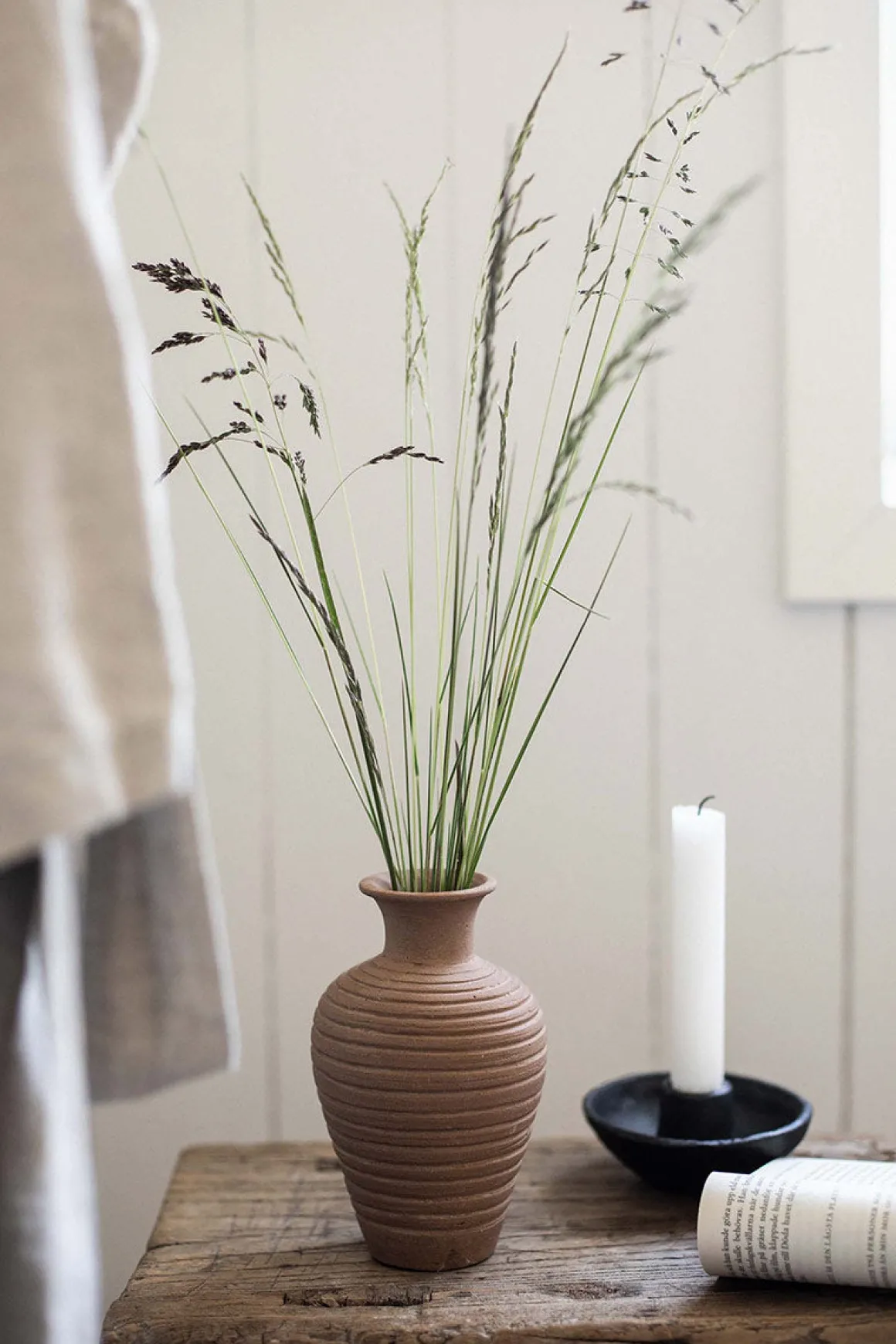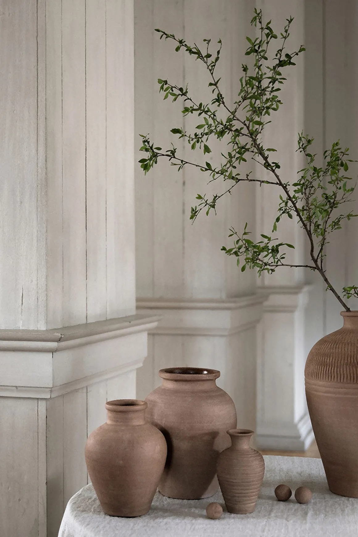 Taktil, håndlaget terracotta-krukke fra svenske Tell Me More. Terracina er en dekorativ krukke i 100% leire og er laget etter gamle tradisjoner. Krukken dreies for hånd, noe som gjør hvert produkt unikt i karakter. Farge og form kan derfor avvike fra bildet. Terracina krukken er i en vakker brent tone og kan brukes som dekorasjon i alle hjemmets rom så vel som utendørs. Hvis du plasserer krukken utendørs, anbefaler vi å ikke plassere den på sensitive overflater da keramiske produkter kan slippe gjennom fuktighet og sette merker. Terrakotta-krukken er fin alene, men er også vakker å kombinere med andre størrelser i Terracina-serien.