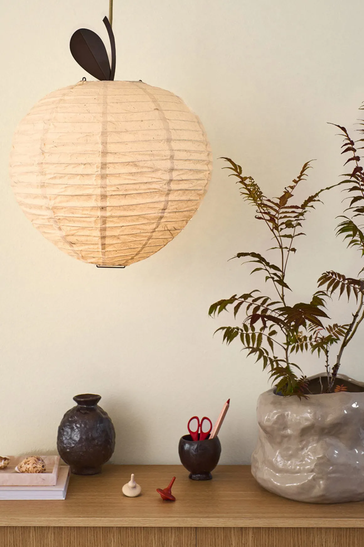 Apple lampeskjerm fra Ferm Living. Lampeskjermen er en sjarmerende formet som et eple, laget av teksturert Washi-papir som gir et mykt og behagelig lys. Lampeskjermen skaper en koselig og innbydende atmosfære, perfekt for barnerommet. Den unike detaljen med et metallblad på toppen tilfører en leken og naturlig touch til designet. Uansett hvor du plasser Apple-lampeskjermen vil den bli et morsomt og dekorativt element som gleder både barn og voksne.