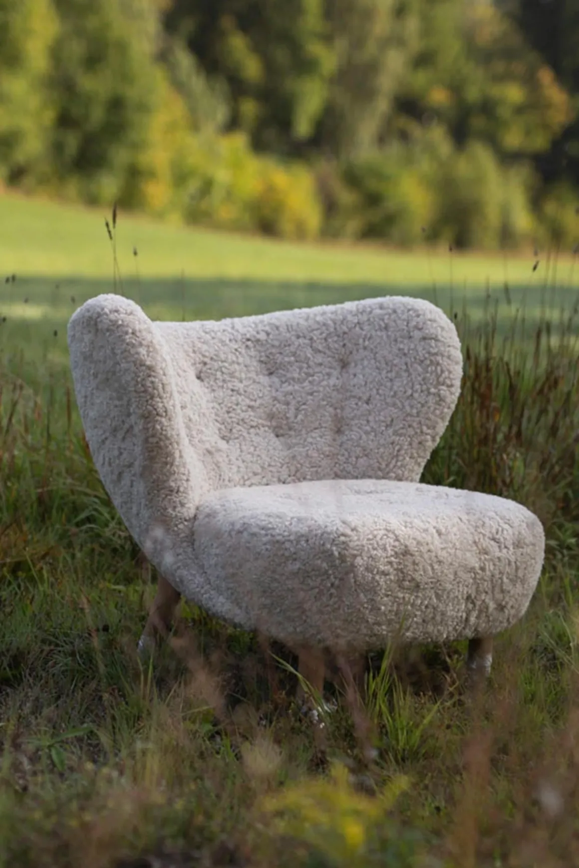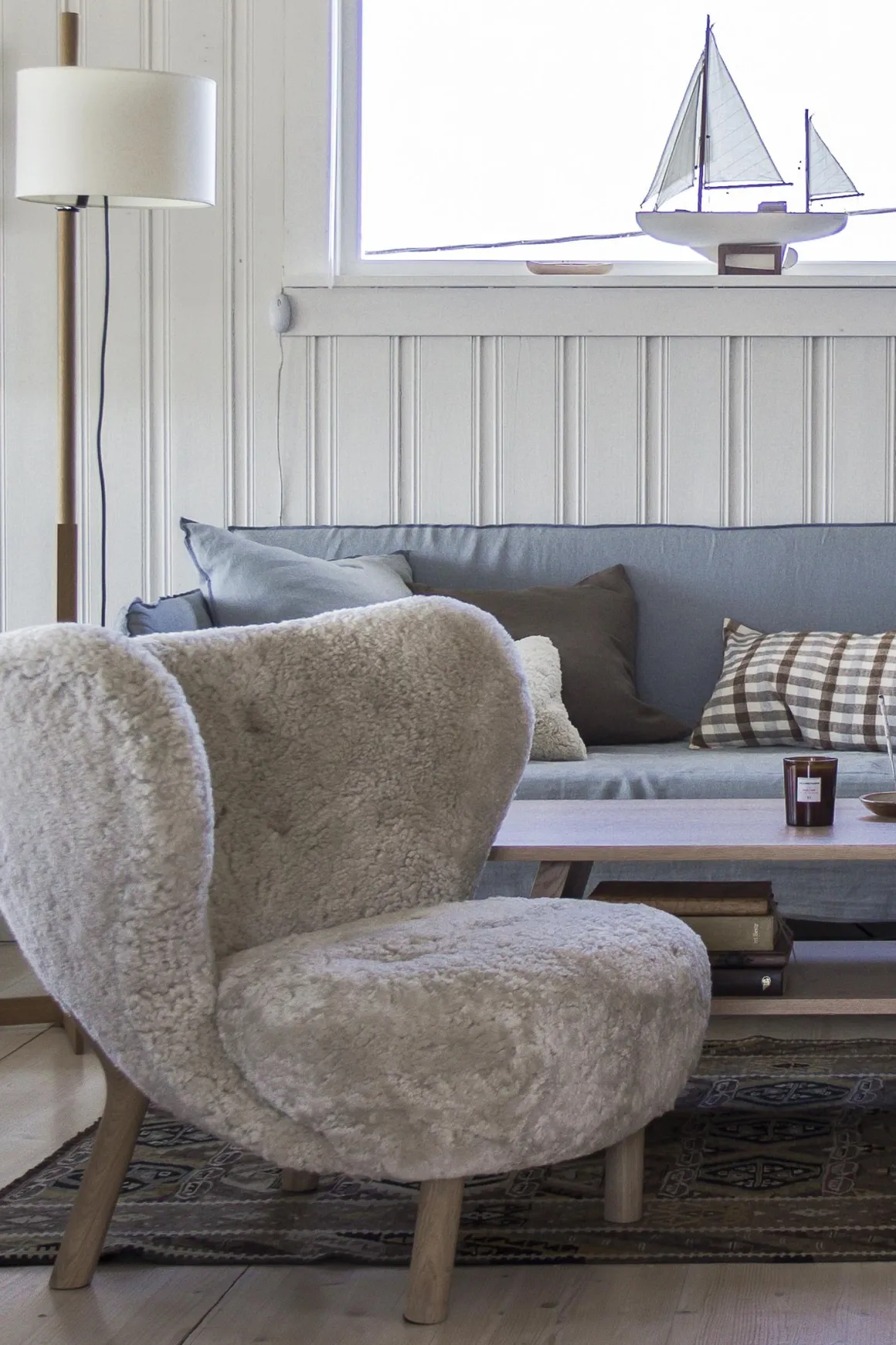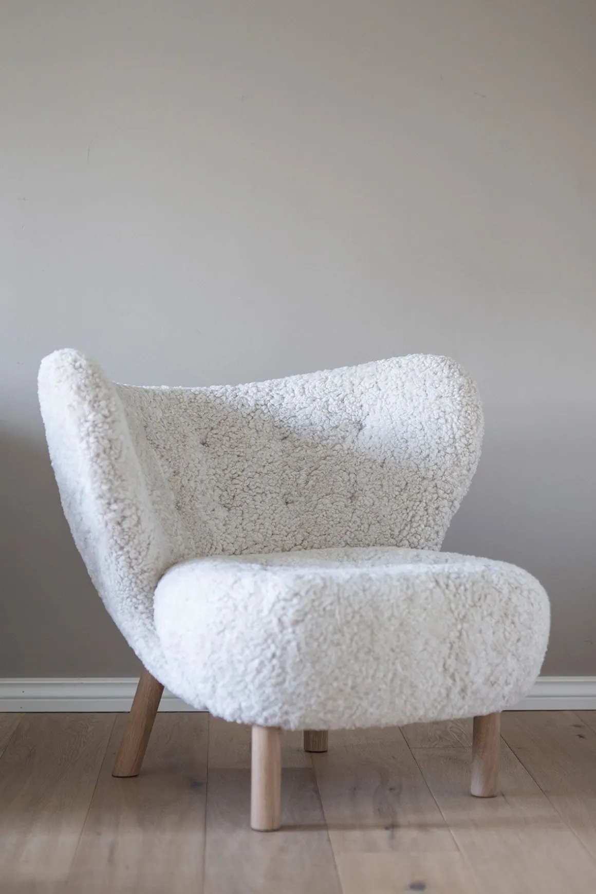 Little Petra Stol fra u0026amp;Tradition, designet av arkitekten Viggo Boesen i 1938. Little Petra ble øyeblikkelig en slager da den ble introdusert i 1938 på Copenhagen Cabinetmakers Guild Exhibition. Stolen er sterkt assosiert med starten på den danske funkis-stilen, og er en av få designs fra Boesen. Little Petra er overraskende allsidig og er i stand til å passe inn i alle slags rom, interiørstiler og miljøer. Denne versjonen har trekk i lyst saueskinn med ben av lys eik. En designklassiker som holder seg like moderne år etter år.