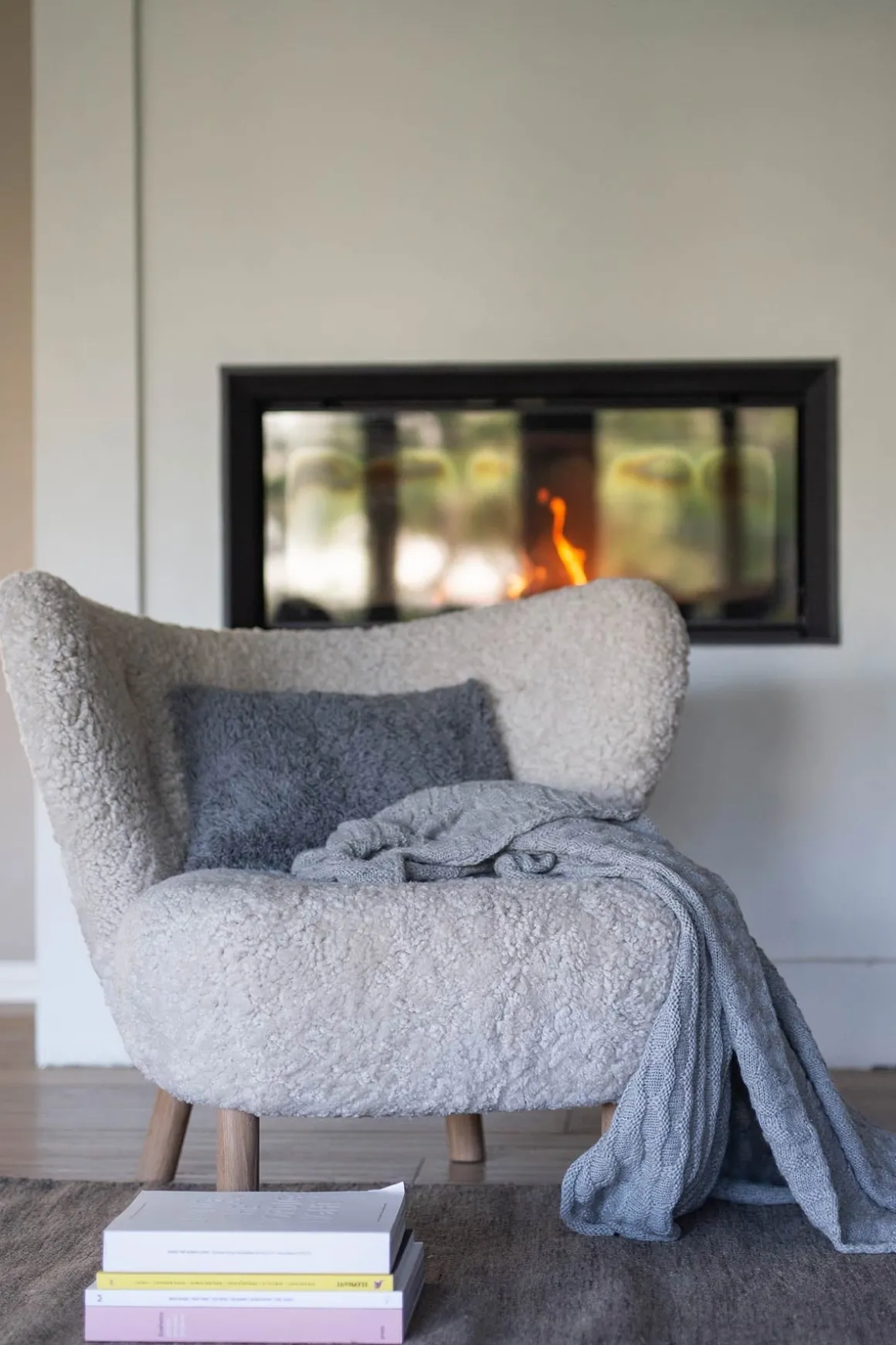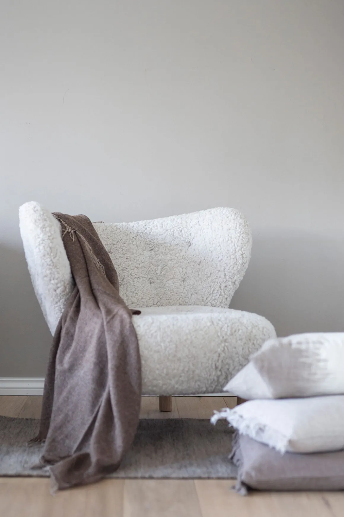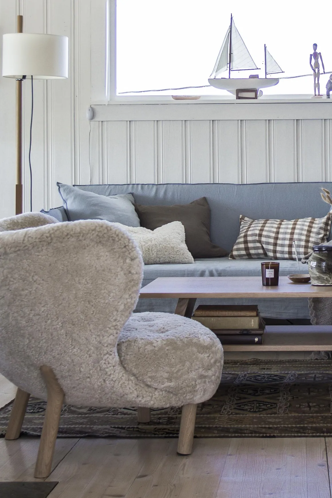 Little Petra Stol fra u0026amp;Tradition, designet av arkitekten Viggo Boesen i 1938. Little Petra ble øyeblikkelig en slager da den ble introdusert i 1938 på Copenhagen Cabinetmakers Guild Exhibition. Stolen er sterkt assosiert med starten på den danske funkis-stilen, og er en av få designs fra Boesen. Little Petra er overraskende allsidig og er i stand til å passe inn i alle slags rom, interiørstiler og miljøer. Denne versjonen har trekk i lyst saueskinn med ben av lys eik. En designklassiker som holder seg like moderne år etter år.