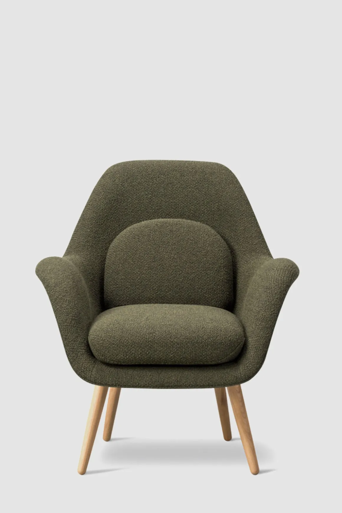 Swoon Petite 1774 lenestol fra Fredericia med base av oljet eik. Utført i det eksklusive stoffet Carlotto 900, et slitesterkt og mykt tekstil i mørkegrønn ullblanding med himmelsk bouclé tekstur. Med det enestående trekket som smelter sammen armlenene, setet og ryggen, i tillegg til støttende, myke puter, har du en moderne og skulpturell stol som passer i alle hjem. Swoon Lounge Petit er en nettere og hakket mer oppreist versjon av sin ikoniske forgjenger Swoon Lounge. Petite versjonen inviterer til total avslapning med sitt imøtekommende design og optimale sittekomfort med god ryggstøtte. Dette er en skandinavisk klassiker du vil få glede av i mange år fremover. I tillegg til diverse tekstiler kan du velge mellom base i flere materialer og stiler. Kom gjerne innom Bolina på Stabekk, hvor vi står klare med tekstilprøver og kan hjelpe deg med å designe din helt egen ‘drømme Swoon’.