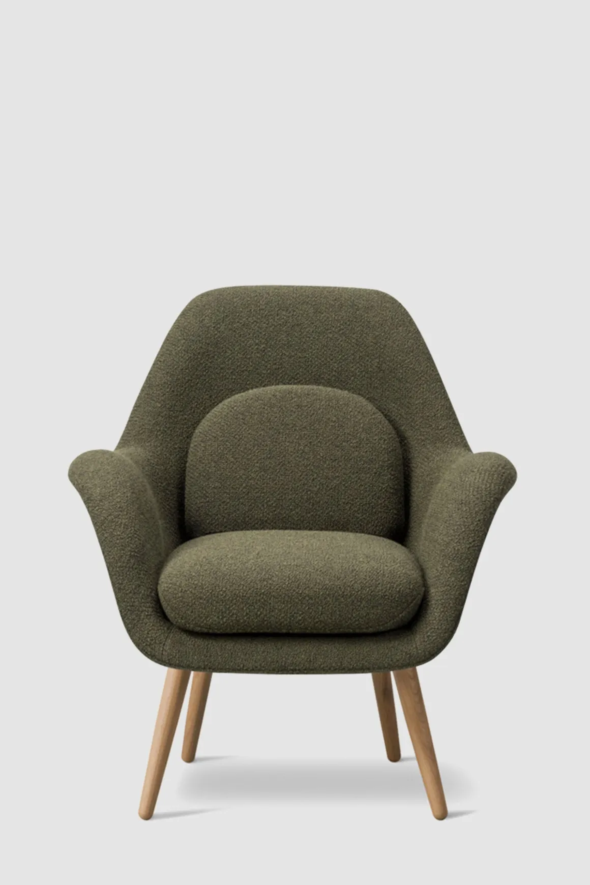 Swoon Petite 1774 lenestol fra Fredericia med base av valnøtt. Utført i det eksklusive stoffet Carlotto 900, et slitesterkt og ultramykt tekstil i mørkegrønn ullblanding med himmelsk bouclé tekstur. Med det enestående trekket som smelter sammen armlenene, setet og ryggen, i tillegg til støttende, myke puter, har du en moderne og skulpturell stol som passer i alle hjem. Swoon Lounge Petit er en nettere og hakket mer oppreist versjon av sin ikoniske forgjenger Swoon Lounge. Petite versjonen inviterer til total avslapning med sitt imøtekommende design og optimale sittekomfort med god ryggstøtte. Dette er en skandinavisk klassiker du vil få glede av i mange år fremover. I tillegg til diverse tekstiler kan du velge mellom base i flere materialer og stiler. Kom gjerne innom Bolina på Stabekk, hvor vi står klare med tekstilprøver og kan hjelpe deg med å designe din helt egen ‘drømme Swoon’.