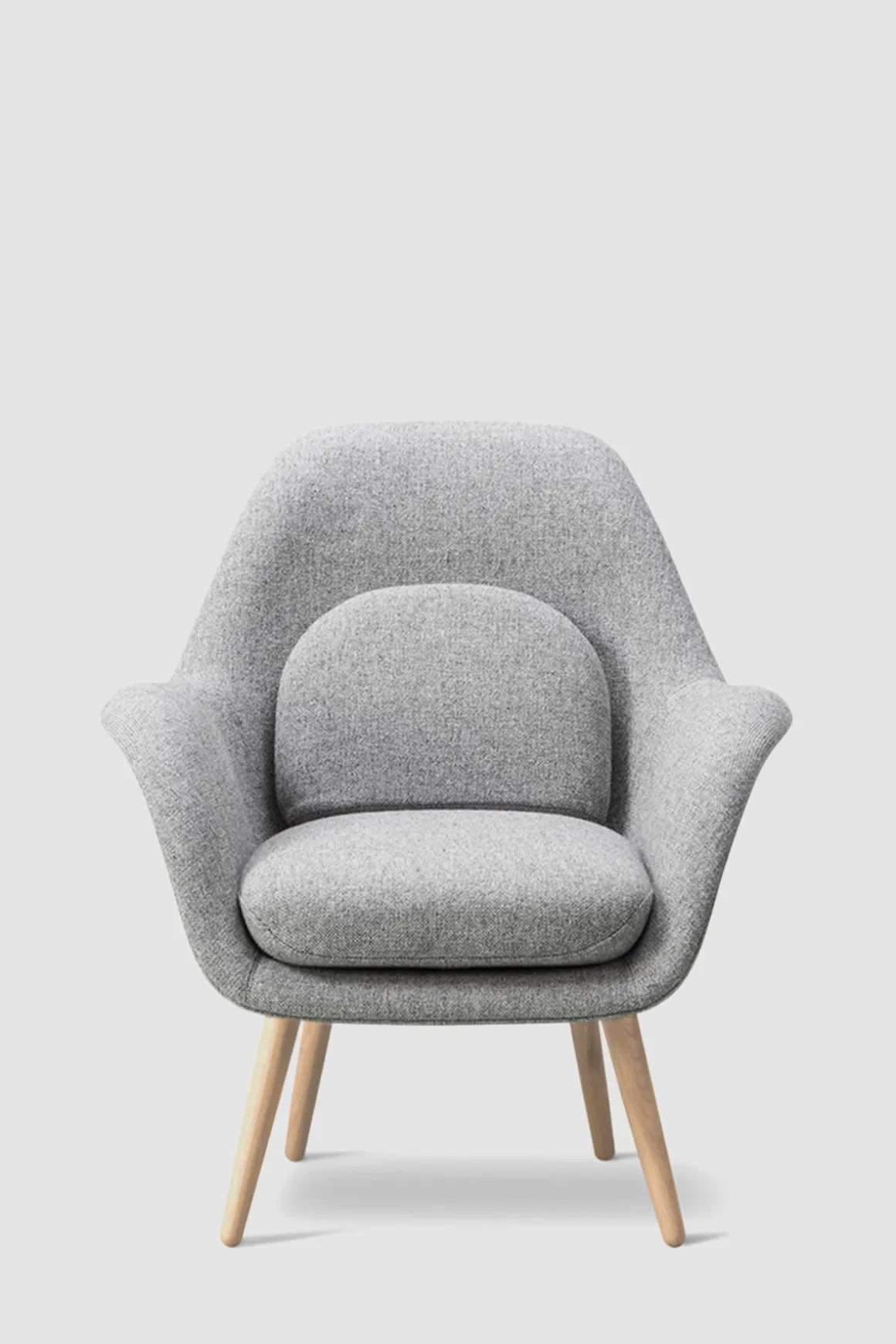 Swoon Petite 1774 lenestol fra Fredericia med base i såpet eik. Utført i det eksklusive stoffet Hallingdal 130, et slitesterkt stoff i lysegrå ull- og viskoseblanding. Stoffet har rik tekstur med god holdbarhet og fleksibilitet. Med det enestående trekket som smelter sammen armlenene, setet og ryggen, i tillegg til støttende, myke puter, har du en moderne og skulpturell stol som passer i alle hjem. Swoon Lounge Petit er en nettere og hakket mer oppreist versjon av sin ikoniske forgjenger Swoon Lounge. I tillegg til diverse tekstiler kan du velge mellom base i oljet eik, såpet eik, valnøtt, sort stål og krom. Kom gjerne innom Bolina på Stabekk, hvor vi står klare med tekstilprøver og kan hjelpe deg med å designe din helt egen ‘drømme Swoon’.