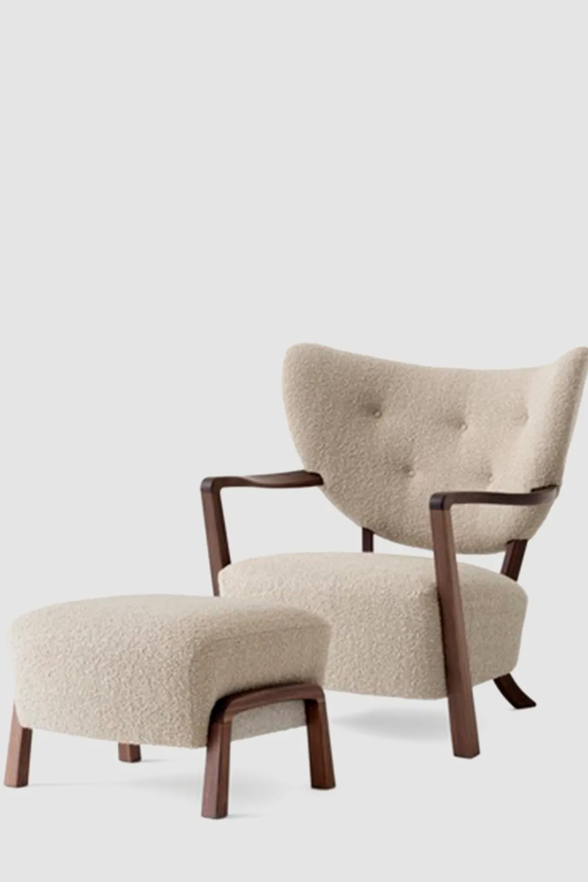 Finn roen med Wulff lenestol og puff fra u0026amp;Tradition. Wulff er en polstret loungestol som hyller de håndlagde designene fra 1930-tallet. Stolrammen er laget av massiv bøk og kryssfiner og deretter dekket med HR-skum og polyestervatt. Bena i heltre valnøtt er dreid, CNC-frest og oljet. Stolen har et luksuriøst, mykt trekk som dekker setet og ryggstøtten. Stolen er trukket i stoffet Karakorum; et boucléstoff med små løkker som kruser overflaten og tilfører bevegelse og personlighet. Wulff står for overlegent håndverk og enestående komfort. Loungestolens arkitektoniske form vil gi et stilig uttrykk til ethvert interiør og vil være et velkomment møbel i stua eller på soverommet. Den tilhørende puffen er håndlaget med ben av solid valnøtt og kommer i samme møbeltrekk som loungestolen. Bruk den enten som fotskammel til Wulff-stolen eller som en sjarmerende loungekrakk alene.