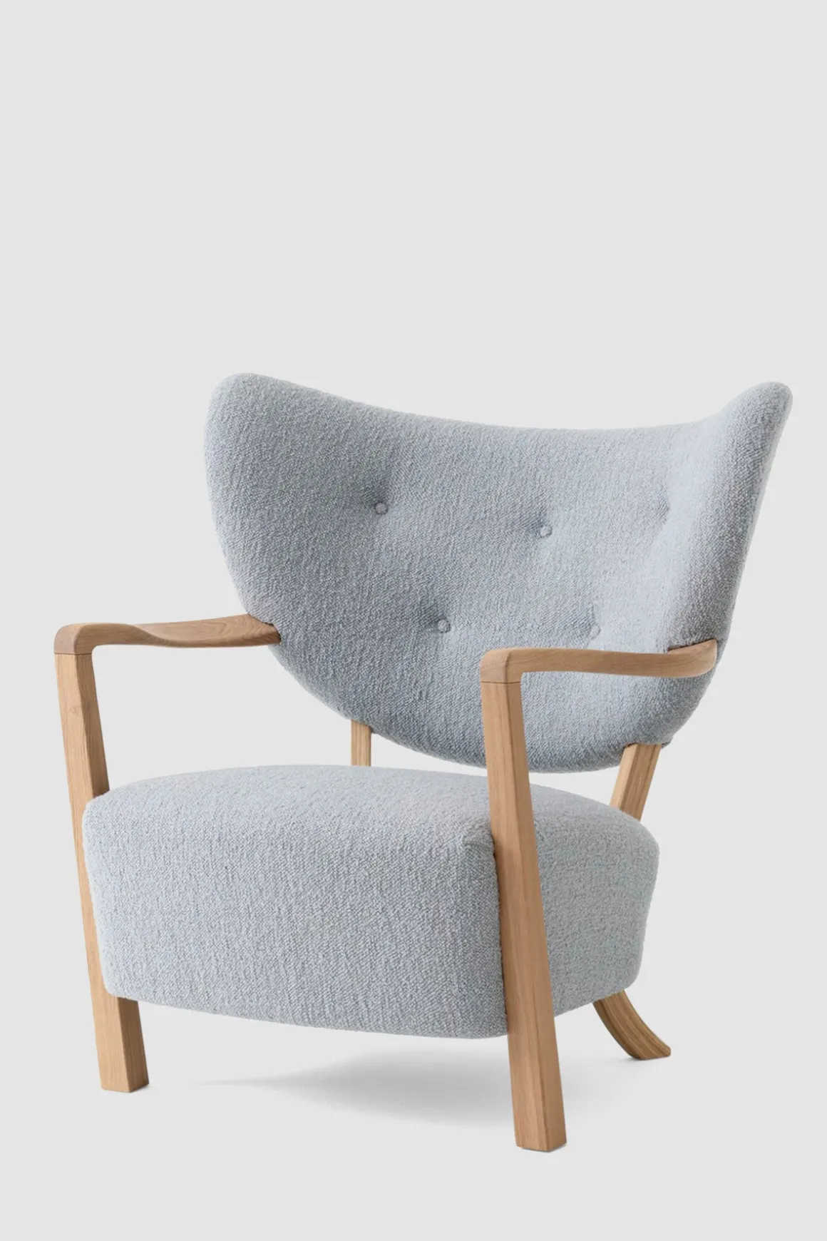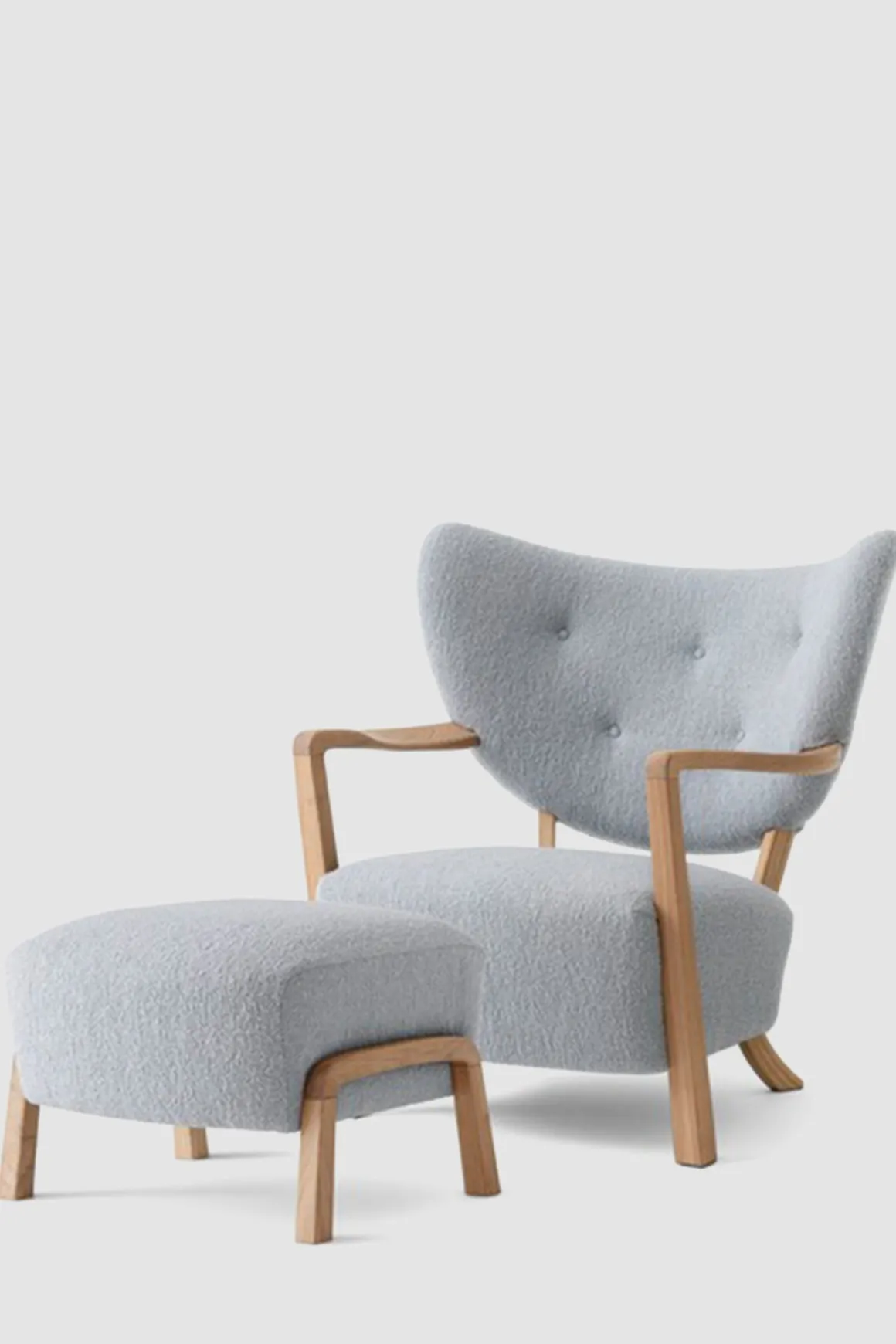 Finn roen med Wulff lenestol og puff fra u0026amp;Tradition. Wulff er en polstret loungestol som hyller de håndlagde designene fra 1930-tallet. Stolrammen er laget av massiv bøk og kryssfiner og deretter dekket med HR-skum og polyestervatt. Bena i heltre eik er dreid, CNC-frest og oljet. Stolen har et luksuriøst, mykt trekk som dekker setet og ryggstøtten. Stolen er trukket i stoffet Karandash; et tettvevd boucléstoff i ull og bomull, med en myk følelse og moderne personlighet. Karandash er en matt versjon av Karakorum, og stoffet egner seg til stoler som er beregnet for intensiv bruk. Wulff står for overlegent håndverk og enestående komfort. Loungestolens arkitektoniske form vil gi et stilig uttrykk til ethvert interiør og vil være et velkomment møbel i stua eller på soverommet. Den tilhørende puffen er håndlaget med ben av solid eik og kommer i samme møbeltrekk som loungestolen. Bruk den enten som fotskammel til Wulff-stolen eller som en sjarmerende loungekrakk alene.