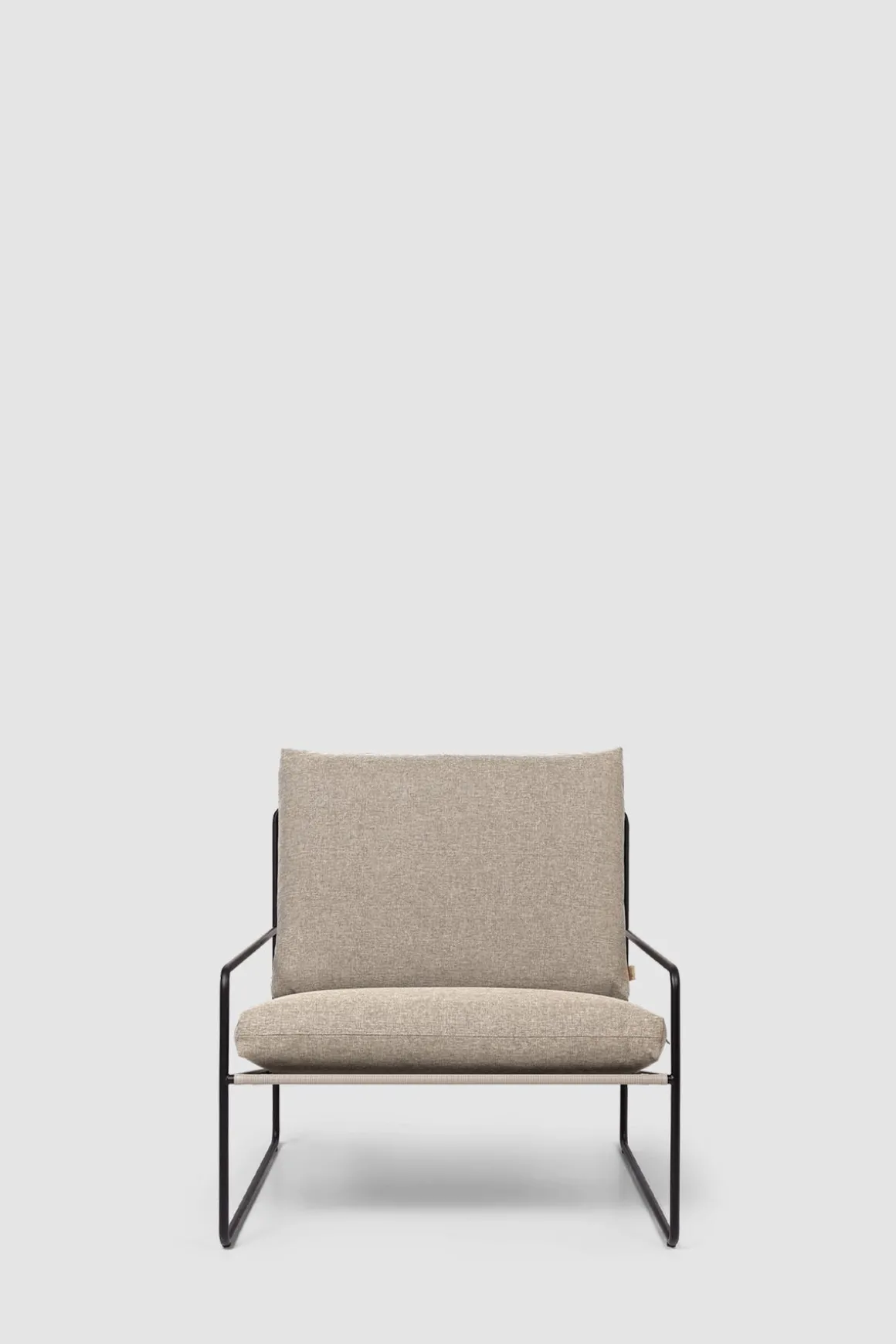 klassisk profil fra Ferm Living. Vår og sommer betyr avslapning og kvalitetstid tilbrakt utendørs. Kombiner gjerne stolen med 2 eller 3-seter sofa fra Desert-serien, og skap et innbydende salongområde hvor det er god plass til å sole seg, lese bøker og underholde venner og familie. Med det uforutsigbare været i tankene, er Desert Stolen designet for utendørs bruk og er komplettert med koselige sofaputer som er både vann- og UV-bestandige. Stolen kommer i et sandfarget trekk med sort ramme. Stilfull, minimalistisk og komfortabel.