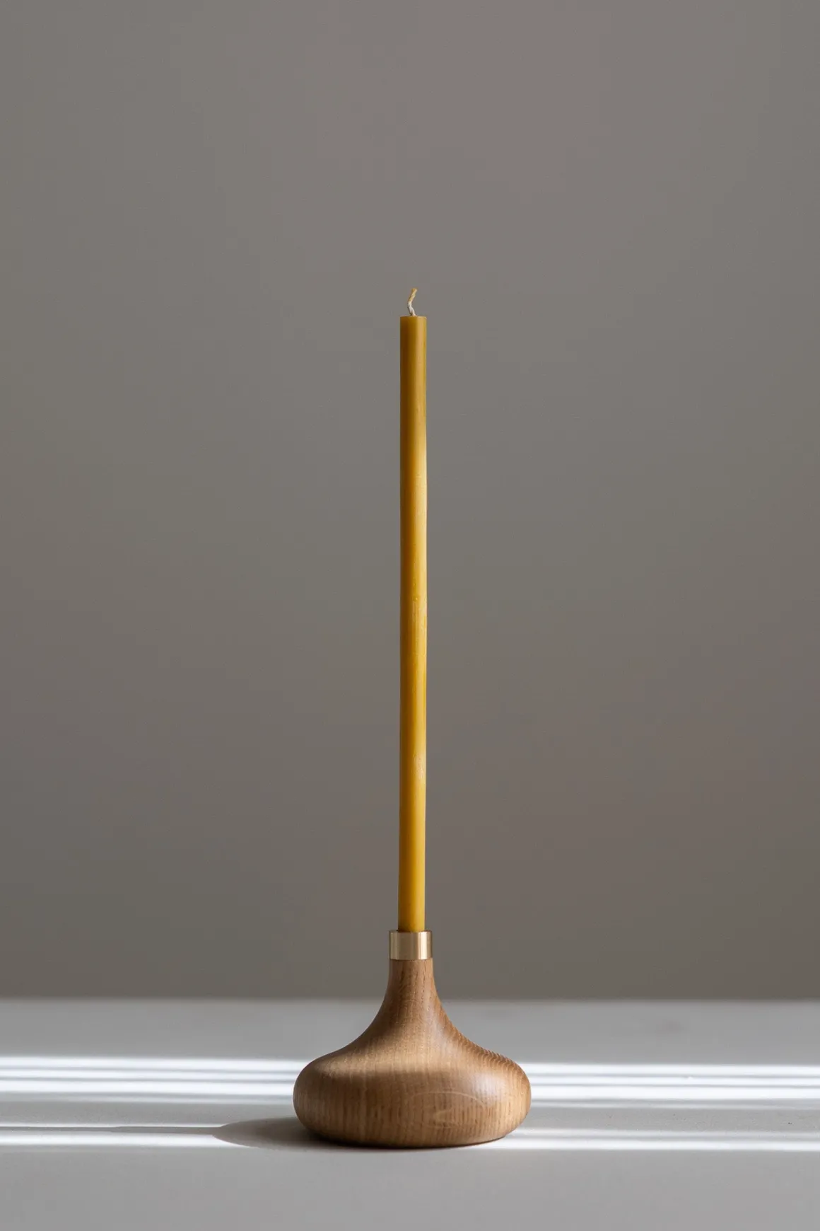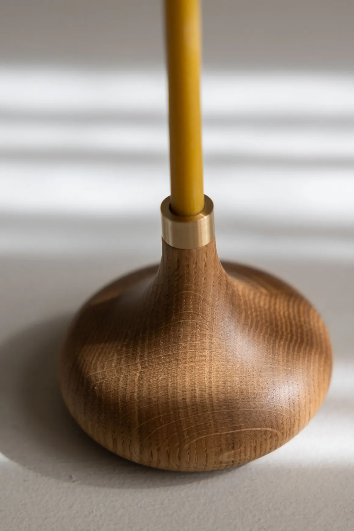 Lysestaken fra OVO Things er laget av oljet eik og har en liten messingdetalj som gir et diskret løft og spiller fint sammen med det varme treverket. Den dreies for hånd i Litauen av overskuddsmateriale fra møbelproduksjon, og hvert eksemplar vil ha sitt eget særpreg i farge og årringmønster. En liten, men solid stake som passer like godt på et dekket bord som i vinduskarmen. Passer perfekt til kertelysene fra samme merke.
